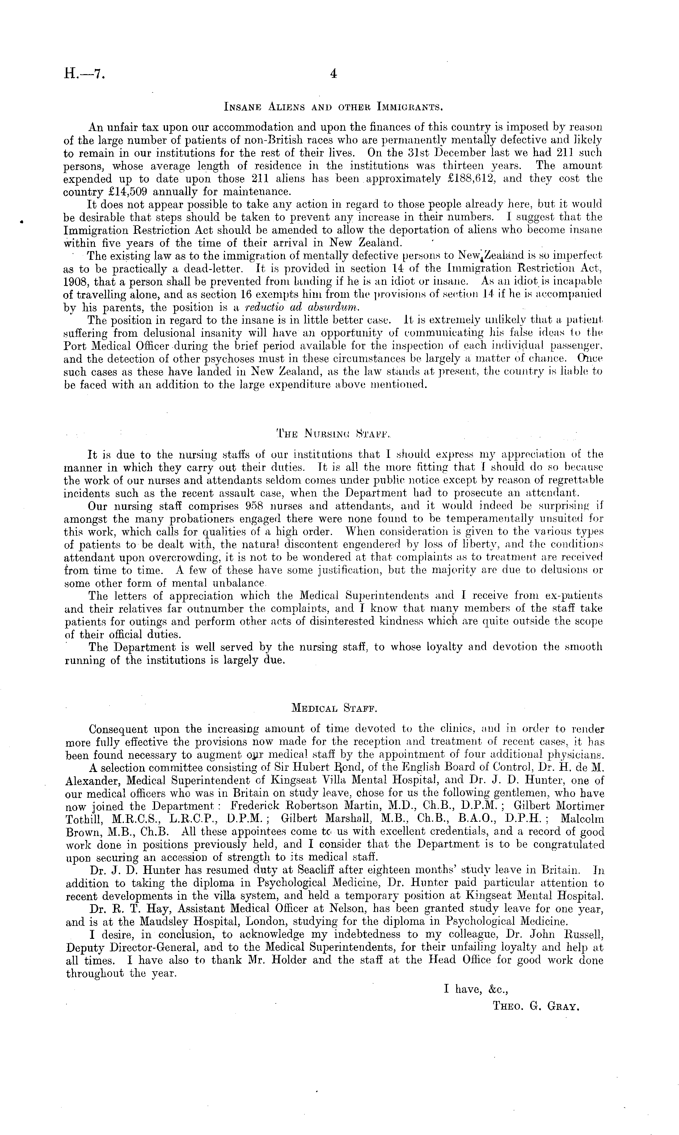 Insane Aliens and other Immigrants. An unfair tax upon our accommodation and upon the finances of this country is imposed by reason of the large number of patients of non-British races who are permanently mentally defective and likely to remain in our institutions for the rest of their lives. On the 31st December last we had 211 such persons, whose average length of residence in the institutions was thirteen years. The amount expended up to date upon those 211 aliens has been approximately £188,612, and they cost the country £14,509 annually for maintenance. It does not appear possible to take any action in regard to those people already here, but it would be desirable that steps should be taken to prevent any increase in their numbers. I suggest that the Immigration Restriction Act should be amended to allow the deportation of aliens who become insane within five years of the time of their arrival in New Zealand. The existing law as to the immigration of mentally defective persons to NeWjZealand is so imperfect as to be practically a dead-letter. It is provided in section 14 of the Immigration Restriction Act, 1908, that a person shall be prevented from landing if he is an idiot or insane. As an idiot is incapable of travelling alone, and as section 16 exempts him from the provisions of section 14 if he is accompanied by his parents, the position is a reductio ad absurdum.. The position in regard to the insane is in little better case. It is extremely unlikely that a patient suffering from delusional insanity will have an opportunity of communicating his false ideas to the Port Medical Officer during the brief period available for the inspection of each individual passenger, and the detection of other psychoses must in these circumstances be largely a matter of chance. Once such cases as these have landed in New Zealand, as the law stands at present, the country is liable to be faced with an addition to the large expenditure above mentioned. The Nursing Staff. It is due to the nursing staffs of our institutions that I should express my appreciation of the manner in which they carry out their duties. It is all the more fitting that I should do so because the work of our nurses and attendants seldom comes under public notice except by reason of regrettable incidents such as the recent assault case, when the Department had to prosecute an attendant. Our nursing staff comprises 958 nurses and attendants, and it would indeed be surprising if amongst the many probationers engaged there were none found to be temperamentally unsuited for this work, which calls for qualities of a high order. When consideration is given to the various types of patients to be dealt with, the natural discontent engendered by loss of liberty, and the conditions attendant upon overcrowding, it is not to be wondered at that complaints as to treatment are received from time to time. A few of these have some justification, but the majority are due to delusions or some other form of mental unbalance. The letters of appreciation which the Medical Superintendents and I receive from ex-patients and their relatives far outnumber the complaints, and I know that many members of the staff take patients for outings and perform other acts of disinterested kindness which are quite outside the scope of their official duties. The Department is well served by the nursing staff, to whose loyalty and devotion the smooth running of the institutions is largely due. Medical Staff. Consequent upon the increasing amount of time devoted to the clinics, and in order to render more fully effective the provisions now made for the reception and treatment of recent cases, it has been found necessary to augment ojnr medical staff by the appointment of four additional physicians. A selection committee consisting of Sir Hubert Bond, of the English Board of Control, Dr. H. de M. Alexander, Medical Superintendent of Kingseat Villa Mental Hospital, and Dr. J. D. Hunter, one of our medical officers who was in Britain on study leave, chose for us the following gentlemen, who have now joined the Department : Frederick Robertson Martin, M.D., Ch.B., D.P.M. ; Gilbert Mortimer Tothill, M.R.C.S., L.R.C.P., D.P.M.; Gilbert Marshall, M.8., Ch.B., 8.A.0., D.P.H. ; Malcolm Brown, M.8., Ch.B. All these appointees come tc us with excellent credentials, and a record of good work done in positions previously held, and I consider that the Department is to be congratulated upon securing an accession of strength to its medical staff. Dr. J. D. Hunter has resumed duty at Seacliff after eighteen months' study leave in Britain. In addition to taking the diploma in Psychological Medicine, Dr. Hunter paid particular attention to recent developments in the villa system, and held a temporary position at Kingseat Mental Hospital. Dr. R. T. Hay, Assistant Medical Officer at Nelson, has been granted study leave for one year, and is at the Maudsley Hospital, London, studying for the diploma in Psychological Medicine. I desire, in conclusion, to acknowledge my indebtedness to my colleague, Dr. John Russell, Deputy Director-General, and to the Medical Superintendents, for their unfailing loyalty and help at all times. I have also to thank Mr. Holder and the staff at the Head Office for good work done throughout the year. I have, &c., Theo. G. Gray.