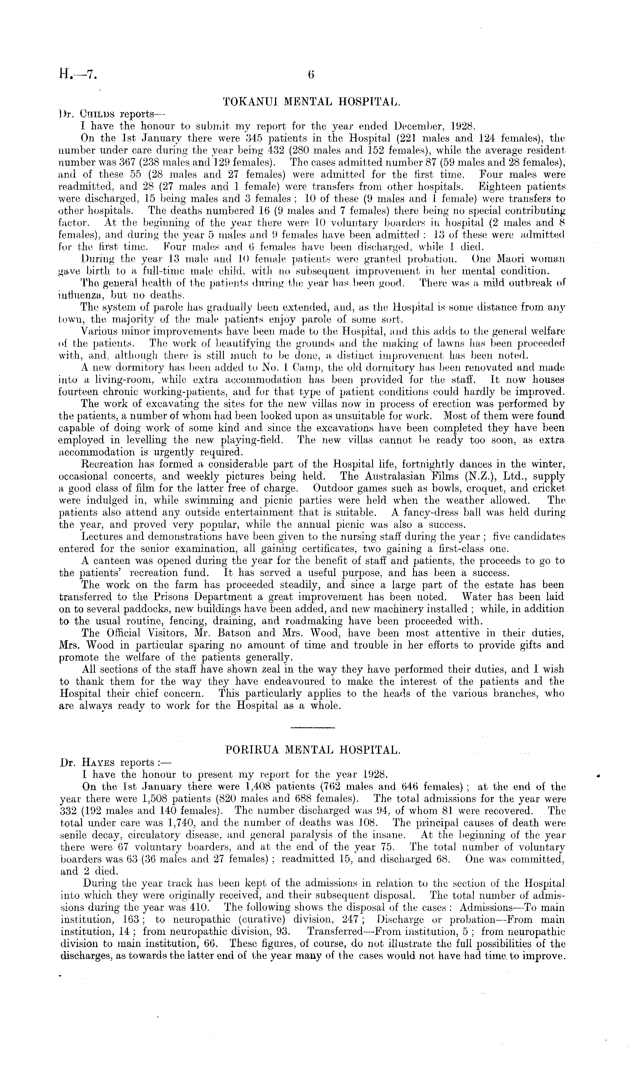TOKANUI MENTAL HOSPITAL. Dr. CJhilds reports — I have the honour to submit my report for the year ended December, 1928. On the Ist January there were 345 patients in the Hospital (221 males and 124 females), the number under care during the year being 432 (280 males and 152 females), while the average resident number was 367 (238 males and 129 females). The cases admitted number 87 (59 males and 28 females), and of these 55 (28 males and 27 females) were admitted for the first time. Four males were readmitted, and 28 (27 males and 1 female) were transfers from other hospitals. Eighteen patients were discharged, 15 being males and 3 females ; 10 of these (9 males and 1 female) were transfers to other hospitals. The deaths numbered 16 (9 males and 7 females) there being no special contributing factor. At the beginning of the year there were 10 voluntary boarders in hospital (2 males and 8 females), and during the year 5 males and 9 females have been admitted : 13 of these were admitted for the first time. Four males and 6 females have been discharged, while I died. During the year 13 male and 10 female patients were granted probation. One Maori woman gave birth to a full-time male child, with no subsequent improvement in her mental condition. The general health of the patients during the year has been good. There was a mild outbreak of influenza, * but no deaths. The system of parole has gradually been extended, and, as the Hospital is some distance from any town, the majority of the male patients enjoy parole of some sort. Various minor improvements have been made to the Hospital, and this adds to the general welfare of the patients. The work of beautifying the grounds and the making of lawns lias been proceeded with, and, although there is still much to be done, a distinct improvement has been noted. A new dormitory has been added to No. 1 Camp, the old dormitory has been renovated and made into a living-room, while extra accommodation has been provided for the staff. It now houses fourteen chronic working-patients, and for that type of patient conditions could hardly be improved. The work of excavating the sites for the new villas now in process of erection was performed by the patients, a number of whom had been looked upon as unsuitable for work. Most of them were found capable of doing work of some kind and since the excavations have been completed they have been employed in levelling the new playing-field. The new villas cannot be ready too soon, as extra accommodation is urgently required. Recreation has formed a considerable part of the Hospital life, fortnightly dances in the winter, occasional concerts, and weekly pictures being held. The Australasian Films (N.Z.), Ltd., supply a good class of film for the latter free of charge. Outdoor games such as bowls, croquet, and cricketwere indulged in, while swimming and picnic parties were held when the weather allowed. The patients also attend any outside entertainment that is suitable. A fancy-dress ball was held during the year, and proved very popular, while the annual picnic was also a success. Lectures and demonstrations have been given to the nursing staff during the year ; five candidates entered for the senior examination, all gaining certificates, two gaining a first-class one. A canteen was opened during the year for the benefit of staff and patients, the proceeds to go to the patients' recreation fund. It has served a useful purpose, and has been a success. The work on the farm has proceeded steadily, and since a large part of the estate has been transferred to the Prisons Department a great improvement has been noted. Water has been laid on to several paddocks, new buildings have been added, and new machinery installed ; while, in addition to the usual routine, fencing, draining, and roadmaking have been proceeded with. The Official Visitors, Mr. Batson and Mrs. Wood, have been most attentive in their duties, Mrs. Wood in particular sparing no amount of time and trouble in her efforts to provide gifts and promote the welfare of the patients generally. All sections of the staff have shown zeal in the way they have performed their duties, and I wish to thank them for the way they have endeavoured to make the interest of the patients and the Hospital their chief concern. This particularly applies to the heads of the various branches, who are always ready to work for the Hospital as a whole. PORIRUA MENTAL HOSPITAL. Dr. Hayes reports I have the honour to present my report for the year 1928. On the Ist January there were 1,408 patients (762 males and 646 females) ; at the end of the year there were 1,508 patients (820 males and 688 females). The total admissions for the year were 332 (192 males and 140 females). The number discharged was 94, of whom 81 were recovered. The total under care was 1,740, and the number of deaths was 108. The principal causes of death were senile decay, circulatory disease, and general paralysis of the insane. At the beginning of the year there were 67 voluntary boarders, and at the end of the year 75. The total number of voluntary boarders was 63 (36 males and 27 females) ; readmitted 15, and discharged 68. One was committed, and 2 died. During the year track has been kept of the admissions in relation to the section of the Hospital into which they were originally received, and their subsequent disposal. The total number of admissions during the year was 410. The following shows the disposal of the cases : Admissions—To main institution, 163; to neuropathic (curative) division, 247 ; Discharge or probation —From main institution, 14 ; from neuropathic division, 93. Transferred —From institution, 5 ; from neuropathic division to main institution, 66. These figures, of course, do not illustrate the full possibilities of the discharges, as towards the latter end of the year many of the cases would not have had timeto improve.