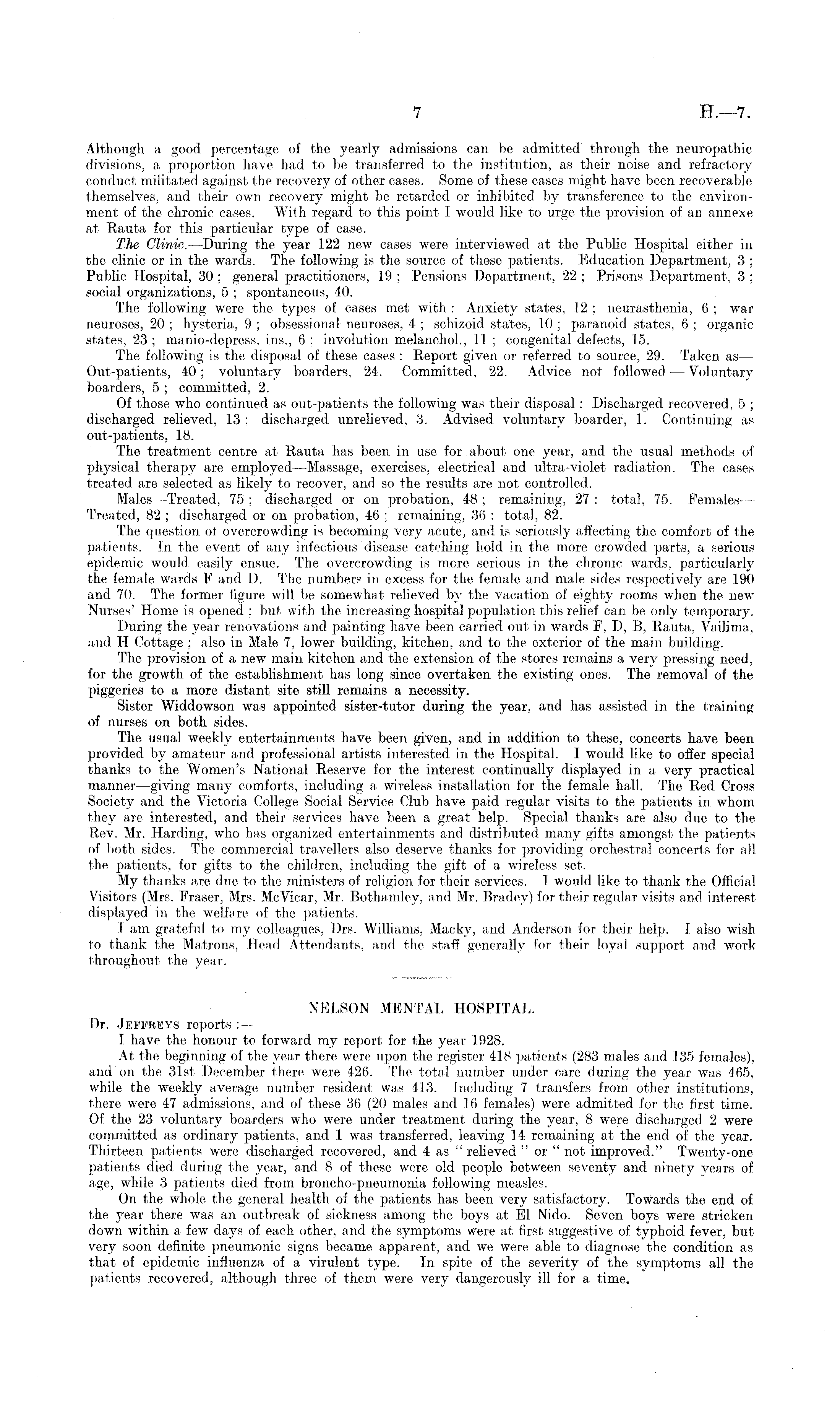 Although a good percentage of the yearly admissions can be admitted through the neuropathic divisions, a proportion have had to be transferred to the institution, as their noise and refractory conduct militated against the recovery of other cases. Some of these cases might have been recoverable themselves, and their own recovery might be retarded or inhibited by transference to the environment of the chronic cases. With regard to this point I would like to urge the provision of an annexe at Rauta for this particular type of case. The Clinic. —During the year 122 new cases were interviewed at the Public Hospital either in the clinic or in the wards. The following is the source of these patients. Education Department, 3 ; Public Hospital, 30 ; general practitioners, 19 ; Pensions Department, 22 ; Prisons Department, 3 ; social organizations, 5 ; spontaneous, 40. The following were the types of cases met with : Anxiety states, 12 ; neurasthenia, 6 ; war neuroses, 20 ; hysteria, 9 ; obsessional neuroses, 4 ; schizoid states, 10 ; paranoid states, 6 ; organic states, 23 ; manio-depress. ins., 6 ; involution melanchol., 11 ; congenital defects, 15. The following is the disposal of these cases : Report given or referred to source, 29. Taken as — Out-patients, 40; voluntary boarders, 24. Committed, 22. Advice not followed — Voluntary boarders, 5 ; committed, 2. Of those who continued as out-patients the following was their disposal : Discharged recovered, 5 ; discharged relieved, 13; discharged unrelieved, 3. Advised voluntary boarder, 1. Continuing as out-patients, 18. The treatment centre at Rauta has been in use for about one year, and the usual methods of physical therapy are employed—Massage, exercises, electrical and ultra-violet radiation. The cases treated are selected as likely to recover, and. so the results are not controlled. Males —Treated, 75 ; discharged or on probation, 48 ; remaining, 27 : total, 75. Females— Treated, 82 ; discharged or on probation, 46 : remaining, 36 : total, 82. The question ot overcrowding is becoming very acute, and is seriously affecting the comfort of the patients. In the event of any infectious disease catching hold in the more crowded parts, a serious epidemic would easily ensue. The overcrowding is more serious in the chronic wards, particularly the female wards F and D. The numbers in excess for the female and male sides respectively are 190 and 70. The former figure will be somewhat relieved by the vacation of eighty rooms when the new Nurses' Home is opened ; but with the increasing hospital population this relief can be only temporary. During the year renovations and painting have been carried out in wards F, D, B, Rauta. Vailima, and H Cottage ; also in Male 7, lower building, kitchen, and to the exterior of the main building. The provision of a new main kitchen and the extension of the stores remains a very pressing need, for the growth of the establishment has long since overtaken the existing ones. The removal of the piggeries to a more distant site still remains a necessity. Sister Widdowson was appointed sister-tutor during the year, and has assisted in the training of nurses on both sides. The usual weekly entertainments have been given, and in addition to these, concerts have been provided by amateur and professional artists interested in the Hospital. I would like to offer special thanks to the Women's National Reserve for the interest continually displayed in a very practical manner —giving many comforts, including a wireless installation for the female hall. The Red Cross Society and the Victoria. College Social Service Club have paid regular visits to the patients in whom they are interested, and their services have been a great help. Special thanks are also due to the Rev. Mr. Harding, who has organized entertainments and distributed many gifts amongst the patients of both sides. The commercial travellers also deserve thanks for providing orchestral concerts for all the patients, for gifts to the children, including the gift of a wireless set. My thanks are due to the ministers of religion for their services. I would like to thank the Official Visitors (Mrs. Eraser, Mrs. McVicar, Mr. Bothamley, and Mr. Bradey) for their regular visits and interest displayed in the welfare of the patients. lam grateful to my colleagues, Drs. Williams, Macky, and Anderson for their help. 1 also wish to thank the Matrons, Head Attendants, and the staff generally for their loyal support and work throughout the year. NELSON MENTAL HOSPITAL. Dr. Jeffreys reports :— I have the honour to forward my report for the year 1928. At the beginning of the year there were upon the register 418 patients (283 males and 135 females), and on the ,31st December there were 426. The total number under care during the year was 465, while the weekly average number resident was 413. Including 7 transfers from other institutions, there were 47 admissions, and of these 36 (20 males and 16 females) were admitted for the first time. Of the 23 voluntary boarders who were under treatment during the year, 8 were discharged 2 were committed as ordinary patients, and 1 was transferred, leaving 14 remaining at the end of the year. Thirteen patients were discharged recovered, and 4as " relieved " or " not improved." Twenty-one patients died during the year, and 8 of these were old people between seventy and ninety years of age, while 3 patients died from broncho-pneumonia following measles. On the whole the general health of the patients has been very satisfactory. Towards the end of the year there was an outbreak of sickness among the boys at El Nido. Seven boys were stricken down within a few days of each other, and the symptoms were at first suggestive of typhoid fever, but very soon definite pneumonic signs became apparent, and we were able to diagnose the condition as that of epidemic influenza of a virulent type. In spite of the severity of the symptoms all the patien
