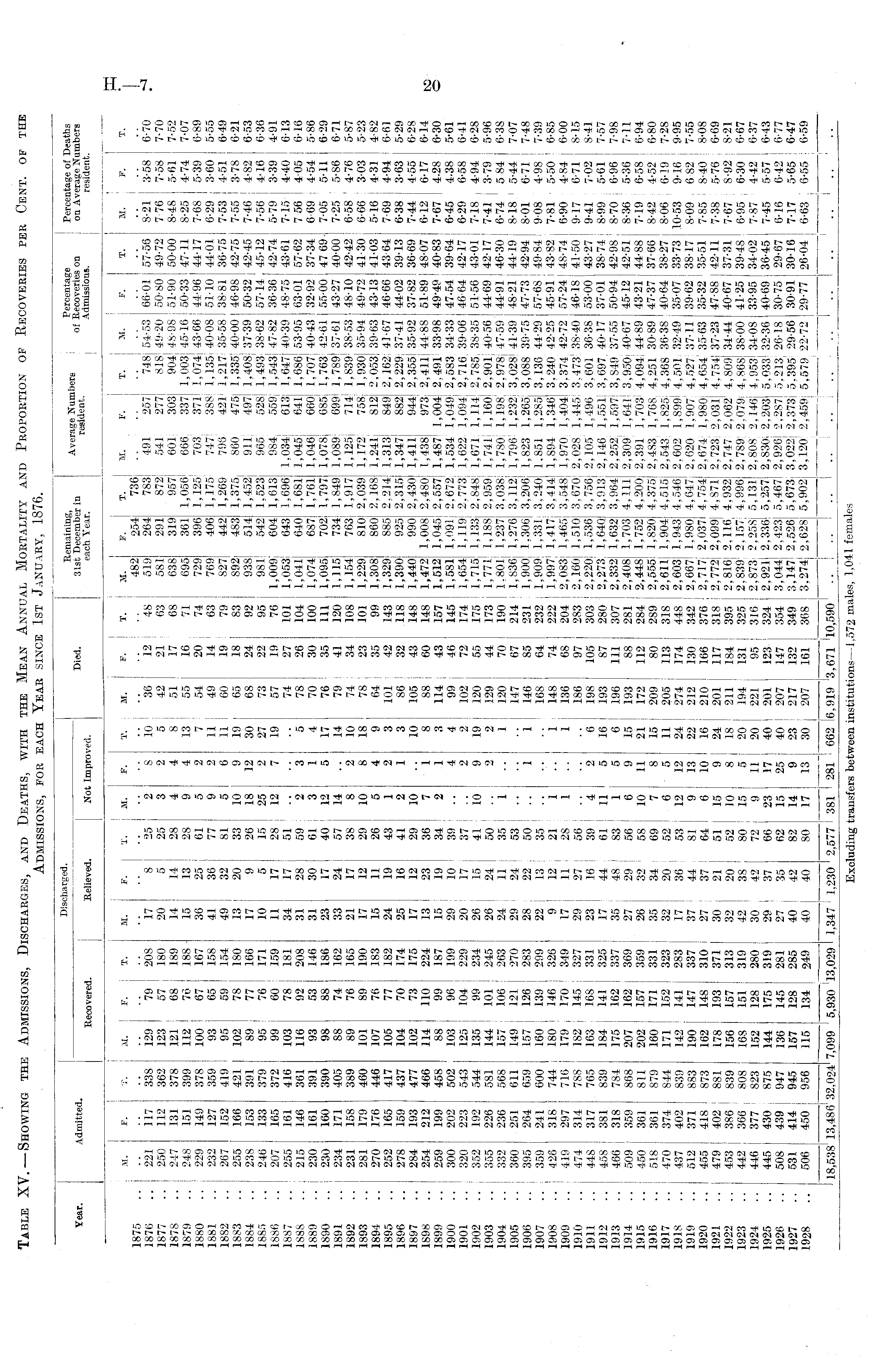 Table XV.-Showing the Admissions, Discharges, and Deaths, with the Mean Annual Mortality and Proportion of Recoveries per Cent. of the Admissions, for each Year since 1st January, 1876.