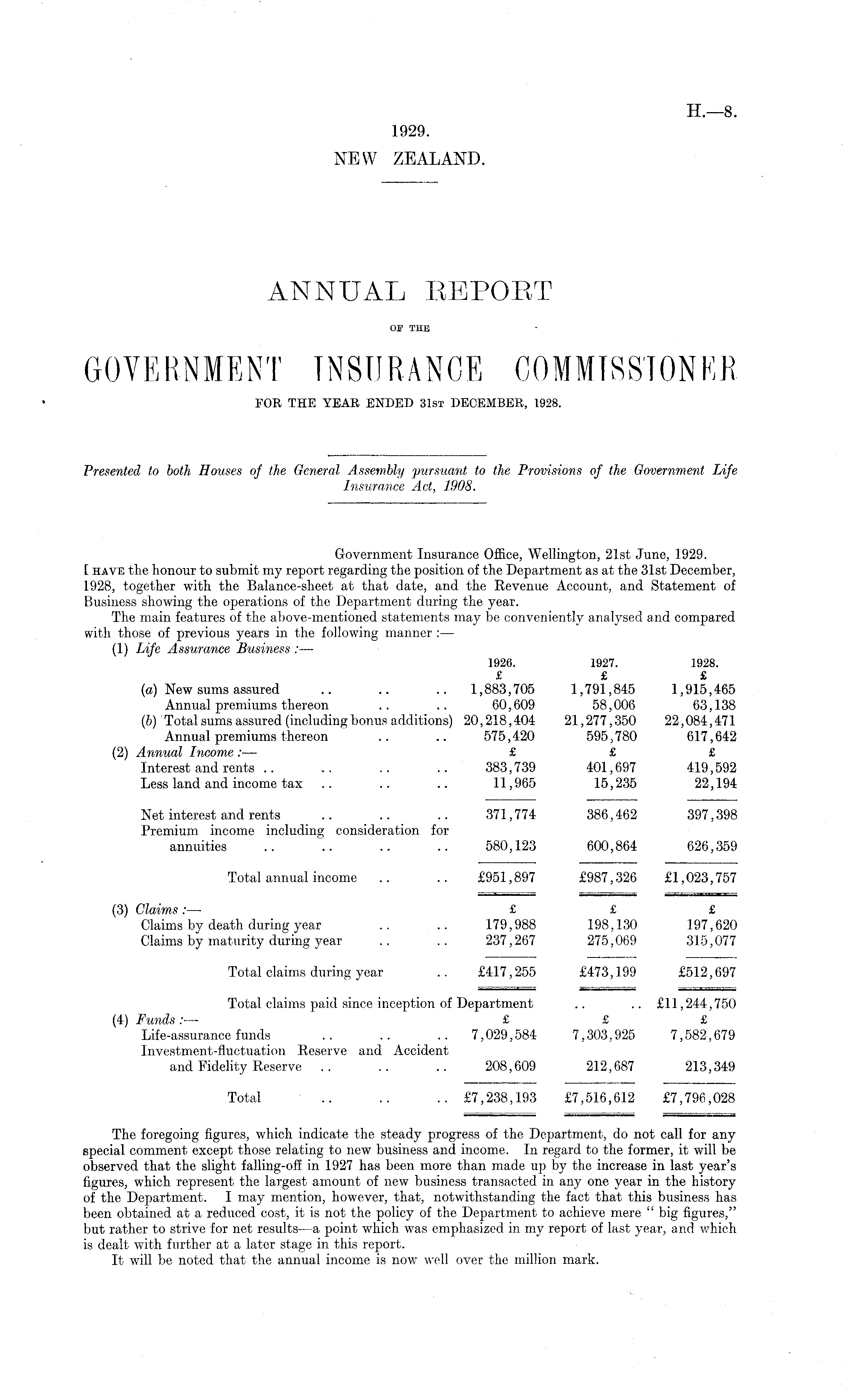 Government Insurance Office, Wellington, 21st June, 1929. [ have the honour to submit my report regarding the position of the Department as at the 31st December, 1928, together with the Balance-sheet at that date, and the Revenue Account, and Statement of Business showing the operations of the Department during the year. The main features of the above-mentioned statements may be conveniently analysed and compared with those of previous years in the following manner : —- (1) Life Assurance Business :— 1926. 1927. 1928. £ £ £ (a) New sums assured .. .. .. 1,883,705 1,791,845 1,915,465 Annual premiums thereon .. .. 60,609 58,006 63,138 (b) Total sums assured (includingbonus additions) 20,218,404 21,277,350 22,084,471 Annual premiums thereon .. .. 575,420 595,780 617,642 (2) Annual Income: — £ £ £ Interest and rents .. ~ .. .. 383,739 401,697 419,592 Less land and income tax .. .. .. 11,965 15,235 22,194 Net interest and rents .. .. .. 371,774 386,462 397,398 Premium income including consideration for annuities .. .. .. .. 580,123 600,864 626,359 Total annual income .. .. £951,897 £987,326 £1,023,757 (3) Claims:—- £ £ £ Claims by death during year .. .. 179,988 198,130 197,620 Claims by maturity during year .. .. 237,267 275,069 315,077 Total claims during year .. £417,255 £473,199 £512,697 Total claims paid since inception of Department .. .. £11,244,750 (4) Funds: — £ £ £ Life-assurance funds .. .. .. 7,029,584 7,303,925 7,582,679 Investment-fluctuation Reserve and Accident and Fidelity Reserve .. .. .. 208,609 212,687 213,349 Total .. .. .. £7,238,193 £7,516,612 £7,796,028 The foregoing figures, which indicate the steady progress of the Department, do not call for any special comment except those relating to new business and income. In regard to the former, it will be observed that the slight falling-ofl in 1927 has been more than made up by the increase in last year's figures, which represent the largest amount of new business transacted in any one year in the history of the Department. I may mention, however, that, notwithstanding the fact that this business has been obtained at a reduced cost, it is not the policy of the Department to achieve mere " big figures," but rather to strive for net results —a point which was emphasized in my report of last year, and which is dealt with further at a later stage in this report. It will be noted that the annual income is now well over the million mark.