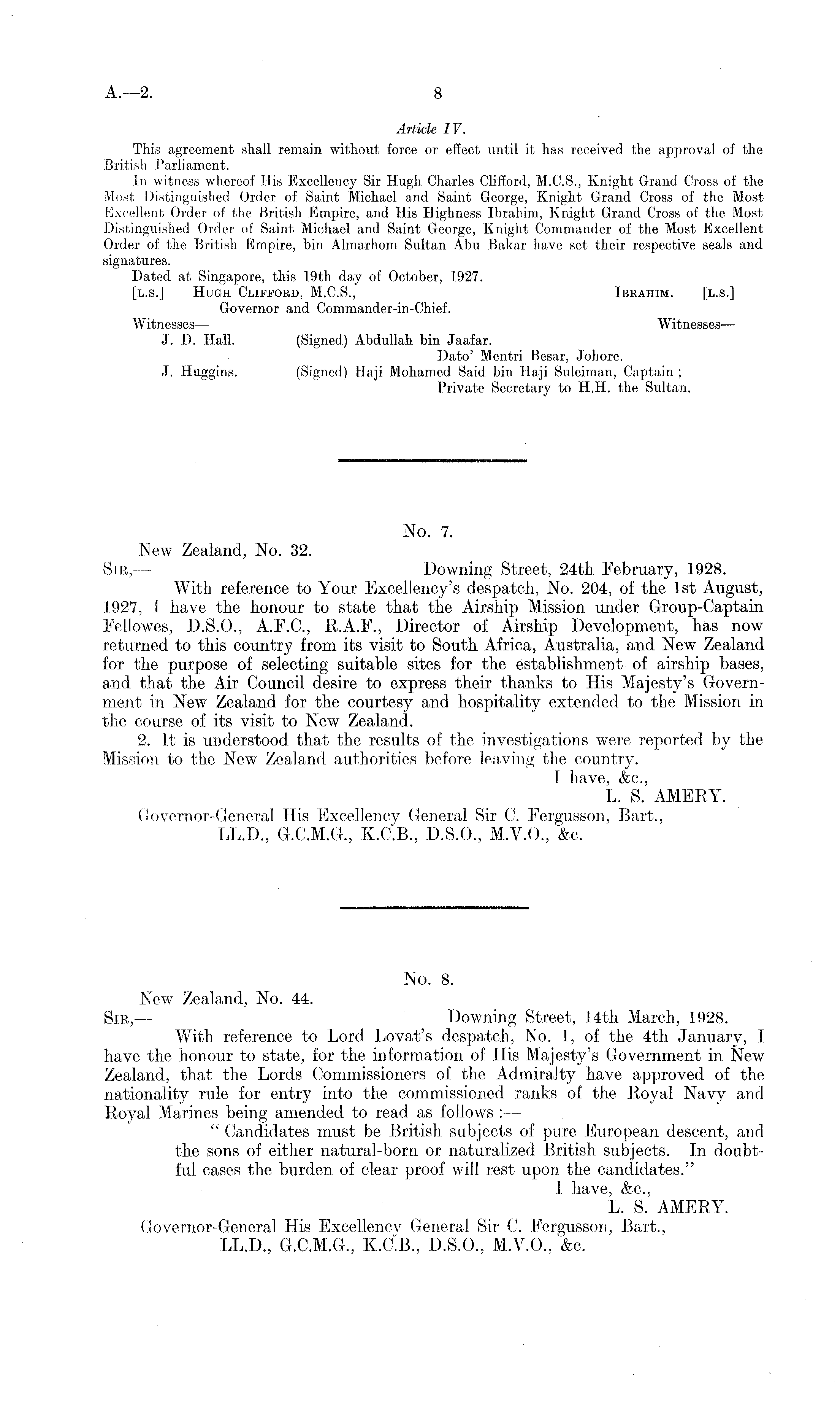Article IV. This agreement shall remain without force or effect until it has received the approval of the British Parliament. In witness whereof His Excellency Sir Hugh Charles Clifford, M.C.S., Knight Grand Cross of the Most Distinguished Order of Saint Michael and Saint George, Knight Grand Cross of the Most Excellent Order of the British Empire, and His Highness Ibrahim, Knight Grand Cross of the Most Distinguished Order of Saint Michael and Saint George, Knight Commander of the Most Excellent Order of the British Empire, bin Almarhom Sultan Abu Bakar have set their respective seals and signatures. Dated at Singapore, this 19th day of October, 1927. [l.s.] Hugh Clifford, M.C.S., Ibrahim. [l.s.] Governor and Commander-in-Chief. Witnesses— Witnesses— J. D. Hall. (Signed) Abdullah bin Jaafar. Dato' Mentri Besar, Johore. J. Huggins. (Signed) Haji Mohamed Said bin Haji Suleiman, Captain ; Private Secretary to H.H, the Sultan.