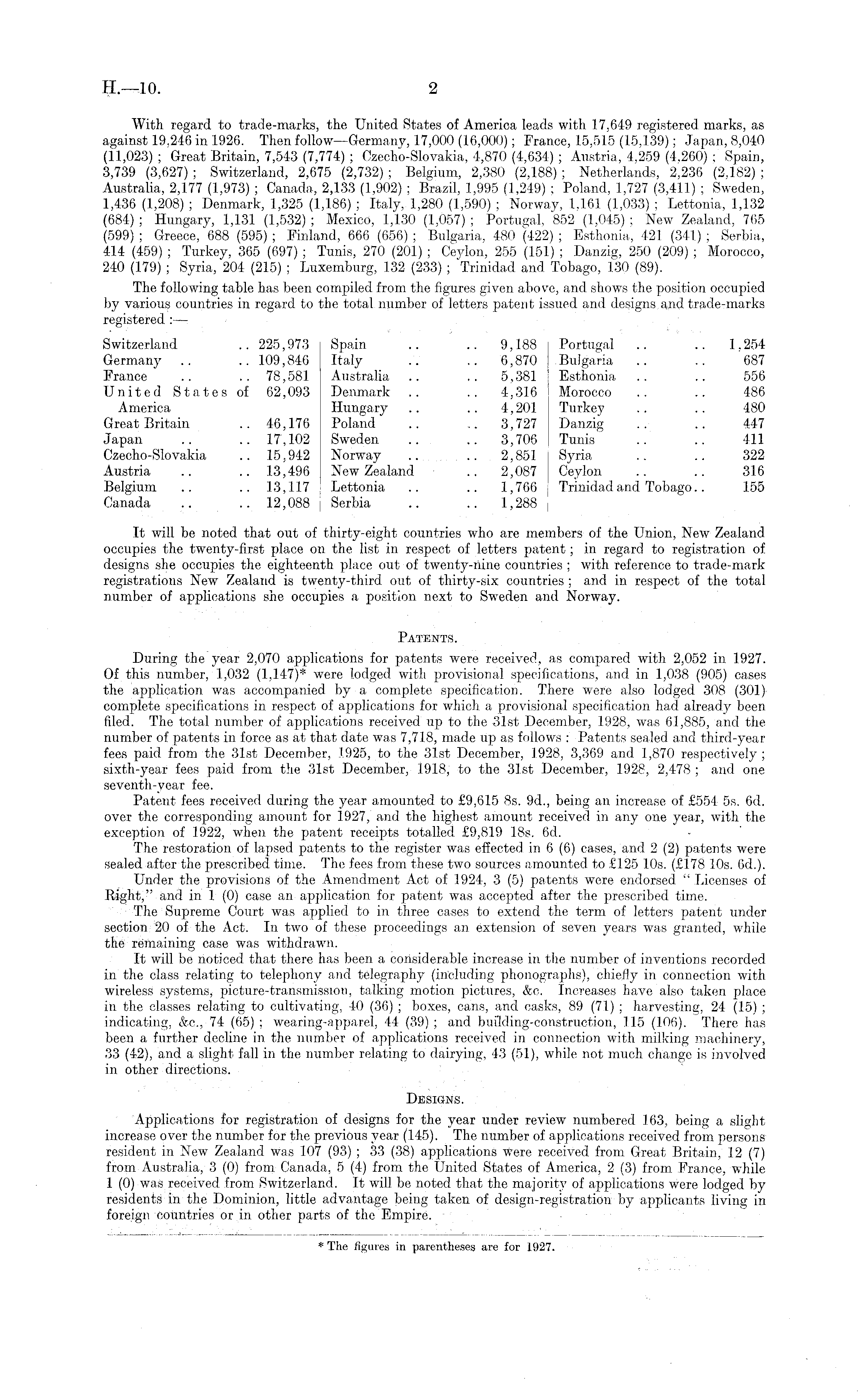 With regard to trade-marks, the United States of America leads with 17,649 registered marks, as against 19,246 in 1926. Then follow —Germany, 17,000 (16,000); France, 15,515 (15,139); Japan, 8,040 (11,023) ; Great Britain, 7,543 (7,774) ; Czecho-Slovakia, 4,870 (4,634) ; Austria, 4,259 (4,260) ; Spain, 3,739 (3,627) ; Switzerland, 2,675 (2,732) ; Belgium, 2,380 (2,188) ; Netherlands, 2,236 (2,182) ; Australia, 2,177 (1,973) ; Canada, 2,133 (1,902) ; Brazil, 1,995 (1,249) ; Poland, 1,727 (3,411) ; Sweden, 1,436 (1,208); Denmark, 1,325 (1,186) ; Italy, 1,280 (1,590) ; Norway, 1,161 (1,033) ; Lettonia, 1,132 (684) ; Hungary, 1,131 (1,532) ; Mexico, 1,130 (1,057) ; Portugal, 852 (1,045) ; New Zealand, 765 (599) ; Greece, 688 (595) ; Finland, 666 (656) ; Bulgaria, 480 (422) ; Esthonia, 421 (341); Serbia, 414 (459) ; Turkey, 365 (697) ; Tunis, 270 (201) ; Ceylon, 255 (151) ; Danzig, 250 (209) ; Morocco, 240 (179) ; Syria, 204 (215) ; Luxemburg, 132 (233) ; Trinidad and Tobago, 130 (89). The following table has been compiled from the figures given above, and shows the position occupied by various countries in regard to the total number of letters patent issued and designs and trade-marks registered : —■ Switzerland .. 225,973 Spain .. .. 9,188 Portugal .. .. 1,254 Germany .. .. 109,846 Italy .. .. 6,870 Bulgaria .. .. 687 France .. .. 78,581 Australia .. .. 5,381 Esthonia .. .. 556 United States of 62,093 Denmark .. .. 4,316 Morocco .. .. 486 America Hungary .. .. 4,201 Turkey .. .. 480 Great Britain .. 46,176 Poland .. ... 3,727 Danzig .. .. 447 Japan .. .. 17,102 Sweden .. .. 3,706 Tunis .. .. 411 Czecho-Slovakia .. .15,942 Norway .. .. 2,851 Syria .. .. 322 Austria .. .. 13,496 New Zealand .. 2,087 Ceylon .. .. 316 Belgium .. .. 13,117 Lettonia .. .. 1,766 Trinidad and Tobago.. 155 Canada .. .. 12,088 Serbia .. .. 1,288 It will be noted that out of thirty-eight countries who are members of the Union, New Zealand occupies the twenty-first place on the list in respect of letters patent; in regard to registration of designs she occupies the eighteenth place out of twenty-nine countries ; with reference to trade-mark registrations New Zealand is twenty-third out of thirty-six countries ; and in respect of the total number of applications she occupies a position next to Sweden and Norway. Patents. During the year 2,070 applications for patents were received, as compared with 2,052 in 1927. Of this number, 1,032 (1,147)* were lodged with provisional specifications, and in 1,038 (905) cases the application was accompanied by a complete specification. There were also lodged 308 (301) complete specifications in respect of applications for which a provisional specification had already been filed. The total number of applications received up to the 31st December, 1928, was 6.1,885, and the number of patents in force as at that date was 7,718, made up as follows : Patents sealed and third-year fees paid from the 31st December, 1925, to the 31st December, 1928, 3,369 and 1,870 respectively; sixth-year fees paid from the 31st December, 1918, to the 31st December, 1928, 2,478 ; and one seventh-year fee. Patent fees received during the year amounted to £9,615 Bs. 9d., being an increase of £554 ss. 6d. over the corresponding amount for 1927, and the highest amount received in any one year, with the exception of 1922, when the patent receipts totalled £9,819 18s. 6d. The restoration of lapsed patents to the register was effected in 6 (6) cases, and 2 (2) patents were sealed after the prescribed time. The fees from these two sources amounted to £125 10s. (£l7B 10s. 6d.). Under the provisions of the Amendment Act of 1924, 3 (5) patents were endorsed " Licenses of Right," and in 1. (0) case an application for patent was accepted after the prescribed time. The Supreme Court was applied to in three cases to extend the term of letters patent under section 20 of the Act. In two of these proceedings an extension of seven years was granted, while the remaining case was withdrawn. It will be noticed that there has been a considerable increase in the number of inventions recorded in the class relating to telephony and telegraphy (including phonographs), chiefly in connection with wireless systems, picture-transmission, talking motion pictures, &c. Increases have also taken place in the classes relating to cultivating, 40 (36) ; boxes, cans, and casks, 89 (71) ; harvesting, 24 (15) ; indicating, &c., 74 (65) ; wearing-apparel, 44 (39) ; and budding-construction, 115 (106). There has been a further decline in the number of applications received in connection with milking machinery, 33 (42), and a slight fall in the number relating to dairying, 43 (51), while not much change is involved in other directions. Designs. Applications for registration of designs for the year under review numbered 163, being a slight increase over the number for the previous year (145). The number of applications received from persons resident in New Zealand was 107 (93) ; 33 (38) applications Were received from Great Britain, 12 (7) from Australia, 3 (0) from Canada, 5 (4) from the United States of America, 2 (3) from France, while 1 (0) was received from Switzerland. It will be noted that the majority of applications were lodged by residents in the Dominion, little advantage being taken of design-registration by applicants living in foreign countries or in other parts of the Empire.