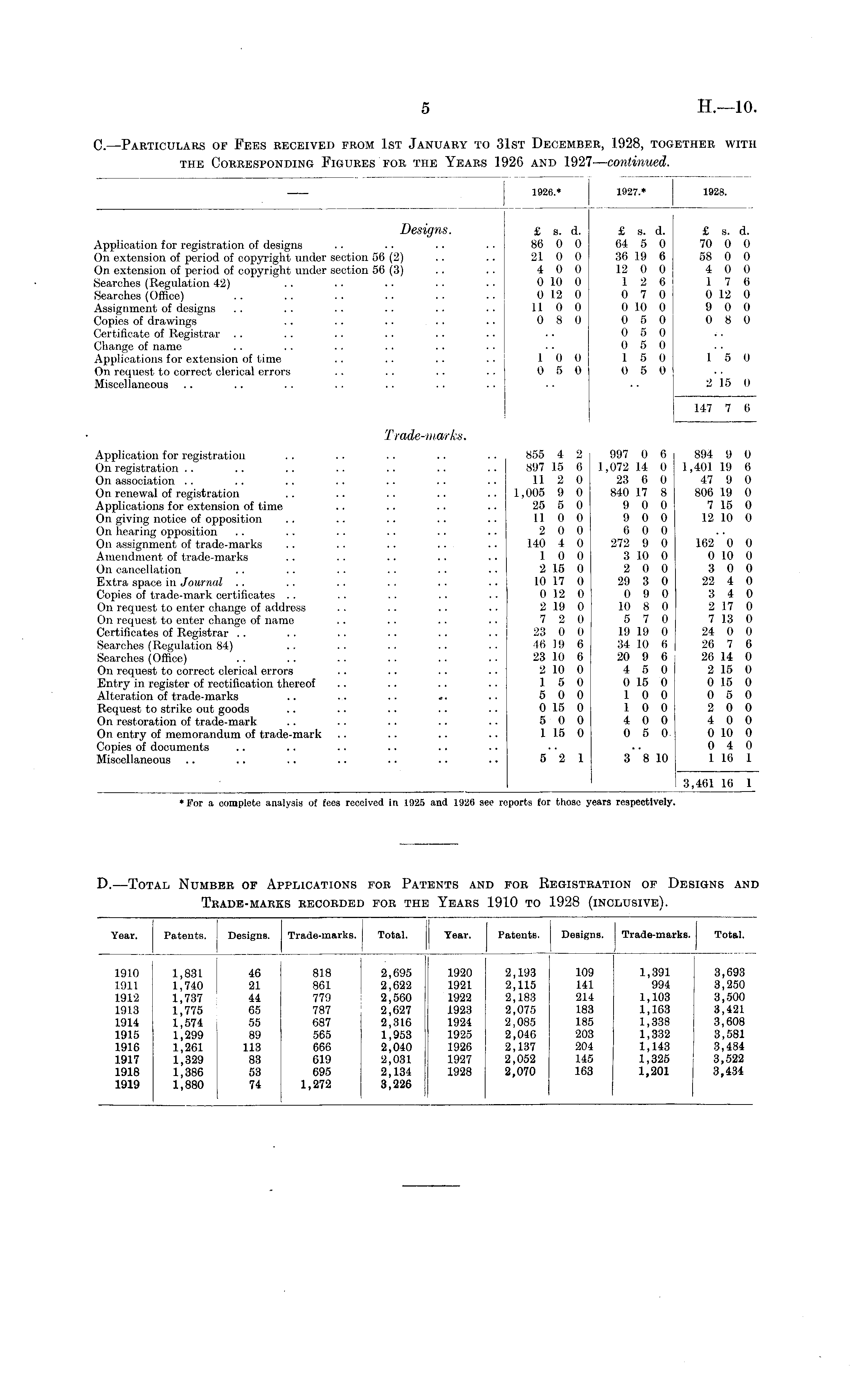 D.—Total Number of Applications for Patents and for Registration of Designs and Trade-marks recorded for the Years 1910 to 1928 (inclusive).