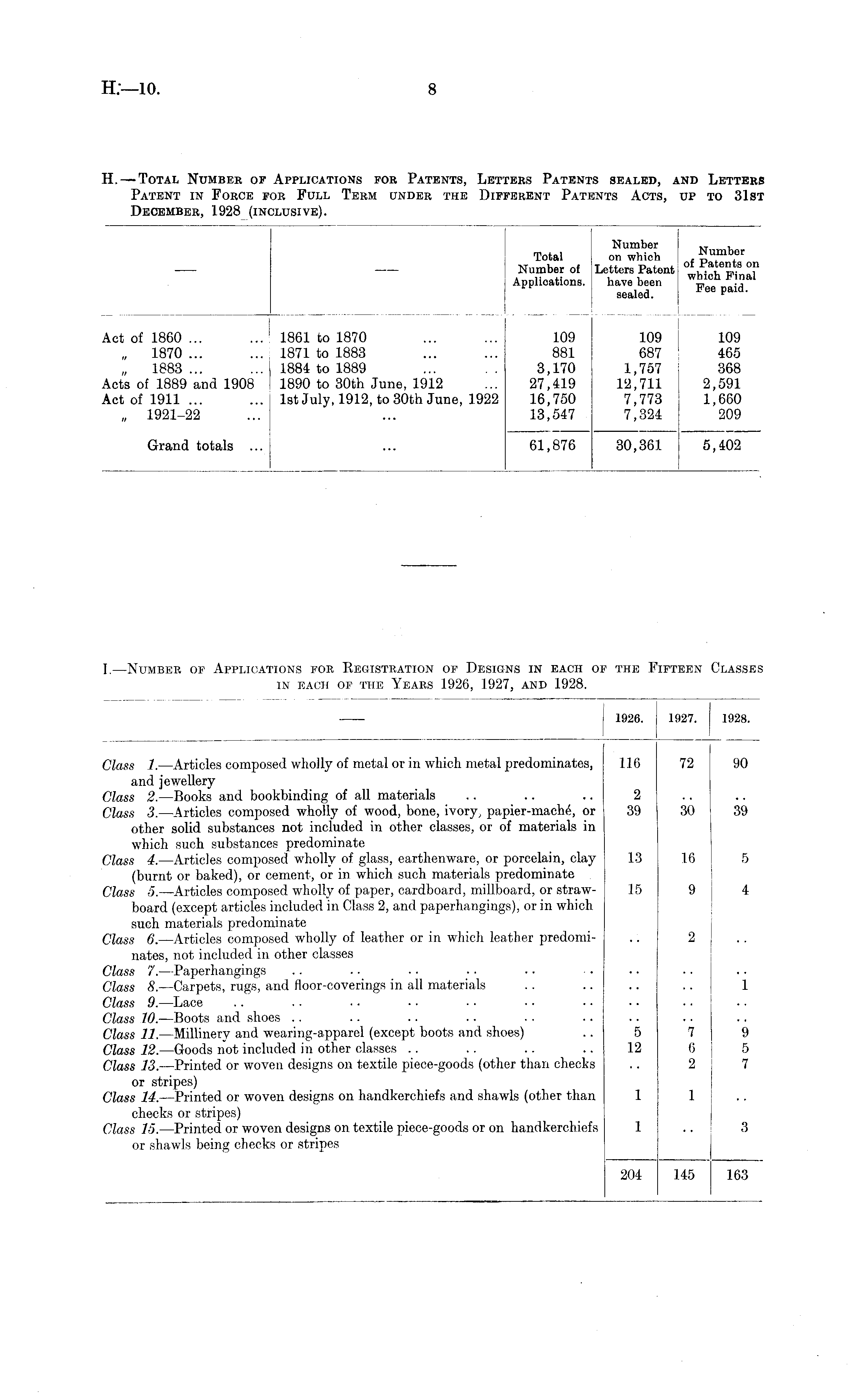 H.—Total Number of Applications for Patents, Letters Patents sealed, and Letters Patent in Force for Full Term under the Different Patents Acts, up to 31st December, 1928 (inclusive).