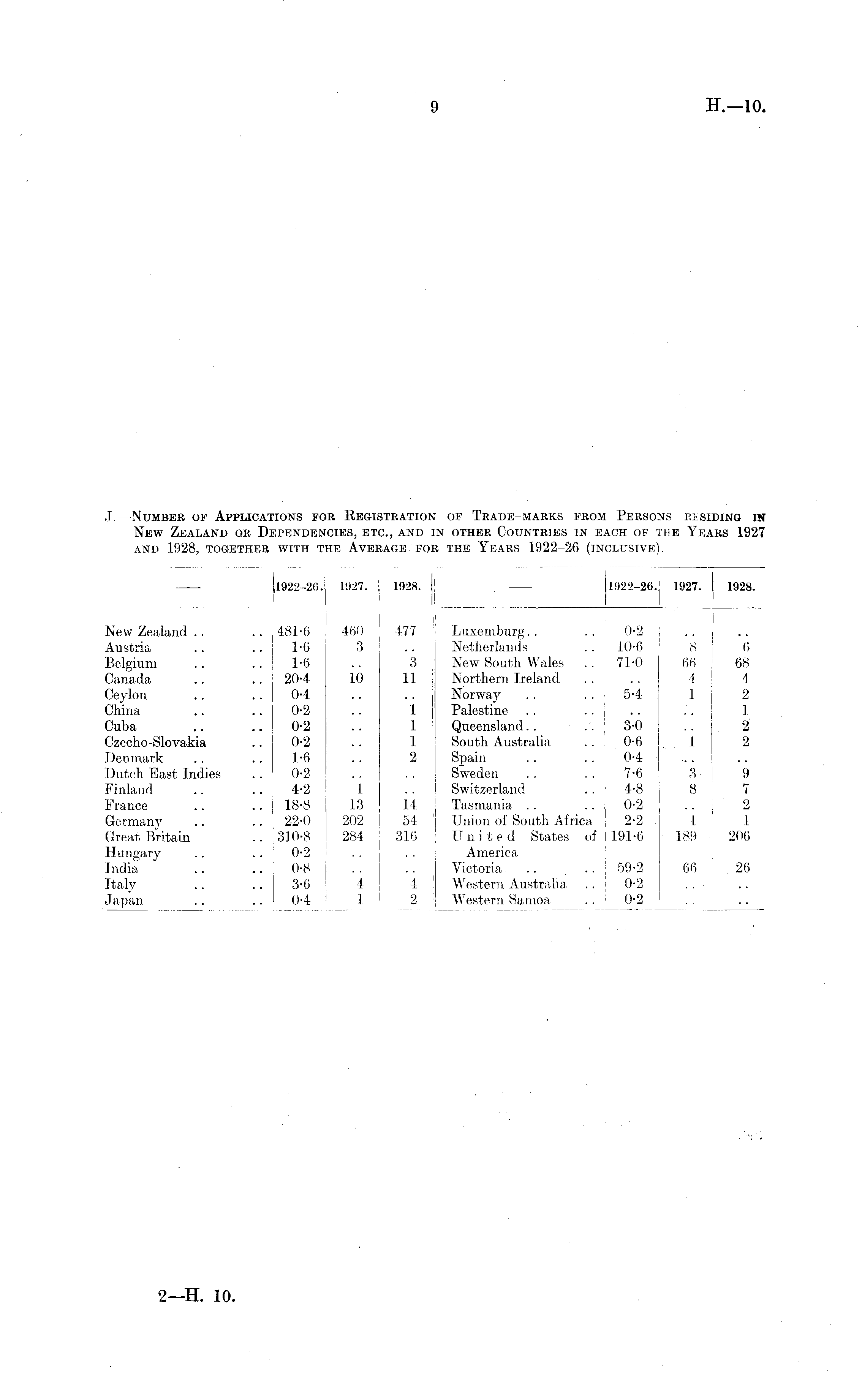 J. —Number of Applications for Registration of Trade-marks from Persons residing in New Zealand or Dependencies, etc., and in other Countries in each of the Years 1927 and 1928, together with the Average for the Years 1922-26 (inclusive).