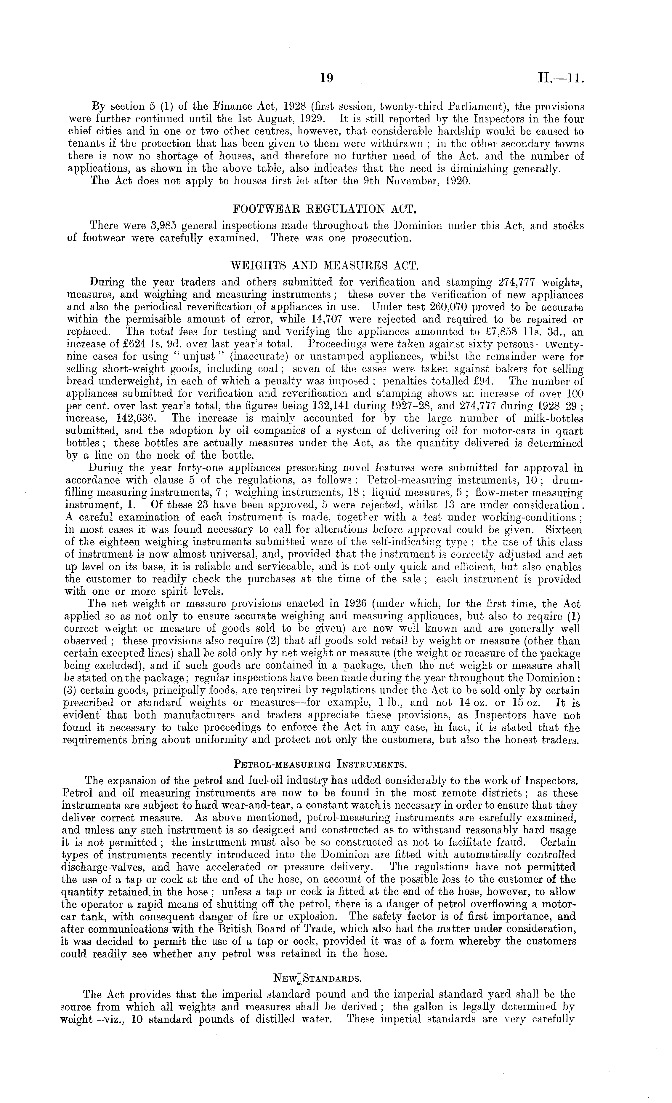 By section 5 (1) of the Finance Act, 1928 (first session, twentj'-third. Parliament), the provisions were further continued until the Ist August, 1929. It is still reported by the Inspectors in the four chief cities and in one or two other centres, however, that considerable hardship would be caused to tenants if the protection that has been given to them were withdrawn ; in the other secondary towns there is now no shortage of houses, and therefore no further need of the Act, and the number of applications, as shown in the above table, also indicates that the need is diminishing generally. The Act does not apply to houses first let after the 9th November, 1920. FOOTWEAR REGULATION ACT. There were 3,985 general inspections made throughout the Dominion under this Act, and stocks of footwear were carefully examined. There was one prosecution. WEIGHTS AND MEASURES ACT. During the year traders and others submitted for verification and stamping 274,777 weights, measures, and weighing and measuring instruments ; these cover the verification of new appliances and also the periodical reverification.of appliances in use. Under test 260,070 proved to be accurate within the permissible amount of error, while 14,707 were rejected and required to be repaired or replaced. The total fees for testing and verifying the appliances amounted to £7,858 lis. 3d., an increase of £624 Is. 9d. over last year's total. Proceedings were taken against sixty persons —twentynine cases for using " unjust " (inaccurate) or unstamped appliances, whilst the remainder were for selling short-weight goods, including coal; seven of the cases were taken against bakers for selling bread underweight, in each of which a penalty was imposed ; penalties totalled £94. The number of appliances submitted for verification and reverification and stamping shows an increase of over 100 per cent, over last year's total, the figures being 132,141 during 1927-28, and 274,777 during 1928-29 ; increase, 142,636. The increase is mainly accounted for by the large number of milk-bottles submitted, and the adoption by oil companies of a system of delivering oil for motor-cars in quart bottles ; these bottles are actually measures under the Act, as the quantity delivered is determined by a line on the neck of the bottle. During the year forty-one appliances presenting novel features were submitted for approval in accordance with clause 5 of the regulations, as follows : Petrol-measuring instruments, 10 ; drumfilling measuring instruments, 7 ; weighing instruments, 18 ; liquid-measures, 5 ; flow-meter measuring instrument, 1. Of these 23 have been approved, 5 were rejected, whilst 13 are under consideration. A careful examination of each instrument is made, together with a test under working-conditions ; in most cases it was found necessary to call for alterations before approval could be given. Sixteen of the eighteen weighing instruments submitted were of the self-indicating type ; the use of this class of instrument is now almost universal, and, provided that the instrument is correctly adjusted and set up level on its base, it is reliable and serviceable, and is not only quick and efficient, but also enables the customer to readily check the purchases at the time of the sale ; each instrument is provided with one or more spirit levels. The net weight or measure provisions enacted in 1926 (under which, for the first time, the Act applied so as not only to ensure accurate weighing and measuring appliances, but also to require (1) correct weight or measure of goods sold to be given) are now well known and are generally well observed ; these provisions also require (2) that all goods sold retail by weight or measure (other than certain excepted lines) shall be sold only by net weight or measure (the weight or measure of the package being excluded), and if such goods are contained in a package, then the net weight or measure shall be stated on the package; regular inspections have been made during the year throughout the Dominion: (3) certain goods, principally foods, are required by regulations under the Act to be sold only by certain prescribed or standard weights or measures —for example, 1 lb., and not 14 oz. or 15 oz. It is evident that both manufacturers and traders appreciate these provisions, as Inspectors have not found it necessary to take proceedings to enforce the Act in any case, in fact, it is stated that the requirements bring about uniformity and protect not only the customers, but also the honest traders. Petrol-measuring Instruments. The expansion of the petrol and fuel-oil industry has added considerably to the work of Inspectors. Petrol and oil measuring instruments are now to be found in the most remote districts ; as these instruments are subject to hard wear-and-tear, a constant watch is necessary in order to ensure that they deliver correct measure. As above mentioned, petrol-measuring instruments are carefully examined, and unless any such instrument is so designed and constructed as to withstand reasonably hard usage it is not permitted ; the instrument must also be so constructed as not to facilitate fraud. Certain types of instruments recently introduced into the Dominion are fitted with automatically controlled discharge-valves, and have accelerated or pressure delivery. The regulations have not permitted the use of a tap or cock at the end of the hose, on account of the possible loss to the customer of the quantity retained, in the hose ; unless a tap or cock is fitted at the end of the hose, however, to allow the operator a rapid means of shutting oS the petrol, there is a danger of petrol overflowing a motorcar tank, with consequent danger of fire or explosion. The safety factor is of first importance, and after communications with the British Board of Trade, which also had the matter under consideration, it was decided to permit the use of a tap or cock, provided it was of a form whereby the customers could rea