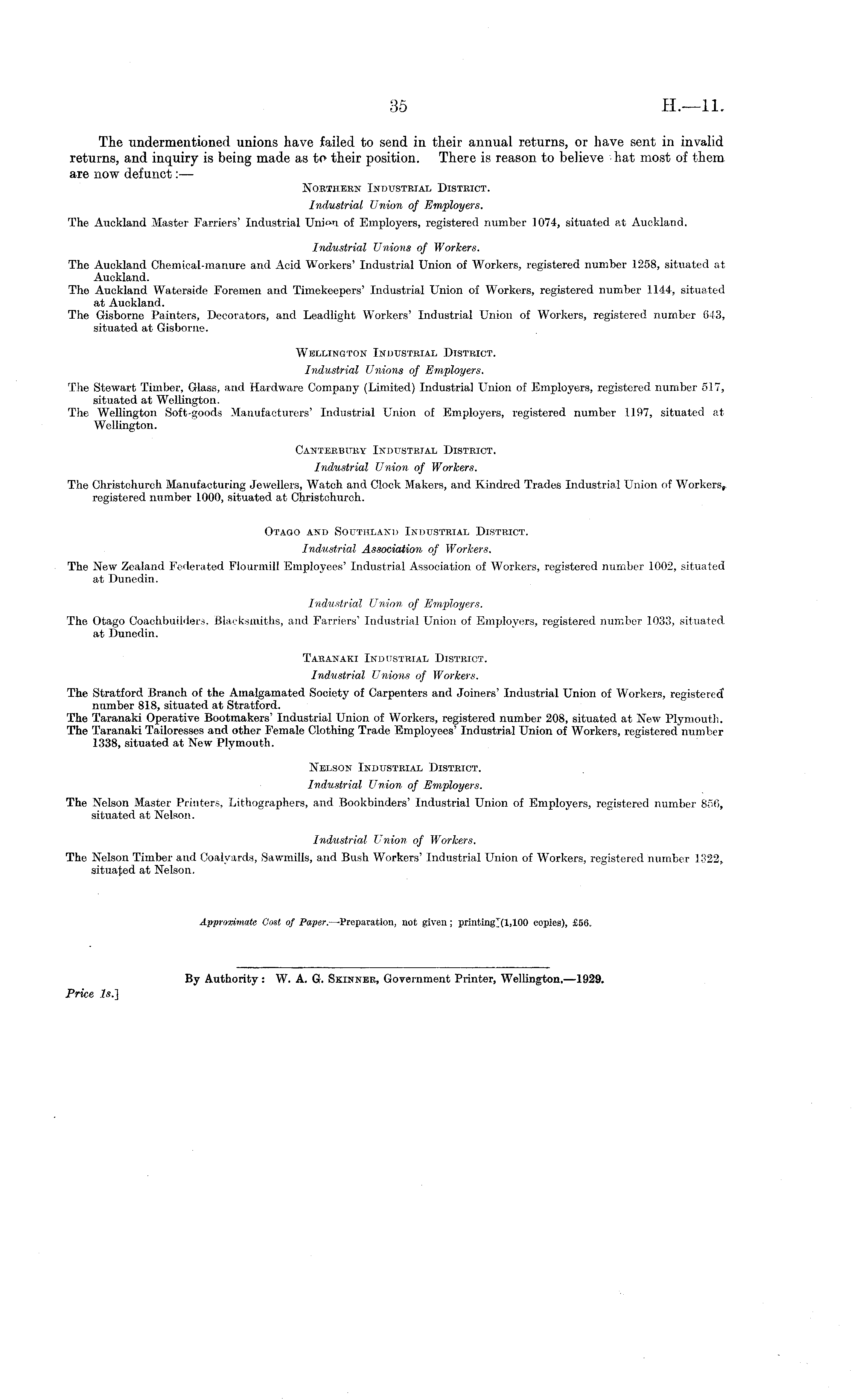 The undermentioned unions have failed to send in their annual returns, or have sent in invalid returns, and inquiry is being made as tr> their position. There is reason to believe hat most of them are now defunct-: — Northern Industrial District. Industrial Union of Employers. The Auckland Master Farriers' Industrial Uni»u of Employers, registered number 1074, situated at Auckland. Industrial Unions of Workers. The Auckland Chemical-manure and Acid Workers' Industrial Union of Workers, registered number 1258, situated at Auckland. The Auckland Waterside Foremen and Timekeepers' Industrial Union of Workers, registered number 1144, situated at Auckland. The Gisborne Painters, Decorators, and Leadlight Workers' Industrial Union of Workers, registered number 643, situated at Gisborne. Wellington Industrial District. Industrial Unions of Employers. The Stewart Timber, Glass, and Hardware Company (Limited) Industrial Union of Employers, registered number 517, situated at Wellington. The Wellington Soft-goods Manufacturers' Industrial Union of Employers, registered number 1197, situated at Wellington. Canterbury Industrial District. Industrial Union of Workers. The Christchurch Manufacturing Jewellers, Watch and Clock Makers, and Kindred Trades Industrial Union of Workers,, registered number 1000, situated at Christchurch. Otago and Southland Industrial District. Industrial Association of Workers. The New Zealand Federated Flourmill Employees' Industrial Association of Workers, registered number 1002, situated at Dunedin. Industrial Union of Employers. The Otago Coachbuilders, Blacksmiths, and Farriers' Industrial Union of Employers, registered number 1033, situated at Dunedin. Taranaki Industrial District. Industrial Unions of Workers. The Stratford Branch of the Amalgamated Society of Carpenters and Joiners' Industrial Union of Workers, registered number 818, situated at Stratford. The Taranaki Operative Bootmakers' Industrial Union of Workers, registered number 208, situated at New Plymouth. The Taranaki Tailoresses and other Female Clothing Trade Employees' Industrial Union of Workers, registered number 1338, situated at New Plymouth. Nelson Industrial District. Industrial Union of Employers. The Nelson Master Printers, Lithographers, and Bookbinders' Industrial Union of Employers, registered number 856, situated at Nelson. Industrial Union of Workers. The Nelson Timber and Coalvards, Sawmills, and Bush Workers' Industrial Union of Workers, registered number 1322, situated at Nelson.
