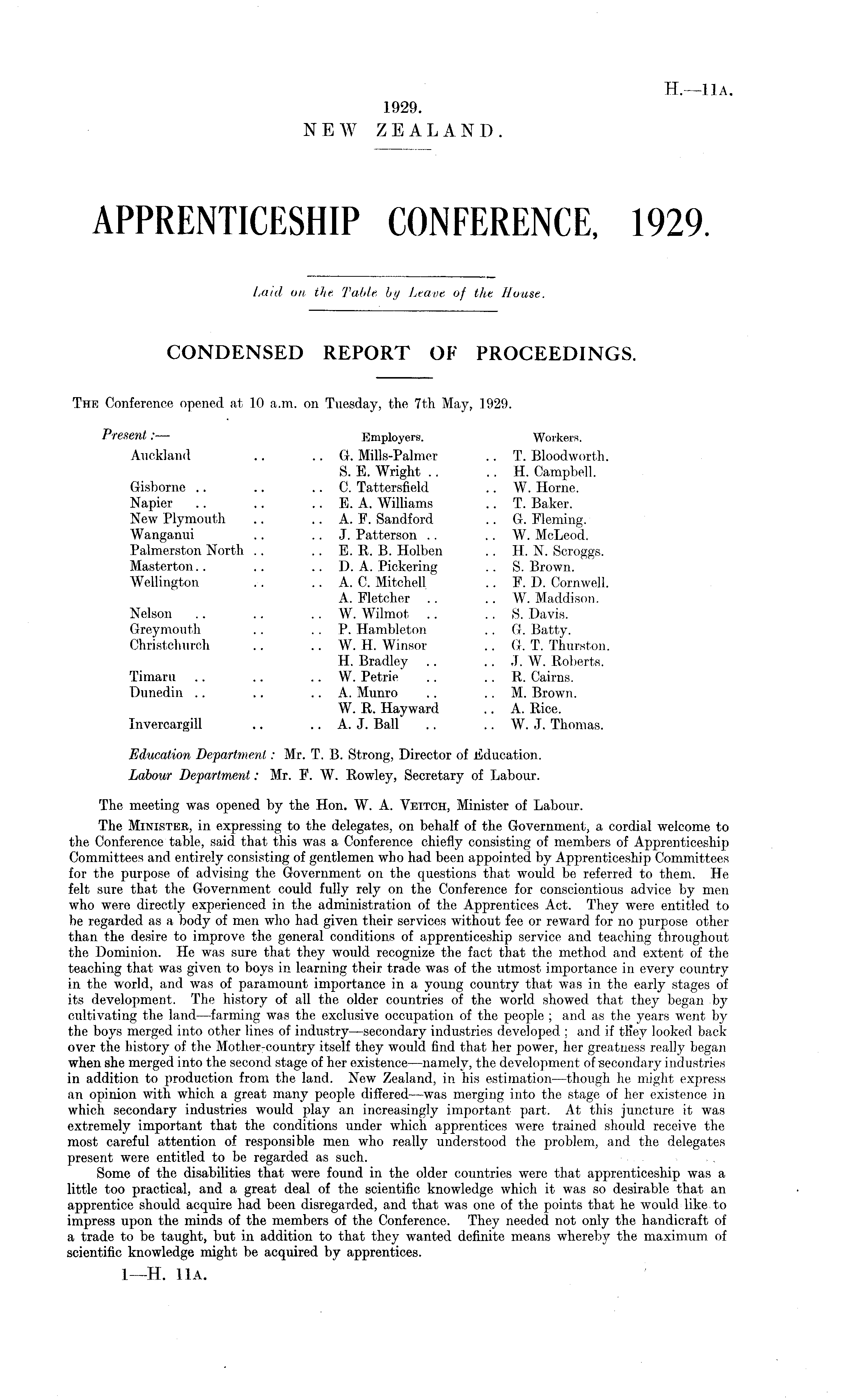 CONDENSED REPORT OF PROCEEDINGS. The Conference opened at 10 a.m. on Tuesday, the 7th May, 1929. Present : — Employers. Workers. Auckland .. .. G. Mills-Palmer .. T. Bloodworth. S. E. Wright .. H. Campbell. Gisborne .. .. .. C. Tattersfield .. W. Home. Napier .. .. .. E. A. Williams .. T. Baker. New Plymouth .. .. A. F. Sandford .. G. Fleming. Wanganui .. J. Patterson .. .. W. McLeod. Palmerston North .. .. E. R. B. Holben .. H. N. Scroggs. Masterton.. .. .. D. A. Pickering .. S. Brown. Wellington .. .. A. C. Mitchell .. F. D. Cornwell. A. Fletcher .. W. Maddison. Nelson .. .. .. W. Wilmot .. .. S. Davis. Greymouth .. . . P. Hambleton .. G. Batty. Christchurch .. .. W. H. Winsor .. G. T. Thurston. H. Bradley .. .. J. W. Roberts. Timaru .. .. W. Petrie .. .. P. Cairns. Dunedin .. .. .. A. Munro .. .. M. Brown. W. R. Hayward .. A. Rice. Invercargill .. .. A. J. Ball . . . . W. J. Thomas. Education Department: Mr. T. B. Strong, Director of Education. Labour Department: Mr. F. W. Rowley, Secretary of Labour. The meeting was opened by the Hon. W. A. Veitch, Minister of Labour. The Minister, in expressing to the delegates, on behalf of the Government, a cordial welcome to the Conference table, said that this was a Conference chiefly consisting of members of Apprenticeship Committees and entirely consisting of gentlemen who had been appointed by Apprenticeship Committees for the purpose of advising the Government on the questions that would be referred to them. He felt sure that the Government could fully rely on the Conference for conscientious advice by men who were directly experienced in the administration of the Apprentices Act. They were entitled to be regarded as a body of men who had given their services without fee or reward for no purpose other than the desire to improve the general conditions of apprenticeship service and teaching throughout the Dominion. He was sure that they would recognize the fact that the method and extent of the teaching that was given to boys in learning their trade was of the utmost importance in every country in the world, and was of paramount importance in a young country that was in the early stages of its development. The history of all the older countries of the world showed that they began by cultivating the land —farming was the exclusive occupation of the people ; and as the years went by the boys merged into other lines of industry—secondary industries developed ; and if tKey looked back over the history of the Mother-country itself they would find that her power, her greatness really began when she merged into the second stage of her existence—namely, the development of secondary industries in addition to production from the land. New Zealand, in his estimation —though he might express an opinion with which a great many people differed —was merging into the stage of her existence in which secondary industries would play an increasingly important part. At this juncture it was extremely important that the conditions under which apprentices were trained should receive the most careful attention of responsible men who really understood the problem, and the delegates present were entitled to be regarded as such. Some of the disabilities that were found in the older countries were that apprenticeship was a little too practical, and a great deal of the scientific knowledge which it was so desirable that an apprentice should acquire had been disregarded, and that was one of the points that he would like to impress upon the minds of the members of the Conference. They needed not only the handicraft of a trade to be taught, but in addition to that they wanted definite means whereby the maximum of scientific knowledge might be acquired by apprentices.