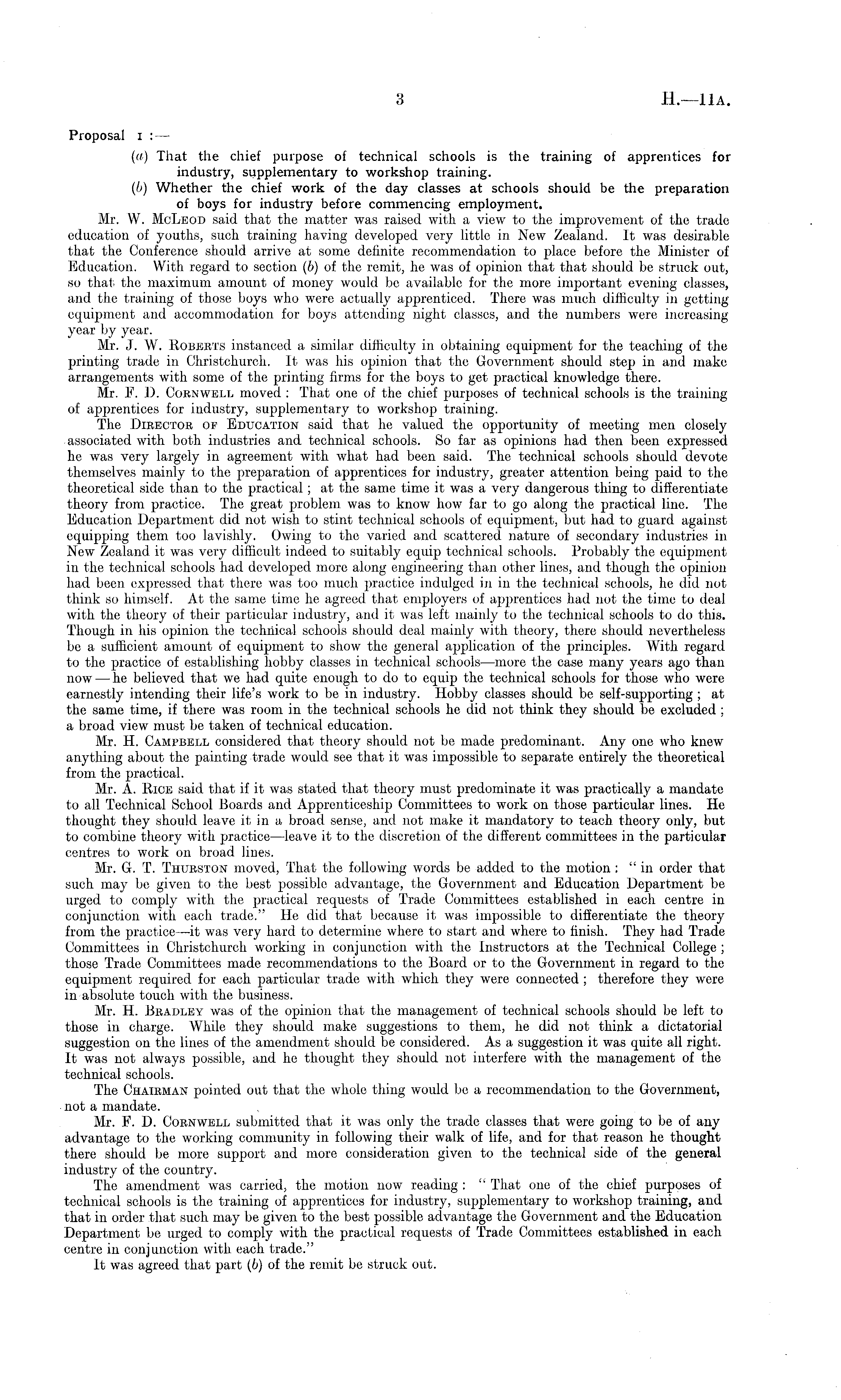 Proposal i : — (a) That the chief purpose of technical schools is the training of apprentices for industry, supplementary to workshop training. (b) Whether the chief work of the day classes at schools should be the preparation of boys for industry before commencing employment. Mr. W. McLeod said that the matter was raised with a view to the improvement of the trade education of youths, such training having developed very little in New Zealand. It was desirable that the Conference should arrive at some definite recommendation to place before the Minister of Education. With regard to section (b) of the remit, he was of opinion that that should be struck out, so that, the maximum amount of money would be available for the more important evening classes, and the training of those boys who were actually apprenticed. There was much difficulty in getting equipment and accommodation for boys attending night classes, and the numbers were increasing year by year. Mr. J. W. Roberts instanced a similar difficulty in obtaining equipment for the teaching of the printing trade in Christchurch. It was his opinion that the Government should step in and make arrangements with some of the printing firms for the boys to get practical knowledge there. Mr. F. I). Cornwell moved : That one of the chief purposes of technical schools is the training of apprentices for industry, supplementary to workshop training. The Director of Education said that he valued the opportunity of meeting men closely associated with both industries and technical schools. So far as opinions had then been expressed he was very largely in agreement with what had been said. The technical schools should devote themselves mainly to the preparation of apprentices for industry, greater attention being paid to the theoretical side than to the practical; at the same time it was a very dangerous thing to differentiate theory from practice. The great problem was to know how far to go along the practical line. The Education Department did not wish to stint technical schools of equipment, but had to guard against equipping them too lavishly. Owing to the varied and scattered nature of secondary industries in New Zealand it was very difficult indeed to suitably equip technical schools. Probably the equipment in the technical schools had developed more along engineering than other lines, and though the opinion had been expressed that there was too much practice indulged in in the technical schools, he did not think so himself. At the same time he agreed that employers of apprentices had not the time to deal with the theory of their particular industry, and it was left mainly to the technical schools to do this. Though in his opinion the technical schools should deal mainly with theory, there should nevertheless be a sufficient amount of equipment to show the general application of the principles. With regard to the practice of establishing hobby classes in technical schools—more the case many years ago than now —he believed that we had quite enough to do to equip the technical schools for those who were earnestly intending their life's work to be in industry. Hobby classes should be self-supporting ; at the same time, if there was room in the technical schools he did not think they should be excluded ; a broad view must be taken of technical education. Mr. H. Campbell considered that theory should not be made predominant. Any one who knew anything about the painting trade would see that it was impossible to separate entirely the theoretical from the practical. Mr. A. Rice said that if it was stated that theory must predominate it was practically a mandate to all Technical School Boards and Apprenticeship Committees to work on those particular lines. He thought they should leave it in a broad sense, and not make it mandatory to teach theory only, but to combine theory with practice —leave it to the discretion of the different committees in the particular centres to work on broad lines. Mr. G. T. Thurston moved, That the following words be added to the motion: "in order that such may be given to the best possible advantage, the Government and Education Department be urged to comply w T ith the practical requests of Trade Committees established in each centre in conjunction with each trade." He did that because it was impossible to differentiate the theory from the practice —it was very hard to determine where to start and where to finish. They had Trade Committees in Christchurch working in conjunction with the Instructors at the Technical College ; those Trade Committees made recommendations to the Board or to the Government in regard to the equipment required for each particular trade with which they were connected ; therefore they were in absolute touch with the business. Mr. H. Bradley was of the opinion that the management of technical schools should be left to those in charge. While they should make suggestions to them, he did not think a dictatorial suggestion on the lines of the amendment should be considered. As a suggestion it was quite all right. It was not always possible, and he thought they should not interfere with the management of the technical schools. The Chairman pointed out that the whole thing would be a recommendation to the Government, not a mandate. Mr. F. D. Cornwell submitted that it was only the trade classes that were going to be of any advantage to the working community in following their walk of life, and for that reason he thought there should be more support and more consideration given to the technical side of the general industry of the country. The amendment was carried, the motion now reading : " That one of the chief purposes of technical schools is the training of apprentices for industry, supplementary to workshop training, and that in order that such may be given to the best possible advantage the Government and the Education Department be urged to comply with the practical requests of Trade Committe