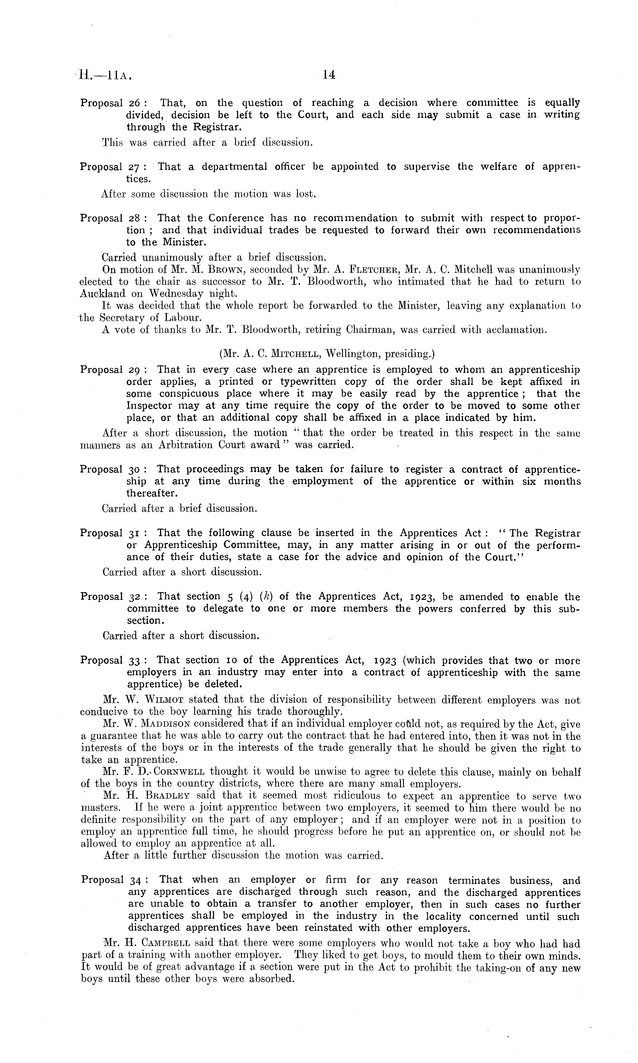 Proposal 26 : That, on the question of reaching a decision where committee is equally divided, decision be left to the Court, and each side may submit a case in writing through the Registrar. This was carried after a brief discussion. Proposal 27 : That a departmental officer be appointed to supervise the welfare of apprentices. After some discussion tbe motion was lost. Proposal 28: That the Conference has no recommendation to submit with respect to proportion ; and that individual trades be requested to forward their own recommendations to the Minister. Carried unanimously after a brief discussion. On motion of Mr. M. Brown, seconded by Mr. A. Fletcher, Mr. A. C. Mitchell was unanimously elected to the chair as successor to Mr. T. Bloodworth, who intimated that he had to return to Auckland on Wednesday night. It was decided that the whole report be forwarded to the Minister, leaving any explanation to the Secretary of Labour. A vote of thanks to Mr. T. Bloodworth, retiring Chairman, was carried with acclamation. (Mr. A. C. Mitchell, Wellington, presiding.) Proposal 29 : That in every case where an apprentice is employed to whom an apprenticeship order applies, a printed or typewritten copy of the order shall be kept affixed in some conspicuous place where it may be easily read by the apprentice ; that the Inspector may at any time require the copy of the order to be moved to some other place, or that an additional copy shall be affixed in a place indicated by him. After a short discussion, the motion " that the order be treated in this respect in the same manners as an Arbitration Court award " was carried. Proposal 30 : That proceedings may be taken for failure to register a contract of apprenticeship at any time during the employment of the apprentice or within six months thereafter. Carried after a brief discussion. Proposal 31 : That the following clause be inserted in the Apprentices Act : " The Registrar or Apprenticeship Committee, may, in any matter arising in or out of the performance of their duties, state a case for the advice and opinion of the Court." Carried after a short discussion. Proposal 32 : That section 5 (4) (k) of the Apprentices Act, 1923, be amended to enable the committee to delegate to one or more members the powers conferred by this subsection. Carried after a short discussion. Proposal 33 : That section 10 of the Apprentices Act, 1923 (which provides that two or more employers in an industry may enter into a contract of apprenticeship with the same apprentice) be deleted. Mr. W. Wilmot stated that the division of responsibility between different employers was not conducive to the boy learning his trade thoroughly. Mr. W. Maddison considered that if an individual employer collld not, as required by the Act, give a guarantee that he was able to carry out the contract that he had entered into, then it was not in the interests of the boys or in the interests of the trade generally that he should be given the right to take an apprentice. Mr. F. D.- Cornwell thought it would be unwise to agree to delete this clause, mainly on behalf of the boys in the country districts, where there are many small employers. Mr. H. Bradley said that it seemed most ridiculous to expect an apprentice to serve two masters. If he were a joint apprentice between two employers, it seemed to him there would be no definite responsibility on the part of any employer; and if an employer were not in a position to employ an apprentice full time, he should progress before he put an apprentice on, or should not be allowed to employ an apprentice at all. After a little further discussion the motion was carried. Proposal 34 : That when an employer or firm for any reason terminates business, and any apprentices are discharged through such reason, and the discharged apprentices are unable to obtain a transfer to another employer, then in such cases no further apprentices shall be employed in the industry in the locality concerned until such discharged apprentices have been reinstated with other employers. Mr. H. Campbell said that there were some employers who would not take a boy who had had part of a training with another employer. They liked to get boys, to mould them to their own minds. It would be of great advantage if a section were put in the Act to prohibit the taking-on of any new boys until these other boys were absorbed.