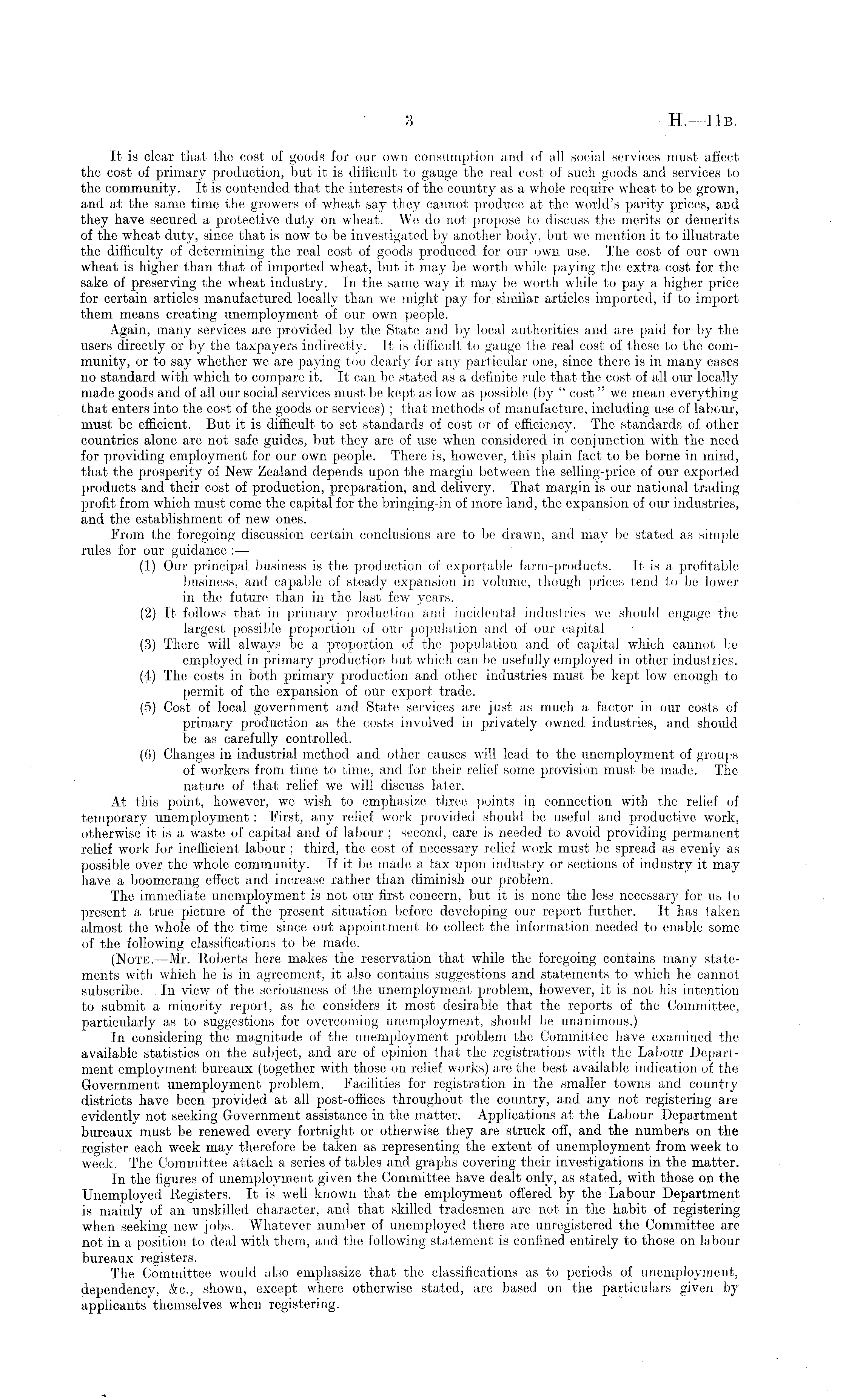 It is clear that the cost of goods for our own consumption and of all social services must affect the cost of primary production, but it is difficult to gauge the real cost of such goods and services to the community. It is contended that the interests of the country as a whole require wheat to be grown, and at the same time the growers of wheat say they cannot produce at the world's parity prices, and they have secured a protective duty on wheat. We do not propose to discuss the merits or demerits of the wheat duty, since that is now to be investigated by another body, but we mention it to illustrate the difficulty of determining the real cost of goods produced for our own use. The cost of our own wheat is higher than that of imported wheat, but it may be worth while paying the extra cost for the sake of preserving the wheat industry. In the same way it may be worth while to pay a higher price for certain articles manufactured locally than we might pay for. similar articles imported, if to import them means creating unemployment of our own people. Again, many services are provided by the State and by local authorities and are paid for by the users directly or by the taxpayers indirectly. It is difficult to gauge the real cost of these to the community, or to say whether we are paying too dearly for any particular one, since there is in many cases 110 standard with which to compare it. It can be stated as a definite rule that the cost of all our locally made goods and of all our social services must be kept as low as possible (by " cost" we mean everything that enters into the cost of the goods or services) ; that methods of manufacture, including use of labour, must be efficient. But it is difficult to set standards of cost or of efficiency. The standards of other countries alone are not safe guides, but they are of use when considered in conjunction with the need for providing employment for our own people. There is, however, this plain fact to be borne in mind, that the prosperity of New Zealand depends upon the margin between the selling-price of our exported products and their cost of production, preparation, and delivery. That margin is our national trading profit from which must come the capital for the bringing-in of more land, the expansion of our industries, and the establishment of new ones. From the foregoing discussion certain conclusions are to be drawn, and may be stated as simple rules for our guidance : — (1) Our principal business is the production of exportable farm-products. It is a profitable business, and capable of steady expansion in volume, though prices tend to be lower in the future than in the last few years. (2) It follows that in primary production and incidental industries we should engage the largest possible proportion of our population and of our capital. (3) There will always be a proportion of the population and of capital which cannot be employed in primary production but which can be usefully employed in other industries. (4) The costs in both primary production and other industries must be kept low enough to permit of the expansion of our export trade. (5) Cost of local government and State services are just as much a factor in our costs of primary production as the costs involved in privately owned industries, and should be as carefully controlled. (6) Changes in industrial method and other causes will lead to the unemployment of groups of workers from time to time, and for their relief some provision must be made. The nature of that relief we will discuss later. At this point, however, we wish to emphasize three points in connection with the relief of temporary unemployment : First, any relief work provided should be useful and productive work, otherwise it is a waste of capital and of labour ; second, care is needed to avoid providing permanent relief work for inefficient labour ; third, the cost of necessary relief work must be spread as evenly as possible over the whole community. If it be made a tax upon industry or sections of industry it may have a boomerang effect and increase rather than diminish our problem. The immediate unemployment is not our first concern, but it is none the less necessary for us to present a true picture of the present situation before developing our report further. It has taken almost the whole of the time since out appointment to collect the information needed to enable some of the following classifications to be made. (Note. —Mr. Roberts here makes the reservation that while the foregoing contains many statements with which he is in agreement, it also contains suggestions and statements to which he cannot subscribe. In view of the seriousness of the unemployment problem, however, it is not his intention to submit a minority report, as he considers it most desirable that the reports of the Committee, particularly as to suggestions for overcoming unemployment, should be unanimous.) In considering the magnitude of the unemployment problem the Committee have examined the available statistics on the subject, and are of opinion that- the registrations with the Labour Department employment bureaux (together with those on relief works) are the best available indication of the Government unemployment problem. Facilities for registration in the smaller towns and country districts have been provided at all post-offices throughout the country, and any not registering are evidently not seeking Government assistance in the matter. Applications at the Labour Department bureaux must be renewed every fortnight or otherwise they are struck off, and the numbers on the register each week may therefore be taken as representing the extent of unemployment from week to week. The Committee attach a series of tables and graphs covering their investigations in the matter. In the figures of unemployment given the Committee have dealt only, as stated, with those on the Unemployed Registers. It is well known that the employment offered by 