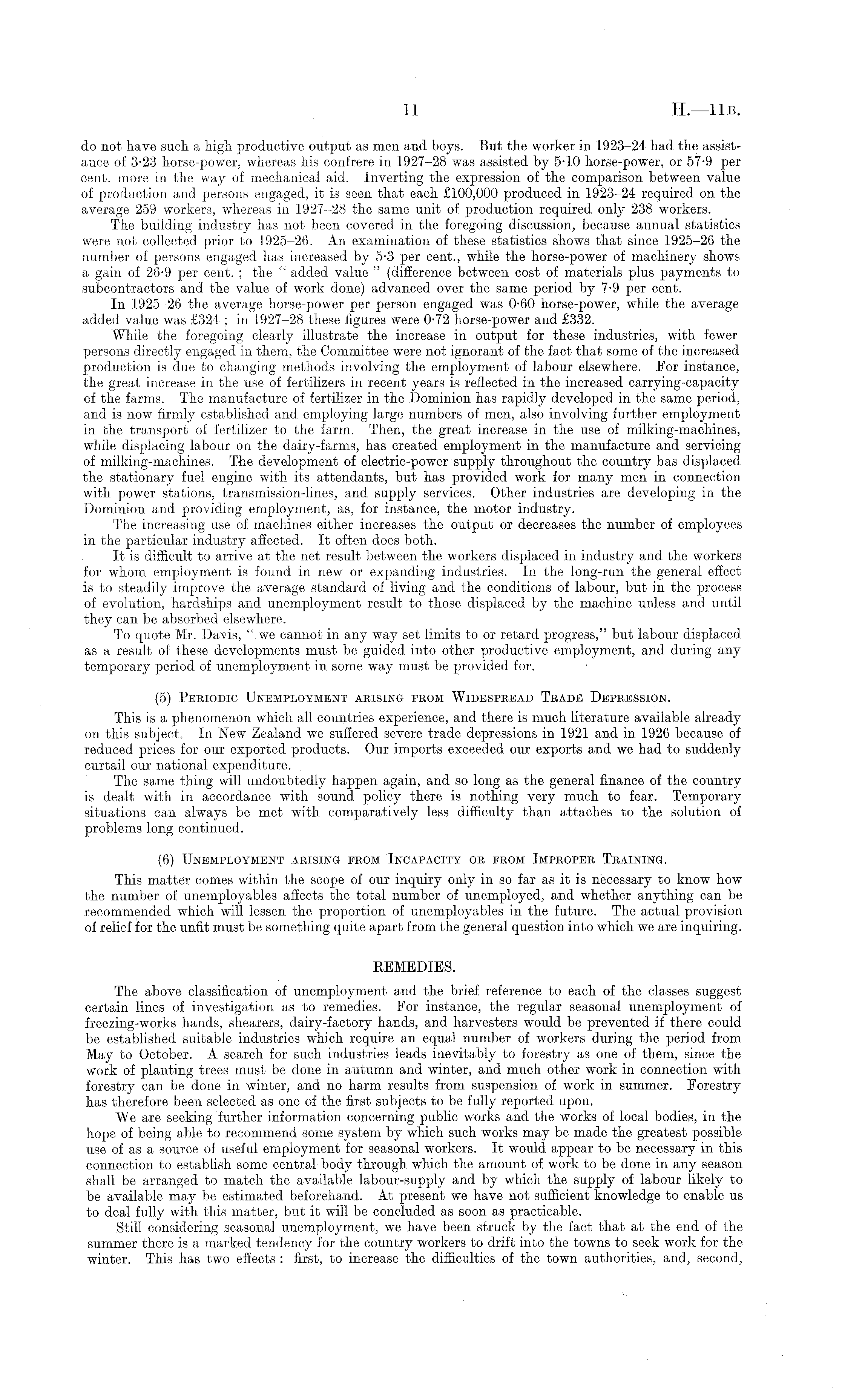 do not have such a high productive output as men and boys. But the worker in 1923-24 had the assistance of 3-23 horse-power, whereas his confrere in 1927-28 was assisted by 5-10 horse-power, or 57-9 per cent, more in the way of mechanical aid. Inverting the expression of the comparison between value of production and persons engaged, it is seen that each £100,000 produced in 1923-24 required on the average 259 workers, whereas in 1927-28 the same unit of production required only 238 workers. The building industry has not been covered in the foregoing discussion, because annual statistics were not collected prior to 1925-26. An examination of these statistics shows that since 1925-26 the number of persons engaged has increased by 5-3 per cent., while the horse-power of machinery shows a gain of 26-9 per cent. ; the " added value " (difference between cost of materials plus payments to subcontractors and the value of work done) advanced over the same period by 7-9 per cent. In 1925-26 the average horse-power per person engaged was 0-60 horse-power, while the average added value was £324 ; in 1927-28 these figures were 0-72 horse-power and £332. While the foregoing clearly illustrate the increase in output for these industries, with fewer persons directly engaged in them, the Committee were not ignorant of the fact that some of the increased production is due to changing methods involving the employment of labour elsewhere. For instance, the great increase in the use of fertilizers in recent years is reflected in the increased carrying-capacity of the farms. The manufacture of fertilizer in the Dominion has rapidly developed in the same period, and is now firmly established and employing large numbers of men, also involving further employment in the transport of fertilizer to the farm. Then, the great increase in the use of milking-machines, while displacing labour on the dairy-farms, has created employment in the manufacture and servicing of milking-machines. The development of electric-power supply throughout the country has displaced the stationary fuel engine with its attendants, but has provided work for many men in connection with power stations, transmission-lines, and supply services. Other industries are developing in the Dominion and providing employment, as, for instance, the motor industry. The increasing use of machines either increases the output or decreases the number of employees in the particular industry affected. It often does both. It is difficult to arrive at the net result between the workers displaced in industry and the workers for whom employment is found in new or expanding industries. In the long-run the general effect is to steadily improve the average standard of living and the conditions of labour, but in the process of evolution, hardships and unemployment. result to those displaced by the machine unless and until they can be absorbed elsewhere. To quote Mr. Davis, " we cannot in any way set limits to or retard progress," but labour displaced as a result of these developments must be guided into other productive employment, and during any temporary period of unemployment in some way must be provided for. (5) Periodic Unemployment arising from Widespread Trade Depression. This is a phenomenon which all countries experience, and there is much literature available already on this subject. In New Zealand we suffered severe trade depressions in 1921 and in 1926 because of reduced prices for our exported products. Our imports exceeded our exports and we had to suddenly curtail our national expenditure. The same thing will undoubtedly happen again, and so long as the general finance of the country is dealt with in accordance with sound policy there is nothing very much to fear. Temporary situations can always be met with comparatively less difficulty than attaches to the solution of problems long continued. (6) Unemployment arising from Incapacity or from Improper Training. This matter comes within the scope of our inquiry only in so far as it is necessary to know how the number of unemployables affects the total number of unemployed, and whether anything can be recommended which will lessen the proportion of unemployables in the future. The actual provision of relief for the unfit must be something quite apart from the general question into which we are inquiring. REMEDIES. The above classification of unemployment and the brief reference to each of the classes suggest certain lines of investigation as to remedies. For instance, the regular seasonal unemployment of freezing-works hands, shearers, dairy-factory hands, and harvesters would be prevented if there could be established suitable industries which require an equal number of workers during the period from May to October. A search for such industries leads inevitably to forestry as one of them, since the work of planting trees must be done in autumn and winter, and much other work in connection with forestry can be done in winter, and no harm results from suspension of work in summer. Forestry has therefore been selected as one of the first subjects to be fully reported upon. We are seeking further information concerning public works and the works of local bodies, in the hope of being able to recommend some system by which such works may be made the greatest possible use of as a source of useful employment for seasonal workers. It would appear to be necessary in this connection to establish some central body through which the amount of work to be done in any season shall be arranged to match the available labour-supply and by which the supply of labour likely to be available may be estimated beforehand. At present we have not sufficient knowledge to enable us to deal fully with this matter, but it will be concluded as soon as practicable. Still considering seasonal unemployment, we have been struck by the fact that at the end of the summer there is a marked tendency for the country workers to drift into the