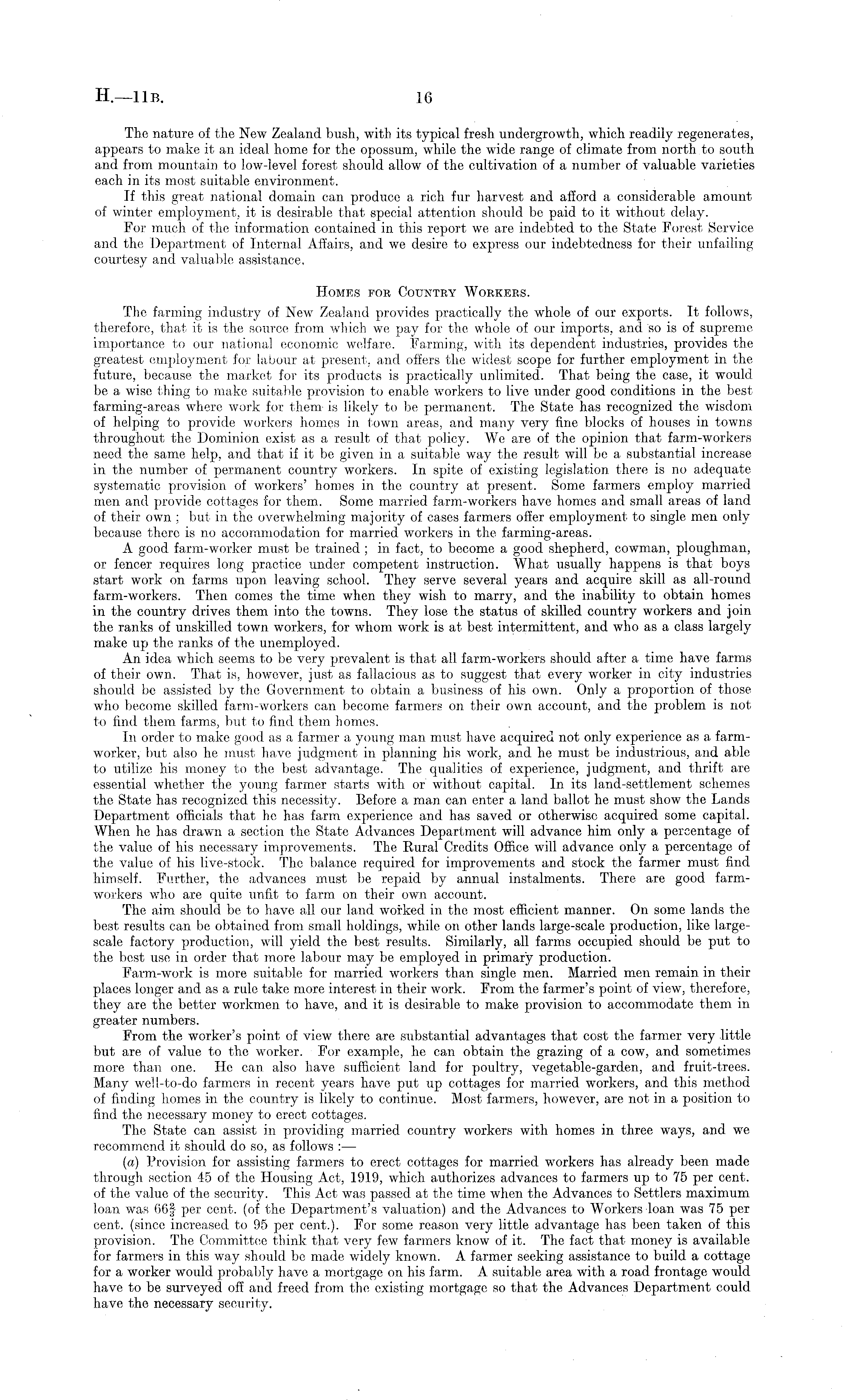 The nature of the New Zealand bush, with its typical fresh undergrowth, which readily regenerates, appears to make it an ideal home for the opossum, while the wide range of climate from north to south and from mountain to low-level forest should allow of the cultivation of a number of valuable varieties each in its most suitable environment. If this great national domain can produce a rich fur harvest and afford a considerable amount of winter employment, it is desirable that special attention should be paid to it without delay. For much of the information contained in this report we are indebted to the State Forest Service and the Department of Internal Affairs, and we desire to express our indebtedness for their unfailing courtesy and valuable assistance. Homes for Country Workers. The farming industry of New Zealand provides practically the whole of our exports. It follows, therefore, that it is the source from which we pay for the whole of our imports, and so is of supreme importance to our national economic welfare. Farming, with its dependent industries, provides the greatest employment for labour at present, and offers the widest scope for further employment in the future, because the market for its products is practically unlimited. That being the case, it would be a wise thing to make suitable provision to enable workers to live under good conditions in the best farming-areas where work for them is likely to be permanent. The State has recognized the wisdom of helping to provide workers homes in town areas, and many very fine blocks of houses in towns throughout the Dominion exist as a result of that policy. We are of the opinion that farm-workers need the same help, and that if it be given in a suitable way the result will be a substantial increase in the number of permanent country workers. In spite of existing legislation there is no adequate systematic provision of workers' homes in the country at present. Some farmers employ married men and provide cottages for them. Some married farm-workers have homes and small areas of land of their own ; but in the overwhelming majority of eases farmers offer employment to single men only because there is no accommodation for married workers in the farming-areas. A good farm-worker must be trained ; in fact, to become a good shepherd, cowman, ploughman, or fencer requires long practice under competent instruction. What usually happens is that boys start work on farms upon leaving school. They serve several years and acquire skill as all-round farm-workers. Then comes the time when they wish to marry, and the inability to obtain homes in the country drives them into the towns. They lose the status of skilled country workers and join the ranks of unskilled town workers, for whom work is at best intermittent, and who as a class largely make up the ranks of the unemployed. An idea which seems to be very prevalent is that all farm-workers should after a time have farms of their own. That is, however, just as fallacious as to suggest that every worker in city industries should be assisted by the Government to obtain a business of his own. Only a proportion of those who become skilled farm-workers can become farmers on their own account, and the problem is not to find them farms, but to find them homes. In order to make good as a farmer a young man must have acquired not only experience as a farmworker, but also he must have judgment in planning his work, and he must be industrious, and able to utilize his money to the best advantage. The qualities of experience, judgment, and thrift are essential whether the young farmer starts with or without capital. In its land-settlement schemes the State has recognized this necessity. Before a man can enter a land ballot he must show the Lands Department officials that he has farm experience and has saved or otherwise acquired some capital. When he has drawn a section the State Advances Department will advance him only a percentage of the value of his necessary improvements. The Rural Credits Office will advance only a percentage of the value of his live-stock. The balance required for improvements and stock the farmer must find himself. Further, the advances must be repaid by annual instalments. There are good farmworkers who are quite unfit to farm on their own account. The aim should be to have all our land worked in the most efficient manner. On some lands the best results can be obtained from small holdings, while on other lands large-scale production, like largescale factory production, will yield the best results. Similarly, all farms occupied should be put to the best use in order that more labour may be employed in primary production. Farm-work is more suitable for married workers than single men. Married men remain in their places longer and as a rule take more interest in their work. From the farmer's point of view, therefore, they are the better workmen to have, and it is desirable to make provision to accommodate them in greater numbers. From the worker's point of view there are substantial advantages that cost the farmer very little but are of value to the worker. For example, he can obtain the grazing of a cow, and sometimes more than one. He can also have sufficient land for poultry, vegetable-garden, and fruit-trees. Many well-to-do farmers in recent years have put up cottages for married workers, and this method of finding homes in the country is likely to continue. Most farmers, however, are not in a position to find the necessary money to erect cottages. The State can assist in providing married country workers with homes in three ways, and we recommend it should do so, as follows :—■ (a) Provision for assisting farmers to erect cottages for married workers has already been made through section 45 of the Housing Act, 1919, which authorizes advances to farmers up to 75 per cent, of the value of the security. This Act was passed at the time when the Advances to Settlers maximum loan