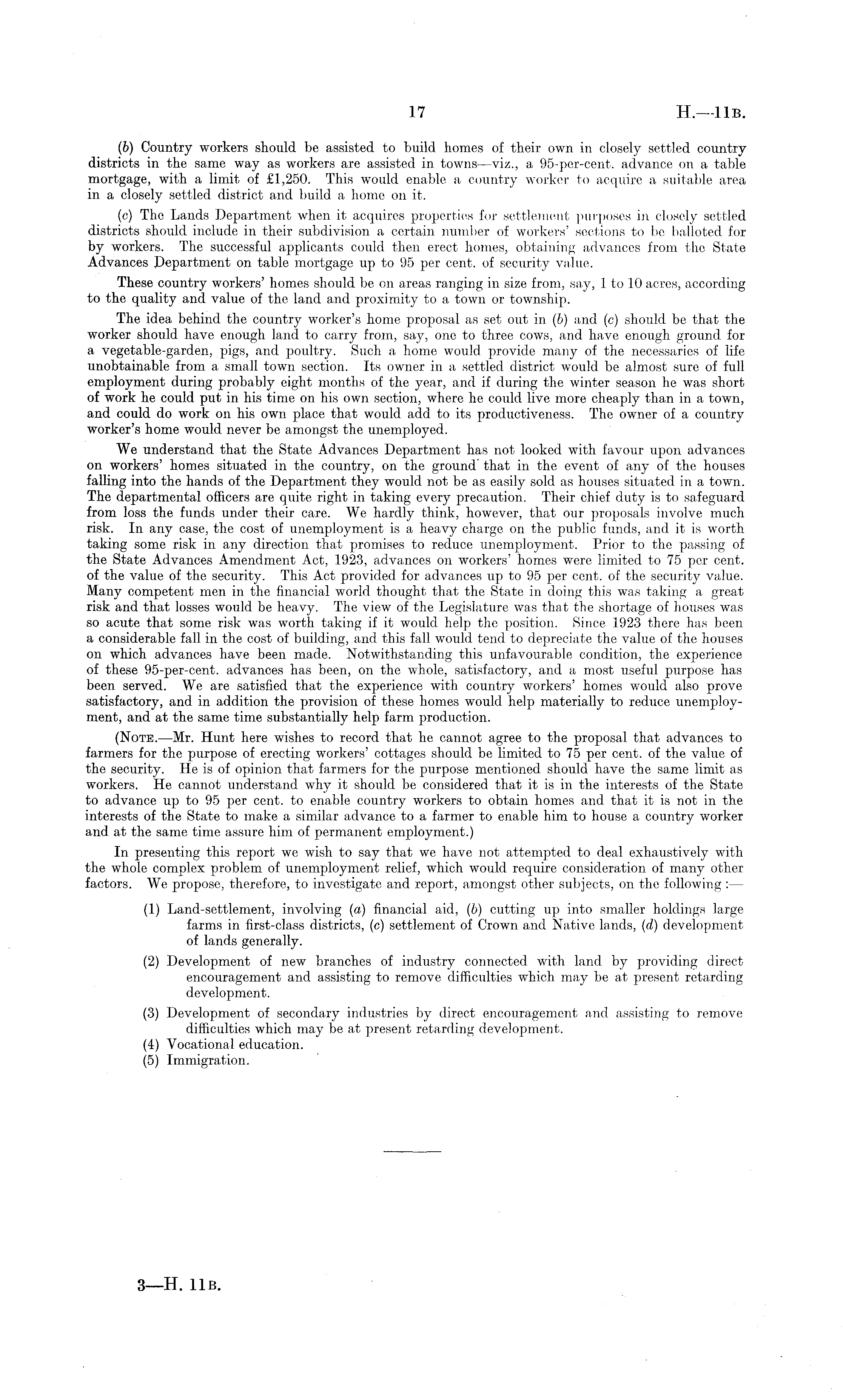 (b) Country workers should be assisted to build tomes of their own in closely settled country districts in the same way as workers are assisted in towns—viz., a 95-per-cent. advance on a table mortgage, with a limit of £1,250. This would enable a country worker to acquire a suitable area in a closely settled district and build a home oil it. (c) The Lands Department when it acquires properties for settlement purposes in closely settled districts should include in their subdivision a certain number of workers' sections to be balloted for by workers. The successful applicants could then erect homes, obtaining advances from the State Advances Department on table mortgage up to 95 per cent, of security value. These country workers' homes should be on areas ranging in size from, say, 1 to 10 acres, according to the quality and value of the land and proximity to a town or township. The idea behind the country worker's home proposal as set out in (b) and (c) should be that the worker should have enough land to carry from, say, one to three cows, and have enough ground for a vegetable-garden, pigs, and poultry. Such a home would provide many of the necessaries of life unobtainable from a small town section. Its owner in a settled district would be almost sure of full employment during probably eight months of the year, and if during the winter season he was short of work he could put in his time on his own section, where he could live more cheaply than in a town, and could do work on his own place that would add to its productiveness. The owner of a country worker's home Would never be amongst the unemployed. We understand that the State Advances Department has not looked with favour upon advances on workers' homes situated in the country, on the ground' that in the event of any of the houses falling into the hands of the Department they would not be as easily sold as houses situated in a town. The departmental officers are quite right in taking every precaution. Their chief duty is to safeguard from loss the funds under their care. We hardly think, however, that our proposals involve much risk. In any case, the cost of unemployment is a heavy charge on the public funds, and it is worth taking some risk in any direction that promises to reduce unemployment. Prior to the passing of the State Advances Amendment Act, 1923, advances on workers' homes were limited to 75 per cent, of the value of the security. This Act provided for advances up to 95 per cent, of the security value. Many competent men in the financial world thought that the State in doing this was taking a great risk and that losses would be heavy. The view of the Legislature was that the shortage of houses was so acute that some risk was worth taking if it would help the position. Since 1923 there has been a considerable fall in the cost of building, and this fall would tend to depreciate the value of the houses on which advances have been made. Notwithstanding this unfavourable condition, the experience of these 95-per-cent. advances has been, on the whole, satisfactory, and a most useful purpose has been served. We are satisfied that the experience with country workers' homes would also prove satisfactory, and in addition the provision of these homes would help materially to reduce unemployment, and at the same time substantially help farm production. (Note. —Mr. Hunt here wishes to record that he cannot agree to the proposal that advances to farmers for the purpose of erecting workers' cottages should be limited to 75 per cent, of the value of the security. He is of opinion that farmers for the purpose mentioned should have the same limit as workers. He cannot understand why it should be considered that it is in the interests of the State to advance up to 95 per cent, to enable country workers to obtain homes and that it is not in the interests of the State to make a similar advance to a farmer to enable him to house a country worker and at the same time assure him of permanent employment.) In presenting this report we wish to say that we have not attempted to deal exhaustively with the whole complex problem of unemployment relief, which would require consideration of many other factors. We propose, therefore, to investigate and report, amongst other subjects, on the following : — (1) Land-settlement, involving (a) financial aid, (b) cutting up into smaller holdings large farms in first-class districts, (c) settlement of Crown and Native lands, (d) development of lands generally. (2) Development of new branches of industry connected with land by providing direct encouragement and assisting to remove difficulties which may be at present retarding development. (3) Development of secondary industries by direct encouragement and assisting to remove difficulties which may be at present retarding development. (4:) Vocational education. (5) Immigration.