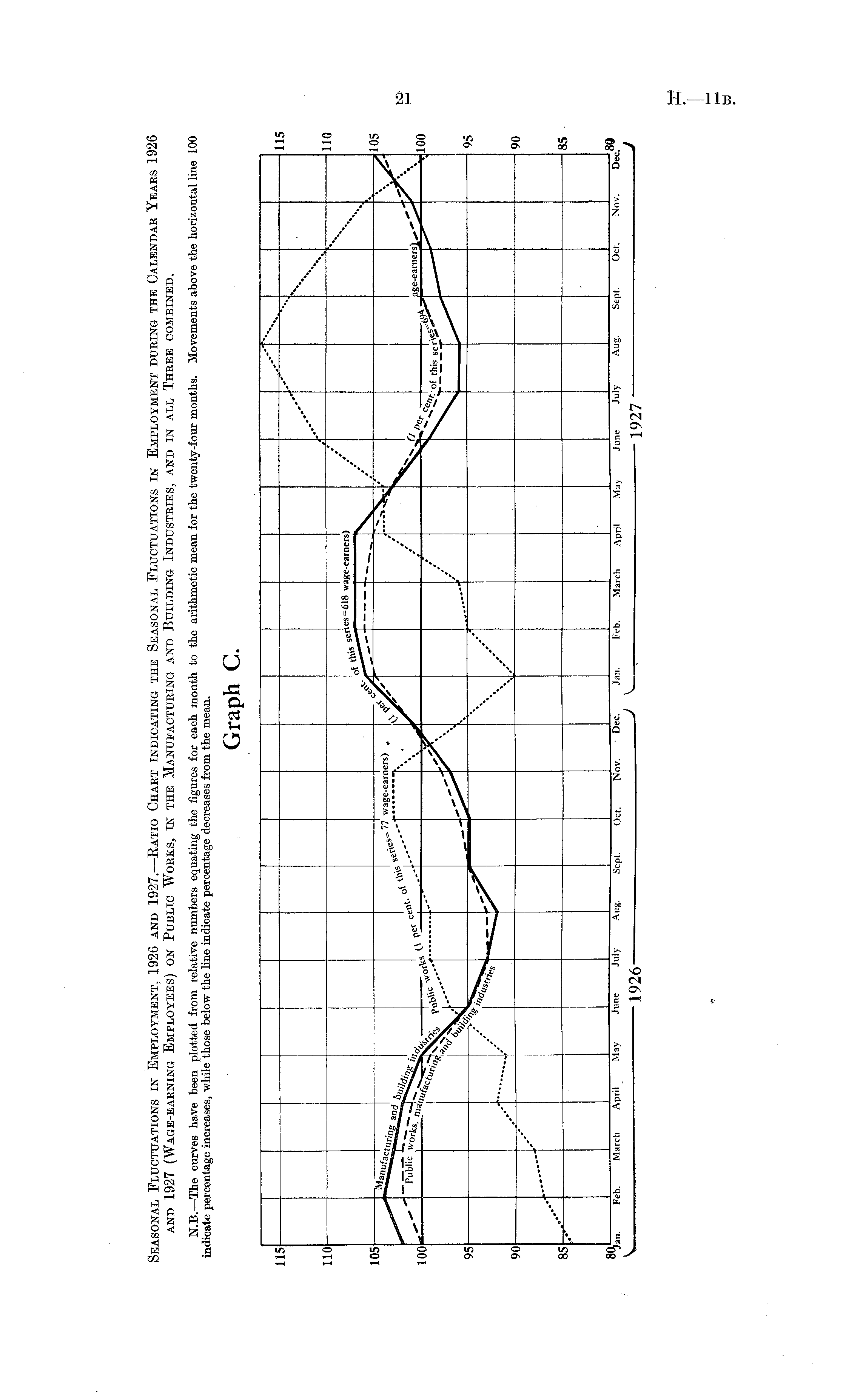 Seasonal Fluctuations in Employment, 1926 and 1927.— Ratio Chart indicating the Seasonal Fluctuations in Employment during the Calendar Years 1926 and 1927 (Wage-earning Employees) on Public Works, in the Manufacturing and Building Industries, and in all Three combined. N.B.—The curves have been plotted from relative numbers equating the figures for each month to the arithmetic mean for the twenty -four months. Movements above the horizontal line 100 indicate percentage increases, while those below the line indicate percentage decreases from the mean.