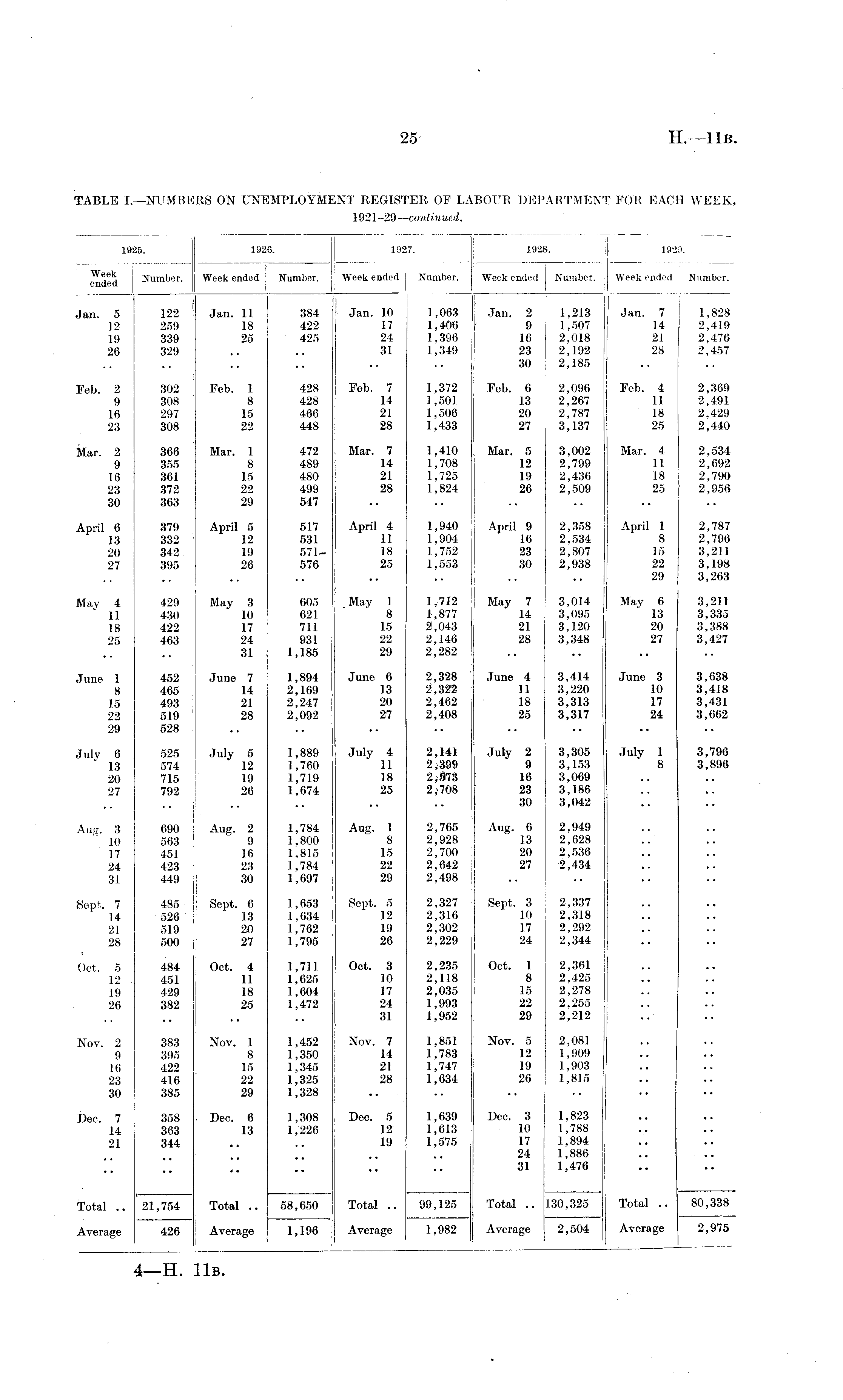 TABLE I.—NUMBERS ON UNEMPLOYMENT REGISTER OF LABOUR DEPARTMENT FOR EACH WEEK, 1921-29—continued.