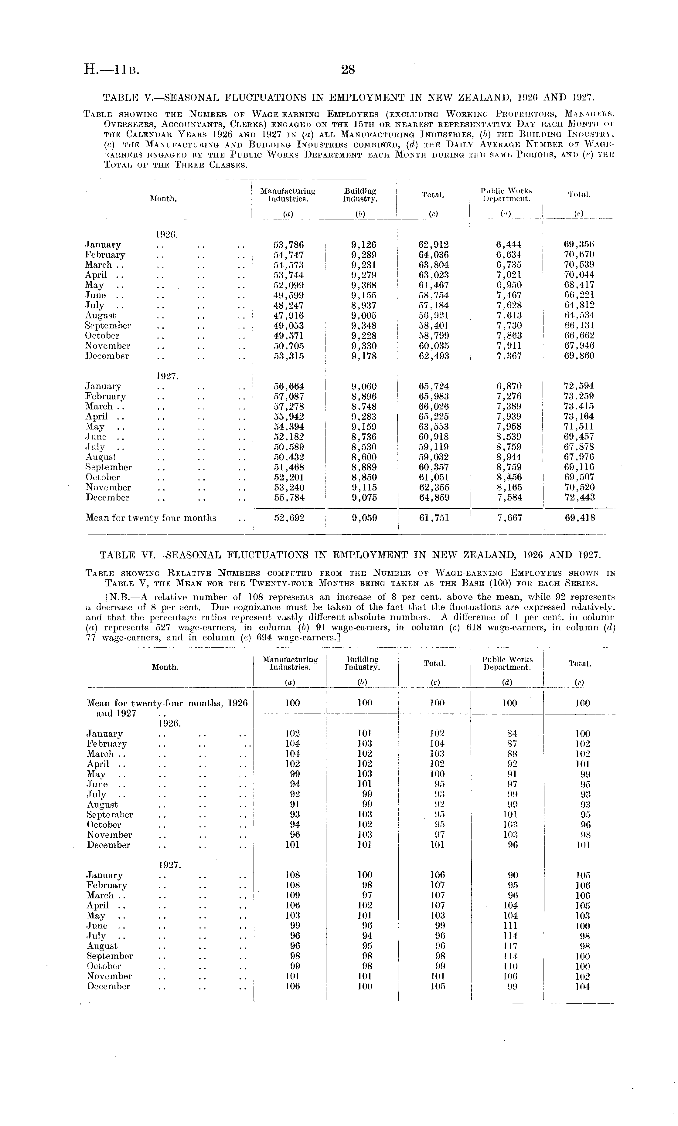 TABLE V.—SEASONAL FLUCTUATIONS IN EMPLOYMENT IN NEW ZEALAND, 1920 AND 1927. Table showing the Number of Wage-earning Employees (excluding Working Proprietors, Managers, Overseers, Accountants, Clerks) engaged on the 15th or nearest representative Day each Month of the Calendar Years 1926 and 1927 in (a) all Manufacturing Industries, (b) the Building Industry, (c) the Manufacturing and Building Industries combined, (d) the Daily Average Number of Wageearners engaged by the Public Works Department each Month during the same Perious, and (e) the Total of the Three Classes.