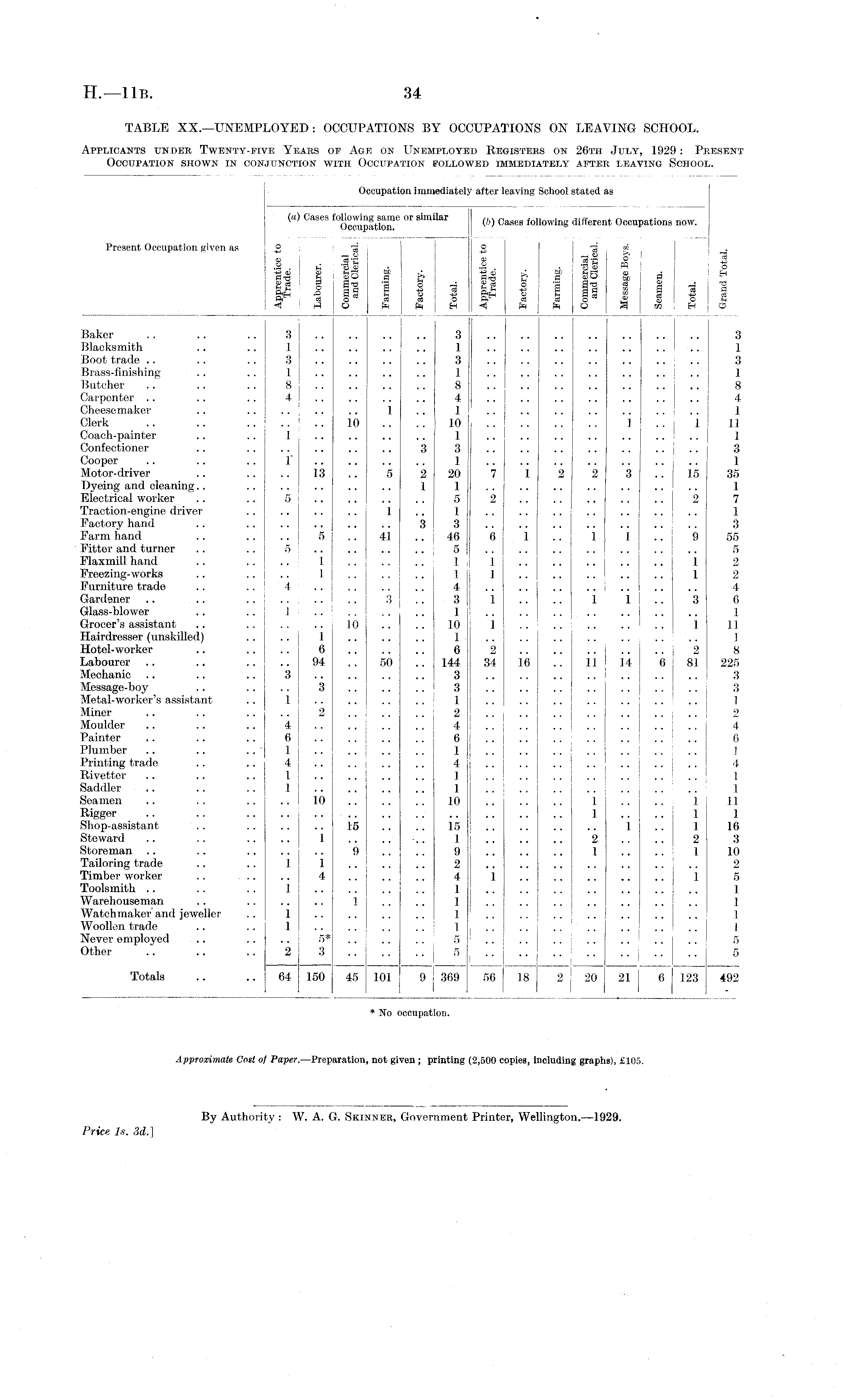 TABLE XX.—UNEMPLOYED: OCCUPATIONS BY OCCUPATIONS ON LEAVING SCHOOL. Applicants under Twenty-five Years of Age on Unemployed Registers on 26th July, 1929: Present Occupation shown in conjunction with Occupation followed immediately after leaving School.