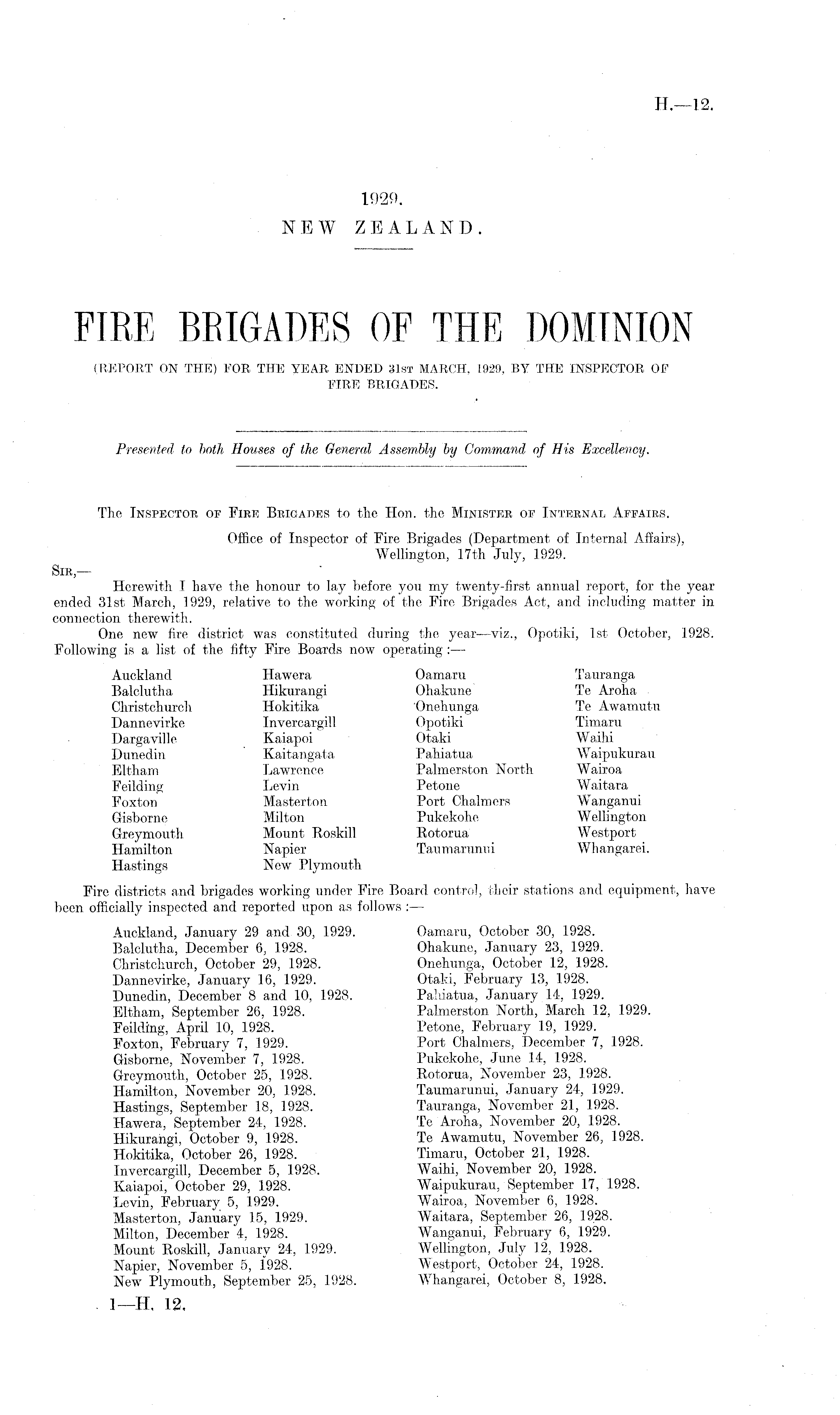The Inspector of Fire Brigades to the Hon. the Minister of Internal Affairs. Office of Inspector of Fire Brigades (Department of Internal Affairs), Wellington, 17th July, 1929. Sir, — Herewith I have the honour to lay before you my twenty-first annual report, for the year ended 31st March, 1929, relative to the working of the Fire Brigades Act, and including matter in connection therewith. One new fire district was constituted during the year —viz., Opotiki, Ist October, 1928. Following is a list of the fifty Fire Boards now operating : — Auckland Hawera Oamaru Tauranga Balclutha Hikurangi Ohakune Te Aroha Christchurch Hokitika Onehunga Te Awamutu Dannevirke Invercargill Opotiki Timaru Dargaville Kaiapoi Otaki Waihi Dunedin Kaitangata Pahiatua Waipukurau Eltham Lawrence Palmerston North Wairoa Feilding Levin Petone Waitara Foxton Masterton Port Chalmers Wanganui Gisborne Milton Pukekohe Wellington Greymouth Mount Roskill Rotorua Westport Hamilton Napier Taumarumii Whangarei. Hastings New Plymouth Fire districts and brigades working under Fire Board control, their stations and equipment, have been officially inspected and reported upon as follows : — Auckland, January 29 and 30, 1929. Oamaru, October 30, 1928. Balclutha, December 6, 1928. Ohakune, January 23, 1929. Christchurch, October 29, 1928. Onehunga, October 12, 1928. Dannevirke, January 16, 1929. Otaki, February 13, 1928. Dunedin, December 8 and 10, 1928. Pahiatua, January 14, 1929. Eltham, September 26, 1928. Palmerston North, March 12, 1929. Feilding, April 10, 1928. Petone, February 19, 1929. Foxton, February 7, 1929. Port Chalmers, December 7, 1928. Gisborne, November 7, 1928. Pukekohe, June 14, 1928. Greymoutli, October 25, 1928. Rotorua, November 23, 1928. Hamilton, November 20, 1928. Taumarunui, January 24, 1929. Hastings, September 18, 1928. Tauranga, November 21, 1928. Hawera, September 24, 1928. Te Aroha, November 20, 1928. Hikurangi, October 9, 1928. Te Awamutu, November 26, 1928. Hokitika, October 26, 1928. Timaru, October 21, 1928. Invercargill, December 5, 1928. Waihi, November 20, 1928. Kaiapoi, October 29, 1928. Waipukurau, September 17, 1928. Levin, February 5, 1929. Wairoa, November 6, 1928. Masterton, January 15, 1929. Waitara, September 26, 1928. Milton, December 4, 1928. Wanganui, February 6, 1929. Mount Roskill, January 24, 1929. Wellington, July 12, 1928. Napier, November 5, 1928. Westport, October 24, 1928. New Plymouth, September 25, 1928. Whangarei, October 8, 1928.