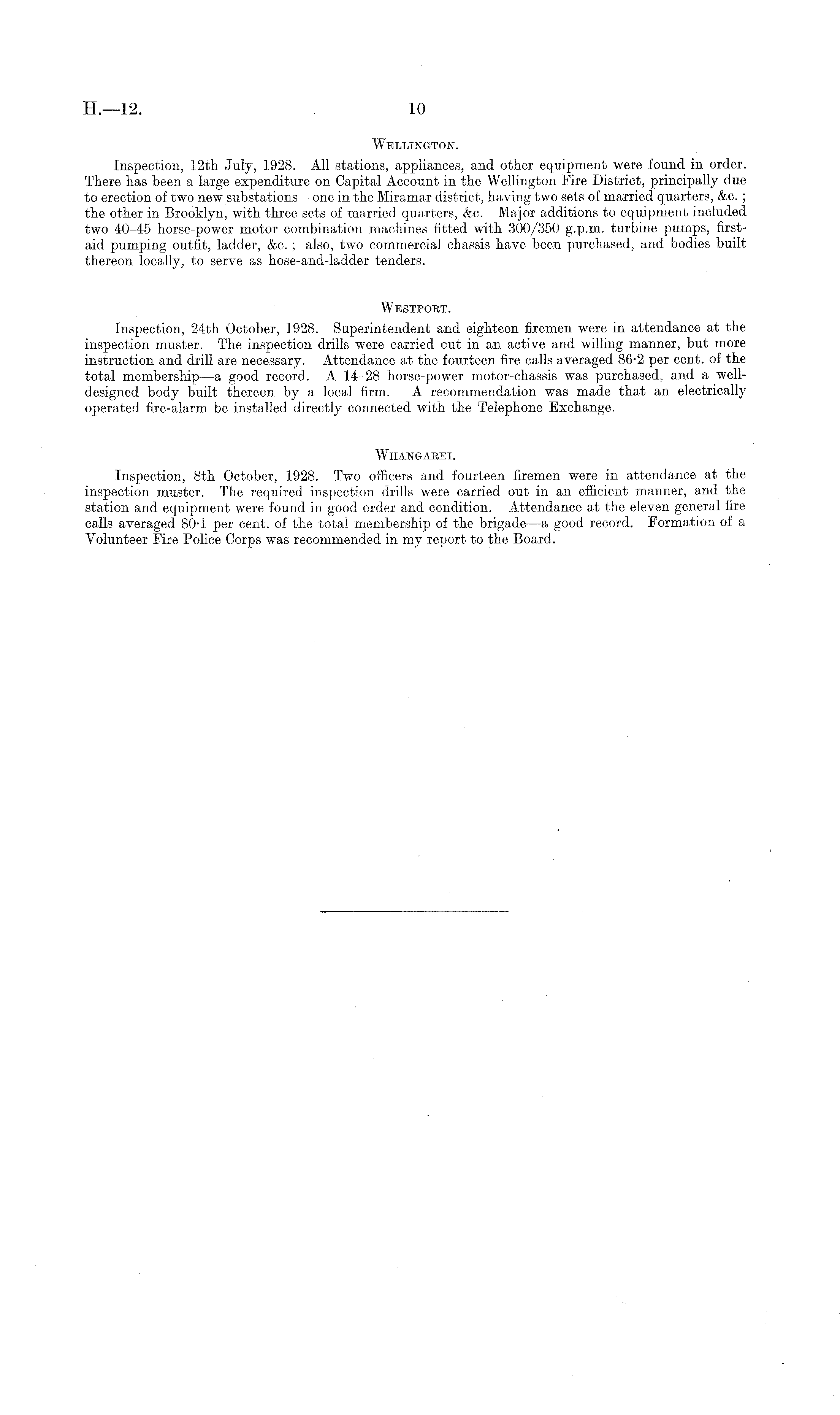 Wellington. Inspection, 12th July, 1928. All stations, appliances, and other equipment were found in order. There has been a large expenditure on Capital Account in the Wellington Fire District, principally due to erection of two new substations —one in the Miramar district, having two sets of married quarters, &c. ; the other in Brooklyn, with three sets of married quarters, &c. Major additions to equipment included two 40-45 horse-power motor combination machines fitted with 300/350 g.p.m. turbine pumps, firstaid pumping outfit, ladder, &c. ; also, two commercial chassis have been purchased, and bodies built thereon locally, to serve as hose-and-ladder tenders. Westport. Inspection, 24th October, 1928. Superintendent and eighteen firemen were in attendance at the inspection muster. The inspection drills were carried out in an active and willing manner, but more instruction and drill are necessary. Attendance at the fourteen fire calls averaged 86-2 per cent, of the total membership —a good record. A 14-28 horse-power motor-chassis was purchased, and a welldesigned body built thereon by a local firm. A recommendation was made that an electrically operated fire-alarm be installed directly connected with the Telephone Exchange. Whangarei. Inspection, Bth October, 1928. Two officers and fourteen firemen were in attendance at the inspection muster. The required inspection drills were carried out in an efficient manner, and the station and equipment were found in good order and condition. Attendance at the eleven general fire calls averaged 80-1 per cent, of the total membership of the brigade —a good record. Formation of a Volunteer Fire Police Corps was recommended in my report to the Board.