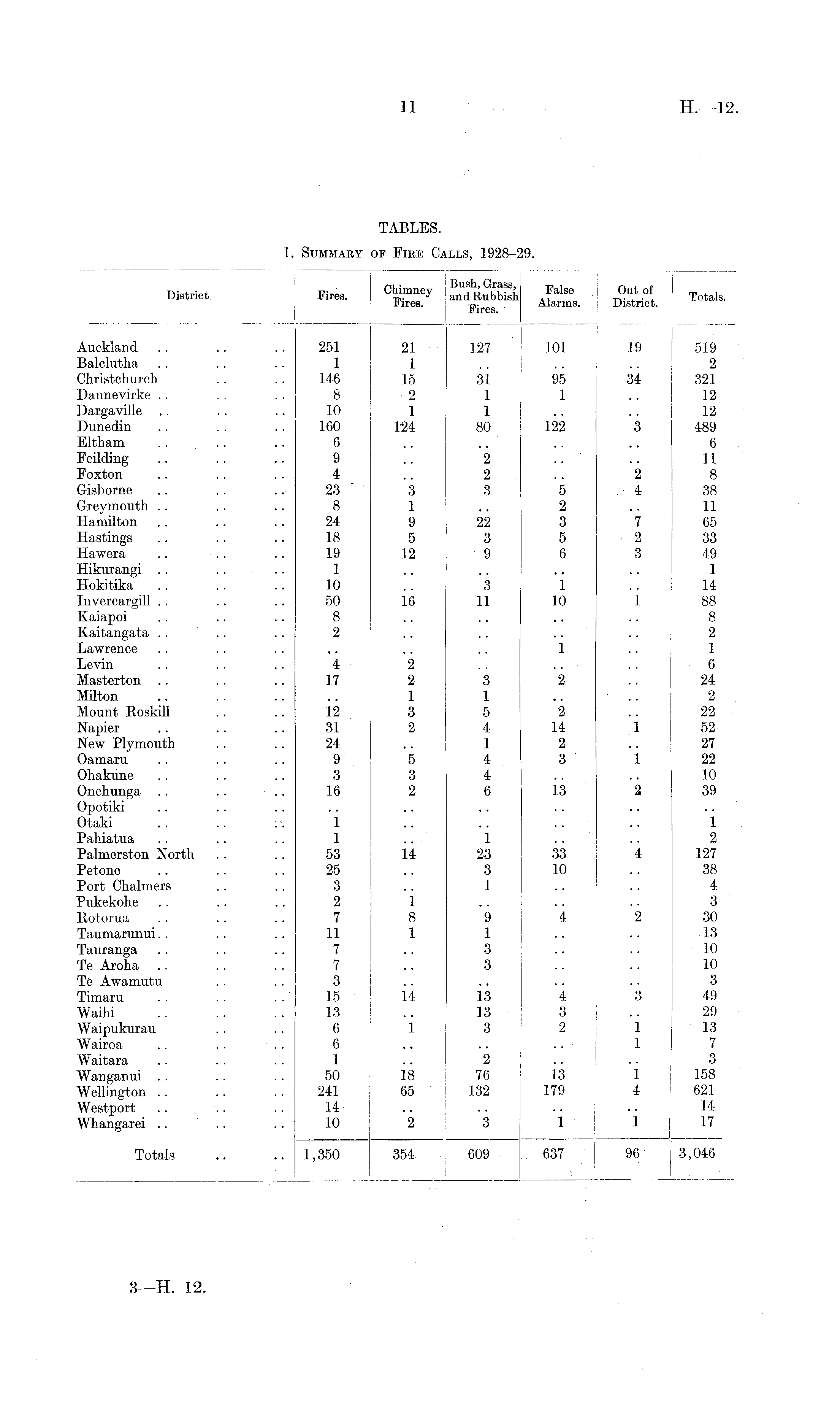 District Fires. ! C^ imne y j «"dRubS A f alse : * ' Totals. 4 ires. Fires Alarms. District. ' | Auckland .. .. .. 251 21 127 101 19 519 Balclutha .. .. .. 1 1 .. .. .. 2 Christchurch .. .. 146 15 31 95 34 321 Dannevirke .. . . . . 8 2 1 1 . . 12 Dargaville .. . . . . 10 1 1 .. . . 12 Dunedin .. .. . . 160 124 80 122 3 489 Eltham .. .. .. 6 .. .. .. .. 6 Feilding .. .. .. 9 .. 2 .. .. 11 Foxton .. .. .. 4 .. 2 .. 2 8 Gisborne .. .. 23 3 3 5 4 38 Greymouth .. .. .. 8 1 .. 2 .. 11 Hamilton .. .. 24 9 22 3 7 65 Hastings .. .. 18 5 3 5 2 33 Hawera .. .. 19 12 9 6 3 49 Hikurangi .. . . .. 1 .. .. .. .. 1 Hokitika .. .. .. 10 ,, 3 1 .. 14 Invercargill . . .. .. 50 16 11 10 1 88 Kaiapoi .. .. .. 8 .. .. .. .. 8 Kaitangata . . .. .. 2 .. .. .. .. 2 Lawrence .. .. .. .. .. .. 1 .. 1 Levin .. .. .. 4 2 .. .. .. 6 Masterton .. .. 17 2 3 2 .. 24 Milton .. .. .. .. 1 1 .. .. 2 Mount Roskill .. ..12 3 5 2 .. 22 Napier .. .. 31 2 4 14 1 52 New Plymouth .. 24 .. 1 2 .. 27 Oamaru .. .. .. 9 5 4 3 1 22 Ohakune . . . . . . 3 3 4 .. .. 10 Onehunga . . . . 16 2 6 13 2 39 Opotiki Otaki .. .. .. 1 .. .. .. .. 1 Pahiatua .. .. .. 1 .. 1 .. .. 2 Palmerston North . . .. 53 14 23 33 4 127 Petone .. .. ..25 .. 3 10 .. 38 Port Chalmers . . . . 3 .. 1 .. .. 4 Pukekohe .. .. .. 2 1 .. .. .. 3 Rotorua .. .. .. 7 8 9 4 2 30 Taumarunui.. .. .. 11 1 1 .. .. 13 Tauranga . . . . .. 7 .. 3 .. .. 10 Te Aroha . . . . .. 7 .. 3 .. .. 10 Te Awamutu .. .. 3 .. .. .. .. 3 Timaru .. .. 15 14 13 4 3 49 Waihi .. .. ..13 .. 13 3 .. 29 Waipukurau .... 6 1 3 2 1 13 Wairoa .. .. .. 6 .. .. I 1 7 Waitara .. . . . . 1 .. 2 .... 3 Wanganui . . .. .. 50 18 76 13 1 158 Wellington . . . . . . 241 65 132 179 i 4 621 Westport .. .. .. 14 .. .. .. .. 14 Whangarei . . . . 10 2 3 1 1 17 Totals .. ..1,350 354 609 637 | 96 3,046