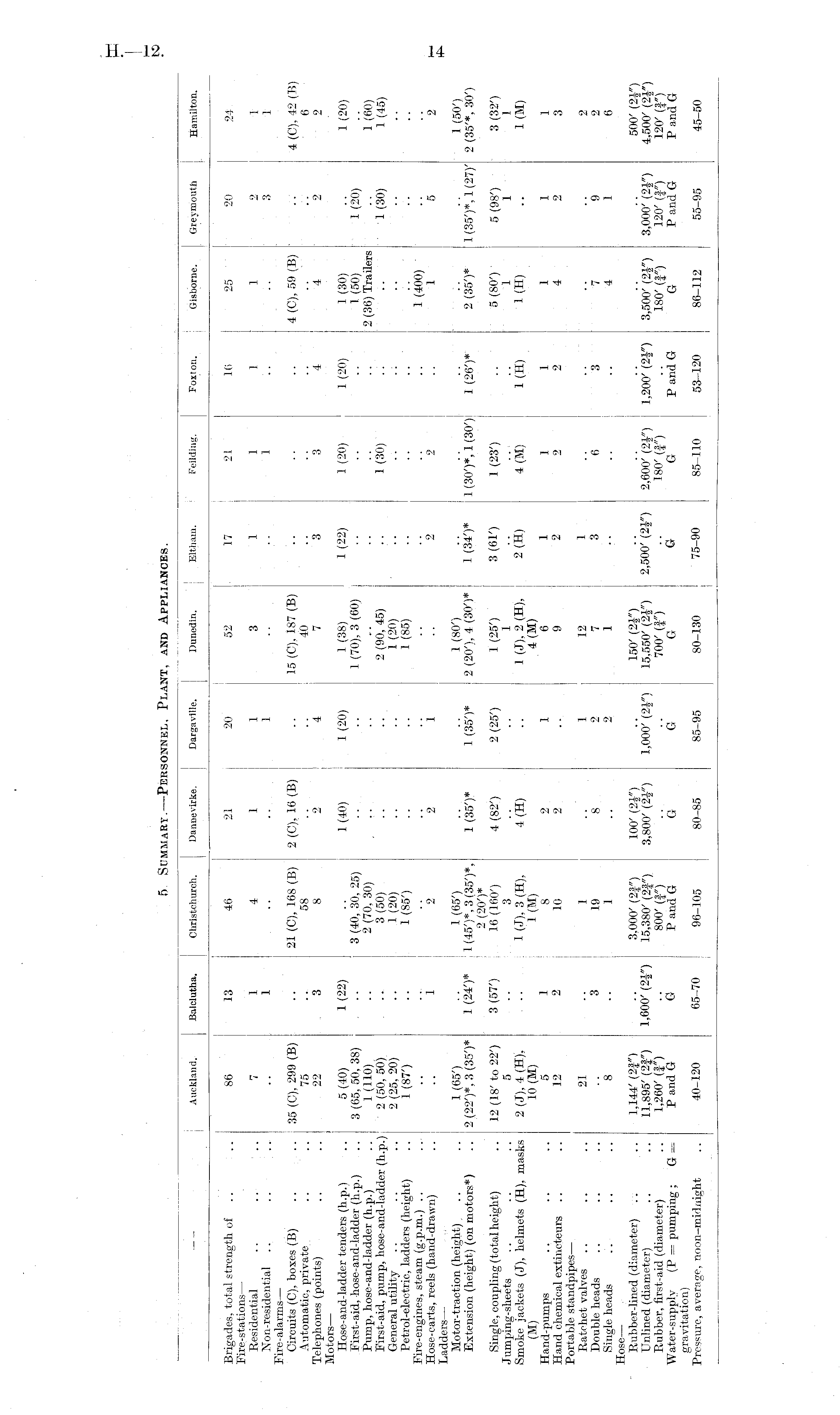I Auckland. Balclufcha. Christcliurch. Dannevirke. Dargavilie. Dunedin, : Eltham. I Feiidiug. Foxton. Gisborne. Greymouth Hamilton. Brigades, total strength of .... 86 13 46 21 20 52 17 21 16 25 20 24. Fire-stations — ..... Residential .... .. 7 1 4 1 1 3 1 1 1 1 2 1 Non-residential ...... .. 1 .. .. 1 .. .. 1 .. .. 3 1 Fire-alarms — Circuits (C), boxes (B) .. .. 35 (C), 299 (B) .. 21 (C), 168 (B) 2 (C), 16 (B) .. 15 (C), 187 (B) .. . . .. 4 (C), 59 (B) .. 4 (€), 42 (B) Automatic, private .. .. 75 .. 58 .. .. 40 .. .. .. .. .. 6 Telephones (points) .... 22 3 8 2 4 7 3 3 4 4 2 2 Motors — Hose-and-ladder tenders (h.p.) .. 5 (40) 1 (22) .. 1 (40) 1 (20) 1 (38) 1 (22) 1 (20) 1 (20) 1 (30) .. 1 (20) First-aid, hose-and-ladder (h.p.) .. 3 (65, 50, 38) ... 3 (40, 30, 25) .. .. 1 (70), 3 (60) .. .. .. 1 (50) 1 (20) Pump, hose-and-ladder (h.p.) .. 1 (110) .. 2 (70,30) ... .. .. .. .. 2 (36) Trailers .. 1(60) First-aid, pump, hose-and-ladder (h.p.) 2 (50, 50) .. 3 (50) .. .. 2 (90, 45) .. 1 (30) .. .. 1 (30) 1 (45) General utility .. .. .. 2 (25, 20) ... 1 (20) .. .. 1 (20) Petrol-electric, ladders (height) .. 1 (87') .. 1 (85') .. .. 1 (85) .. .. Fire-engines, steam (g.p.m.) .. .. .. .. .. .. .. .. .. .. .. 1 (400) Hose-carts, reels (hand-drawn) .... 1 2 2 1 .. 2 2 .. 1 5 2 Ladders — Motor-traction (height) .. .. 1 (65') • • 1 (65') .. .. 1 (80') I .. .. .. .. .. 1 (50') Extension (height! (on motors*) .. 2 (22')*, 3 (35')* 1(24')* 1 (45')*, 3 (35')*, 1(35')* 1(35')* 2 (20'), 4 (30')* 1 1(34')* 1 (30')*, 1 (30') 1(26')* 2(35')* 1 (35')*, 1 (27)' 2 (35'*, 30') 2 (20' j* Single, coupling (total height) .. 12 (18' to 22') 3(57') 16(160') 4(82') 2(25') 1(25') 3(61') 1(23') .. 5(80') 5(98') 3(32') Jumjiing-sheets ...... 5 •• 3 .. .. 1 •• .. .. 1 1 1 Smoke jackets (J), helmets (H), masks 2 (J), 4 (H), ■ ■ 1 (J), 3 (H), 4 (H) .. 1 (J), 2 (H), 2 (H) 4 (M) 1 (H) 1 (H) .. 1 (M) (M) 10 (M) 1 (M) 4 (M) Hand-pumps ......5 1 8 2 1 6 1 1 1 1 1 1 Hand chemical extincteurs .... 12 2 10 2 .. 9 2 2 2 4 2 3 Portable standpipes —. Ratchet valves ...... 21 ■ ■ 1 .. 1 12 1 .. .. .. .. 2 Double heads ........ 3 19 8 2 7 3 6 3 7 9 2 Single heads ...... 8 • • 1 .. 2 1 • • .. .. 4 1 6 Hose — Rubber-lined (diameter) .. .. 1,144' (2f") .. 3.000' (2f") 100' (2§") .. 150' (2J") .. .. .. .. .. 500' (2f") Unlined (diameter) .. .. 11,895' (2f") 1,600' (2J") 15,380' (2f") 3,800' (2±") 1,000' (2|"> 15,550' (2J") 2,500' (2§") 2,600' 1,200' (2J") 3,500' (2J") 3,000' (2J") 4,500' (21") Rubber, first-aid (diameter) .. 1,260' (J") .. 800' (§") .. .. 700' (§") ■ • 180' (f") .. 180' (J"-) 120' (f") 120' (J") Water-supply (P = pumping; G = P and G G P and G G G G G G P and G G P and. G P and G gravitation) Pressure, average, noon-midnight .. 40-120 65-70 96-105 80-85 85-95 80-130 j 75-90 85-110 53-120 86-112 55-95 45-50