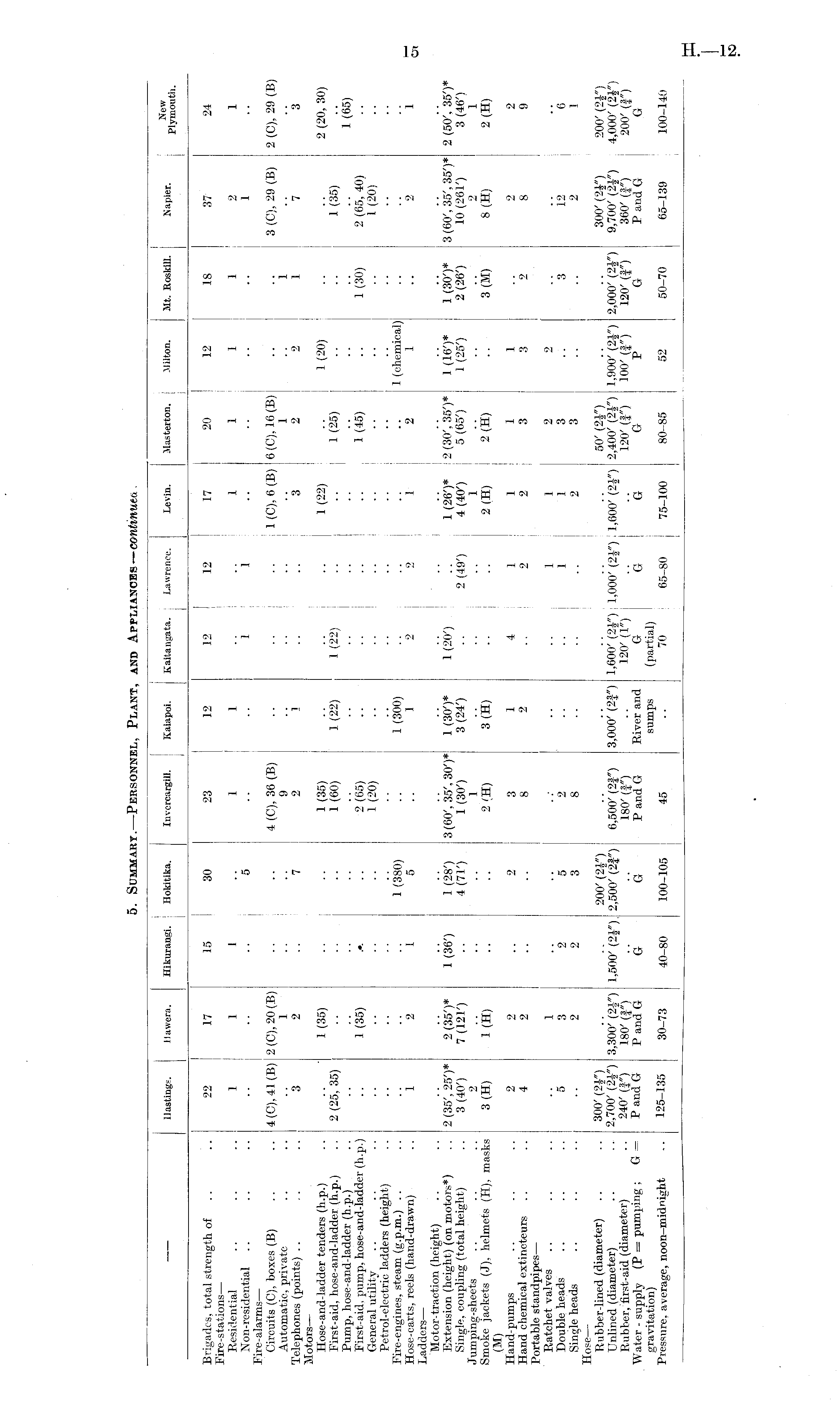 —- — Hastings. Ilawera. Hikurangi. Ilokitika. Invcrcargill. Kaiapoi. Kaitangata. , Lawrence. Levin. Masterton. Milton. J Mt. Roskill. Napier. Plymouth | i | • | I • I Brigades, total strength of .. .. 22 17 15 ! 30 23 12 12 j 12 17 20 12 18 37 24 Fire-stations — Residential ...... 1 1 I .. 1 1 .. I 1 1 1 1 2 1 Non-residential .. .. .. .. .. .. 5 .. .. 1 1 .. .. .. .. 1 Fire-alarms — Circuits (C), boxes (B) .. .. 4 (C), 41 (B) 2 (C), 20 (B) .. .. 4 (C), 36 (B) .. .. .. 1 (C), 6 (B) 6(C), 16(B) .. .. 3 (C), 29 (B) 2 (C), 29 (B) Automatic, private .. .. .. 1 .. .. 9 .. .. .. .. 1 .. 1 Telephones (points) ......3 2 .. 7 2 ! .. .. 3 2 2 1 7 3 Motors — Hose-and-ladder tenders (h.p.) .. .. 1 (35) .. .. 1 (35) .. .. .. 1 (22) .. 1 (20) .. .. 2 (20, 30) First-aid, hose-and-ladder (h.p.) .. 2 (25, 35) .. .. .. .1 (60) 1 (22) 1 (22) .. .. 1 (25) .. .. 1 (35) Pump, hose-and-ladder (b.p.) .. .. .. .. .. .. .. .. j .. .. 1 .. .. .. .. 1 (65) First-aid, pump, hose-and-ladder (h.p.) .. 1(35) .. 2 (65) .. .. .. ... 1 (45) .. 1 (30) 2 (65,40) General utility .. .. .. .. .. .. .. 1 (20) .. .. .. .. .. .. .. I (20) Petrol-electric ladders (height) .. .. .. .. .. .. .. .. .. j Fire-engines, steam (g.p.m.) .. .. . . .. .. 1 (380) .. 1 (300) .. .. .. .. 1 (chemical) Hose-carts, reels (hand-drawn) ..1 2 1 5 .. 1 2 2 1 2 1 .. 2 1 Ladders — Motor-traction (height) Extension (height) (on motors*) .. 2 (35', 25')* 2(35')* 1(36') 1(28') 3 (60', 35', 30')* 1(30')* 1(20') .. 1(26')* 2 (30', 35')* 1(16')* 1(30')* 3 (60', 35', 35')* 2 (50', 35')* Single, coupling (total height) .. 3(40') 7(121') .. 4(71') 1(30') 3(24') .. 2(49') 4(40') 5(65') 1(25') 2(26') 10(261') 3(46') Jumping-sheets .. .. .. 2 .. .. .. 1 .. .. .. 1 .. .. .. 2 1 Smoke jackets (J), helmets (H), masks 3 (H) 1 (H) .. .. 2 'H) 3 (H) .. .. 2 (H) I 2 (H) .. 3 (M) 8 (H) 2 (H) (M) ' j Hand-pumps ...... 2 2 .. 2 3 1 4 1 1 1 1 .. 2 2 Hand chemical extincteurs ....4 2 .. .. 8 2 .. 2 2 3 3 2 8 9 Portable standpipes — Ratchet valves .. .. .. .. 1 .. .. . .■ .. .. 1 1 2 2 .. .. I Double heads ...... 5 3 2 5 2 .. .. 1 1 3 .. 3 12 6 Single heads ...... .. 2 2 3 8 .. .. 2 3 .. .. 2 I Hose — Rubber-lined (diameter) .. .. 300' (2£*) .. .. 200' (2|") .. .. .. .. .. 50' (2J") .. .. 300' (2|") 200' (2J") Unlined (diameter) .. ... 2,700' (2£") 3,300' (2£") 1,500' (21") 2,500' (2f") 6,500' (2f") 3,000' (2f") 1,600' (2f") 1,000' (2J") 1,600' (2J") 2,400' (2J") 1,900' (2|") 2,000' (2|") 9,700' (2J") 4,000' (2£") Rubber, first-aid (diameter) .. 240' (f") 180' (f") .. .. 180' (f") .. 120' (1") .. .. 120' (f) 100' (f") 120' (f") 360' (f") 200' (J") Water - supply (P = pumping; G = P and G P and G G G P and G River and G G G G P G P and G G gravitation) sumps (partial) Pressure, average, noon-midnight .. 125-135 30-73 40-80 100-105 45 .. 70 65-80 75-100 80-85 52 50-70 65-139 100-140 ; ' ' ' I