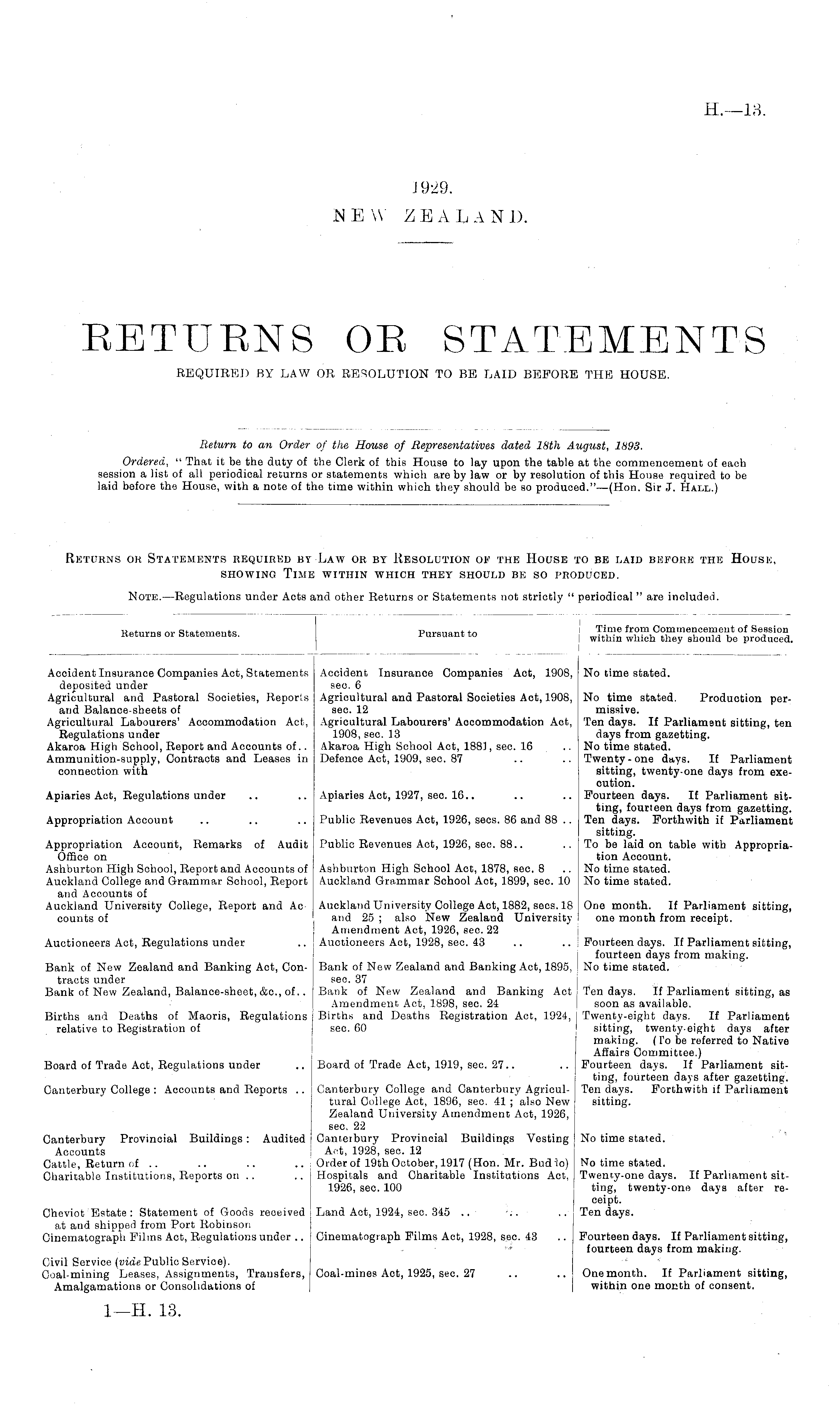 Return to an Order of the House of Representatives dated 18th August, 1893. Ordered, " That it be the duty of the Clerk of this House to lay upon the table at the commencement of each session a list of all periodical returns or statements which are by law or by resolution of this House required to be laid before the House, with a note of the time within which they should be so produced."—(Hon. Sir J. Hall.)