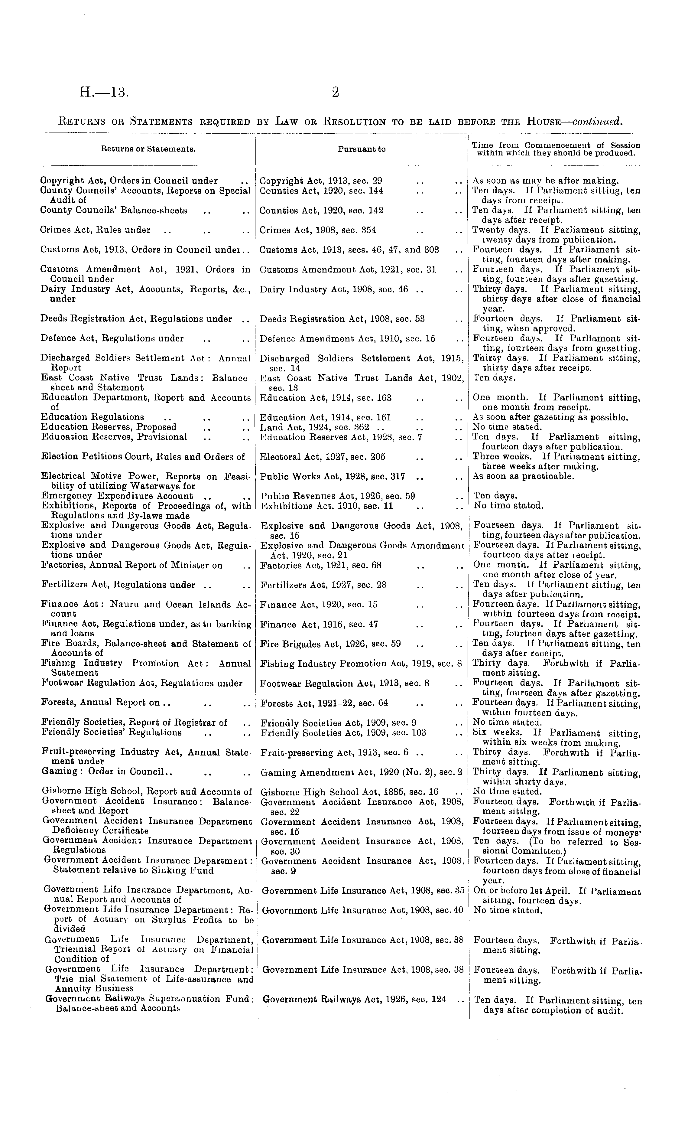 Returns or Statements Pursuant, to Time (rom Commencement of Session returns or statements. Pursuant to within which they should be produced. Copyright Act, Orders in Council under .. Copyright Act, 1913, sec. 29 .. .. As soon as may be after making. County Councils' Accounts, .Reports on Special Counties Act, 1920, sec. 144 .. .. Ten days. If Parliament sitting, ten Audit of days from receipt. County Councils' Balance-sheets .. .. Counties Act, 1920, sec. 142 .. .. Ten days. If Parliament sitting, ten days after receipt. Crimes Act, Rules under .. .. .. Crimes Act, 1908, sec. 354 .. .. Twenty days. If Parliament sitting, twenty days from publication. Customs Act, 1913, Orders in Council under.. Customs Act, 1913, sees. 46, 47, and 303 .. Fourteen days. If Parliament sitting, fourteen days after making. Customs Amendment Act, 1921, Orders in Customs Amendment Act, 1921, sec. 31 .. Fourteen days. If Parliament sitCouncil under ting, fourteen days after gazetting. Dairy Industry Act, Accounts, Reports, &c., Dairy Industry Act, 1908, sec. 46 .. .. Thirty days. If Parliament sitting, under thirty days after close of financial year. Deeds Registration Act, Regulations under .. Deeds Registration Act, 1908, seo. 53 .. Fourteen days. If Parliament sitting, when approved. Defence Act, Regulations under .. .. Defence Amandment Act, 1910, sec. 15 .. Fourteen days. If Parliament sitting, fourteen days from gazetting. Discharged Soldiers Settlement Act: Annual Discharged Soldiers Settlement Act, 1915, Thirty days. If Parliament sitting, Repurt sec. 14 thirty days after receipt. Bast Coast Native Trust Lands: Balance- East Coast Native Trust Lands Aot, 1902, Ten days. sheet and Statement seo. 13 Education Department, Report and Accounts Education Act, 1914, sec. 163 .. .. One month. If Parliament sitting, of one month from receipt. Education Regulations .. .. .. Education Act, 1914, seo. 161 .. .. As soon after gazetting as possible. Education Reserves, Proposed .. .. Land Act, 1924, sec. 362 .. .. .. No time stated. Education Reserves, Provisional .. .. Education Reserves Act, 1928, sec. 7 .. Ten days. If Parliament sitting, fourteen days after publication. Election Petitions Court, Rules and Orders of Electoral Act, 1927, sec. 205 .. .. Three weeks. If Parliament Bitting, three weeks after making. Electrical Motive Power, Reports on Feasi- Public Works Act, 1928, sec. 317 .. .. As soon as practicable. bility of utilizing Waterways for Emergency Expenditure Account .. .. Public Revenues Act, 1926, sec. 59 .. Ten days. Exhibitions, Reports of Proceedings of, with Exhibitions Act. 1910, seo. 11 .. .. No time stated. Regulations and By-laws made Explosive and Dangerous Goods Act, Regula- Explosive and Dangerous Goods Act, 1908, Fourteen days. If Parliament sittions under sec. 15 ting, fourteen days after publication. Explosive and Dangerous Goods Act, Regula- Explosive and Dangerous Goods Amendment Fourteen days. If Parliament sitting, tions under Act. 1920, sec. 21 fourteen days after leceipt. Factories, Annual Report of Minister on .. Factories Aot, 1921, seo. 68 .. .. One month. If Parliament sitting, one month after close of year. Fertilizers Act, Regulations under .. .. Fertilizers Aot, 1927, seo. 28 .. .. Ten days. If Parliament sitting, ten days after publication. Finance Act: Nauru and Ocean Islands Ao- Finance Act, 1920, seo. 15 .. .. Fourteen days. If Parliament sitting, count within fourteen days from receipt. Finance Aot, Regulations under, as to banking Finance Act, 1916, sec. 47 .. .. Fourteen days. If Parliament sitand loans ting, fourteen days after gazetting. Fire Boards, Balance-sheet and Statement of Fire Brigades Act, 1926, sec. 59 .. .. Ten days. If Parliament sitting, ten Accounts of days after receipt. Fishing Industry Promotion Act : Annual Fishing Industry Promotion Act, 1919, sec. 8 Thirty days. Forthwith if ParliaStatement ment sitting. Footwear Regulation Act, Regulations under Footwear Regulation Aot, 1913, sec. 8 .. Fourteen days. If Parliament sitting, fourteen days after gazetting. Forests, Annual Report on .. .. .. Forests Act, 1921-22, sec. 64 .. .. Fourteen day3. If Parliament sitting, within fourteen days. Friendly Societies, Report of Registrar of .. Friendly Societies Act, 1909, sec. 9 .. No time stated. Friendly Societies' Regulations .. .. Friendly Societies Act, 1909, sec. 103 .. Six weeks. If Parliament sitting, within six weeks from making. Fruit-preserving Industry Aot, Annual State- Fruit-preserving Act, 1913, seo. 6 .. .. Thirty days. Forthwith if Parliament under ment sitting. Gaming: Order in Council.. .. .. Gaming Amendment Act, 1920 (No. 2), sec. 2 Thirty days. If Parliament sitting, within thirty days. Gisborne High School, Report and Accounts of Gisborne High School Act, 1885, sec. 16 .. No time stated. Government Acoident Insurance: Balance- Government Accident Insurance Act, 1908, Fourteen days. Forthwith if Parliasheet and Report 1 seo. 22 ment sitting. Government Accident Insurance Department Government Accident Insurance Aot, 1908, Fourteen days. If Parliament sitting, Deficiency Certificate | sec. 15 fourteen days from issue of moneysGovernment Accident Insurance Department Government Accident Insurance Act, 1908, Ten days. (To be referred to SesRegulations j sec. 30 sional Committee.) Government Accident Insurance Department: Government Accident Insurance Act, 1908, Fourteen days. If Parliament sitting, Statement relative to Sinking Fund sec. 9 fourteen days from close of financial year. Government Life Insurance Department, An- Government Life Insurance Act, 1908, sec. 35 : On or before 1st April. If Parliament nual Report and Accounts of ! sitting, fourteen days. Government Life Insurance Department: Re- Government Life Insurance Act, 1908, sec. 40 No time stated. port of Actuary on Surplus Profits to be divided Government Life Insurance Department, Government Life Insurance Act, 1908, sec. 38 Fourteen days. Forthwith if ParliaTriennial Repor