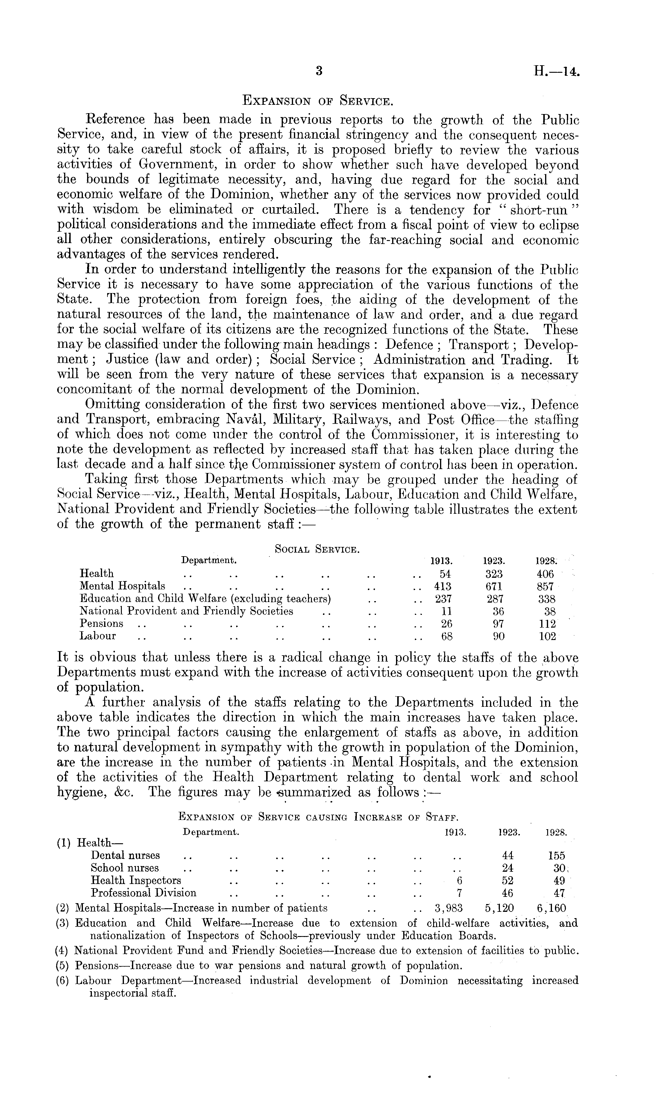 Expansion of Service. Reference has been made in previous reports to the growth of the Public Service, and, in view of the present financial stringency and the consequent necessity to take careful stock of affairs, it is proposed briefly to review the various activities of Government, in order to show whether such have developed beyond the bounds of legitimate necessity, and, having due regard for the social and economic welfare of the Dominion, whether any of the services now provided could with wisdom be eliminated or curtailed. There is a tendency for " short-run " political considerations and the immediate effect from a fiscal point of view to eclipse all other considerations, entirely obscuring the far-reaching social and economic advantages of the services rendered. In order to understand intelligently the reasons for the expansion of the Public Service it is necessary to have some appreciation of the various functions of the State. The protection from foreign foes, the aiding of the development of the natural resources of the land, the maintenance of law and order, and a due regard for the social welfare of its citizens are the recognized functions of the State. These may be classified under the following main headings : Defence ; Transport; Development ; Justice (law and order) ; Social Service ; Administration and Trading. It will be seen from the very nature of these services that expansion is a necessary concomitant of the normal development of the Dominion. Omitting consideration of the first two services mentioned above —viz., Defence and Transport, embracing Naval, Military, Railways, and Post Office—the staffing of which does not come under the control of the Commissioner, it is interesting to note the development as reflected by increased staff that has taken place during the last decade and a half since the Commissioner system of control has been in operation. Taking first those Departments which may be grouped under the heading of Social Service —viz., Health, Mental Hospitals, Labour, Education and Child Welfare, National Provident and Friendly Societies—the following table illustrates the extent of the growth of the permanent staff : — Social Service. Department. 1913. 1923. 1928. Health .. .. .. .. .. .. 54 323 406 Mental Hospitals .. .. .. .. .. .. 413 671 857 Education and Child Welfare (excluding teachers) .. .. 237 287 338 National Provident and Friendly Societies .. .. 11 36 38 Pensions .. .. .. .. .. .. 26 97 112 Labour .. .. .. .. .. .. 68 90 102 It is obvious that unless there is a radical change in policy the staffs of the above Departments must expand with the increase of activities consequent upon the growth of population. A further analysis of the staffs relating to the Departments included in the above table indicates the direction in which the main increases have taken place. The two principal factors causing the enlargement of staffs as above, in addition to natural development in sympathy with the growth in population of the Dominion, are the increase in the number of patients in Mental Hospitals, and the extension of the activities of the Health Department relating to dental work and school hygiene, &c. The figures may be •summarized as follows : —- Expansion of Service causing Increase of Staff. Department. 1913. 1923. 1928. (1) HealthDental nurses .. .. .. .. .. .. .. 44 155 School nurses .. .. .. .. .. .. .. 24 30, Health Inspectors .. .. .. .. .. 6 52 49 Professional Division .. .. .. .. .. 7 46 47 (2) Mental Hospitals —Increase in number of patients .. .. 3,983 5,120 6,160 (3) Education and Child Welfare—lncrease due to extension of child-welfare activities, and nationalization of Inspectors of Schools—previously under Education Boards. (4) National Provident Fund and Friendly Societies—lncrease due to extension of facilities to public. (5) Pensions—lncrease due to war pensions and natural growth of population. (6) Labour Department—lncreased industrial development of Dominion necessitating increased inspectorial staff.