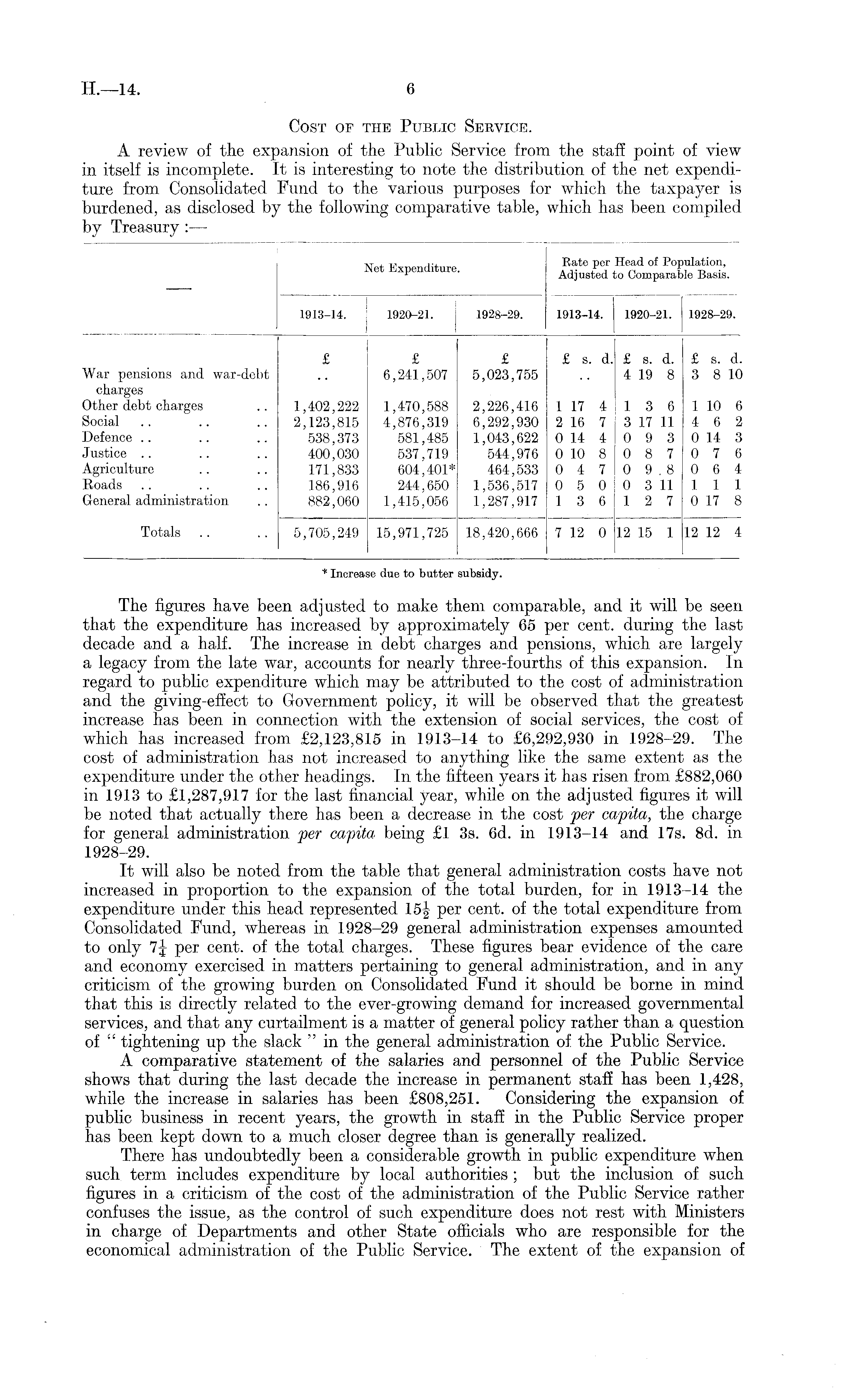 -f.T , T . ,Rate per Head of Population, JNet -Expenditure. f , , r, , T1 r Adjusted to Comparable Basis. I | 1913-14. 1920-21. 1928-29. 1913-14. I 1920-21. 1928-29. £ £ £ £ s. d. £ s. d. £ s. d. War pensions and war-debt .. 6,241,507 5,023,755 .. 4 19 8 3 8 10 charges Other debt charges .. 1,402,222 1,470,588 2,226,416 1 17 4 136 1 10 6 Social .. .. .. 2,123,815 4,876,319 6,292,930 2 16 7 3 17 11 4 6 2 Defence.. .. .. 538,373 581,485 1,043,622 0 14 4 093 0 14 3 Justice .. .. .. 400,030 537,719 544,976 0 10 8 087 076 Agriculture .. .. 171,833 604,401* 464,533 047 09.8 064 Roads .. .. .. 186,916 244,650 1,536,517 0 5 0 0 3 11 111 General administration .. 882,060 1,415,056 1,287,917 1 3 6 1 2 7 0 17 8 Totals .. .. 5,705,249 15,971,725 18,420,666 7 12 0 12 15 1 12 12 4 11 Increase due to butter subsidy.