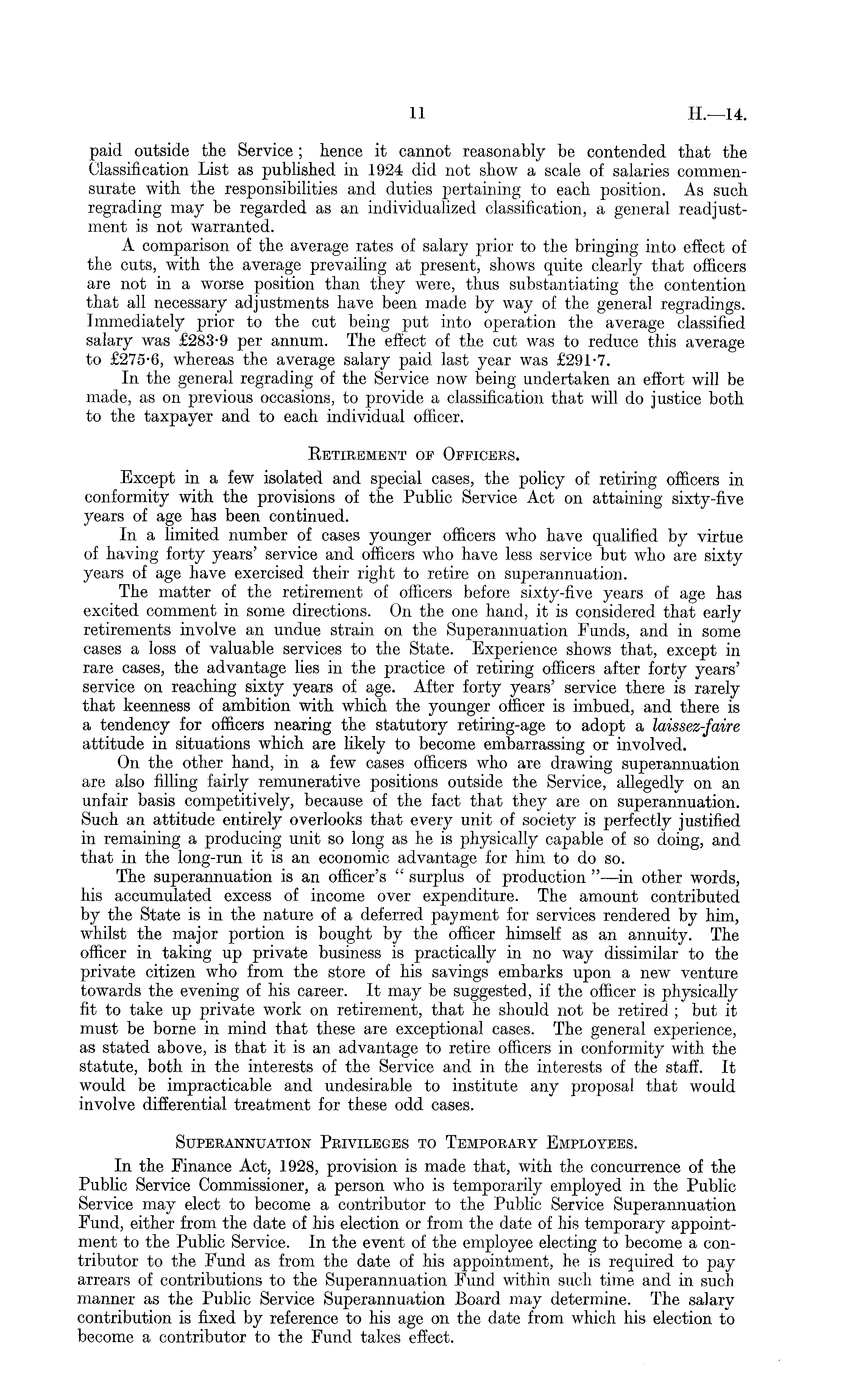 paid outside the Service; hence it cannot reasonably be contended that the Classification List as published in 1924 did not show a scale of salaries commensurate with the responsibilities and duties pertaining to each position. As such regrading may be regarded as an individualized classification, a general readjustment is not warranted. A comparison of the average rates of salary prior to the bringing into effect of the cuts, with the average prevailing at present, shows quite clearly that officers are not in a worse position than they were, thus substantiating the contention that all necessary adjustments have been made by way of the general regradings. Immediately prior to the cut being put into operation the average classified salary was £283-9 per annum. The effect of the cut was to reduce this average to £275-6, whereas the average salary paid last year was £291-7. In the general regrading of the Service now being undertaken an effort will be made, as on previous occasions, to provide a classification that will do justice both to the taxpayer and to each individual officer. Ketirement op Officers. Except in a few isolated and special cases, the policy of retiring officers in conformity with the provisions of the Public Service Act on attaining sixty-five years of age has been continued. In a limited number of cases younger officers who have qualified by virtue of having forty years' service and officers who have less service but who are sixty years of age have exercised their right to retire on superannuation. The matter of the retirement of officers before sixty-five years of age has excited comment in some directions. On the one hand, it is considered that early retirements involve an undue strain on the Superannuation Funds, and in some cases a loss of valuable services to the State. Experience shows that, except in rare cases, the advantage lies in the practice of retiring officers after forty years' service on reaching sixty years of age. After forty years' service there is rarely that keenness of ambition with which the younger officer is imbued, and there is a tendency for officers nearing the statutory retiring-age to adopt a laissez-faire attitude in situations which are likely to become embarrassing or involved. On the other hand, in a few cases officers who are drawing superannuation are also filling fairly remunerative positions outside the Service, allegedly on an unfair basis competitively, because of the fact that they are on superannuation. Such an attitude entirely overlooks that every unit of society is perfectly justified in remaining a producing unit so long as he is physically capable of so doing, and that in the long-run it is an economic advantage for him to do so. The superannuation is an officer's " surplus of production —in other words, his accumulated excess of income over expenditure. The amount contributed by the State is in the nature of a deferred payment for services rendered by him, whilst the major portion is bought by the officer himself as an annuity. The officer in taking up private business is practically in no way dissimilar to the private citizen who from the store of his savings embarks upon a new venture towards the evening of his career. It may be suggested, if the officer is physically fit to take up private work on retirement, that he should not be retired ; but it must be borne in mind that these are exceptional cases. The general experience, as stated above, is that it is an advantage to retire officers in conformity with the statute, both in the interests of the Service and in the interests of the staff. It would be impracticable and undesirable to institute any proposal that would involve differential treatment for these odd cases. Superannuation Privileges to Temporary Employees. In the Finance Act, 1928, provision is made that, with the concurrence of the Public Service Commissioner, a person who is temporarily employed in the Public Service may elect to become a contributor to the Public Service Superannuation Fund, either from the date of his election or from the date of his temporary appointment to the Public Service. In the event of the employee electing to become a contributor to the Fund as from the date of his appointment, he is required to pay arrears of contributions to the Superannuation Fund within such time and in such manner as the Public Service Superannuation Board may determine. The salary contribution is fixed by reference to his age on the date from which his election to become a contributor to the Fund takes effect.
