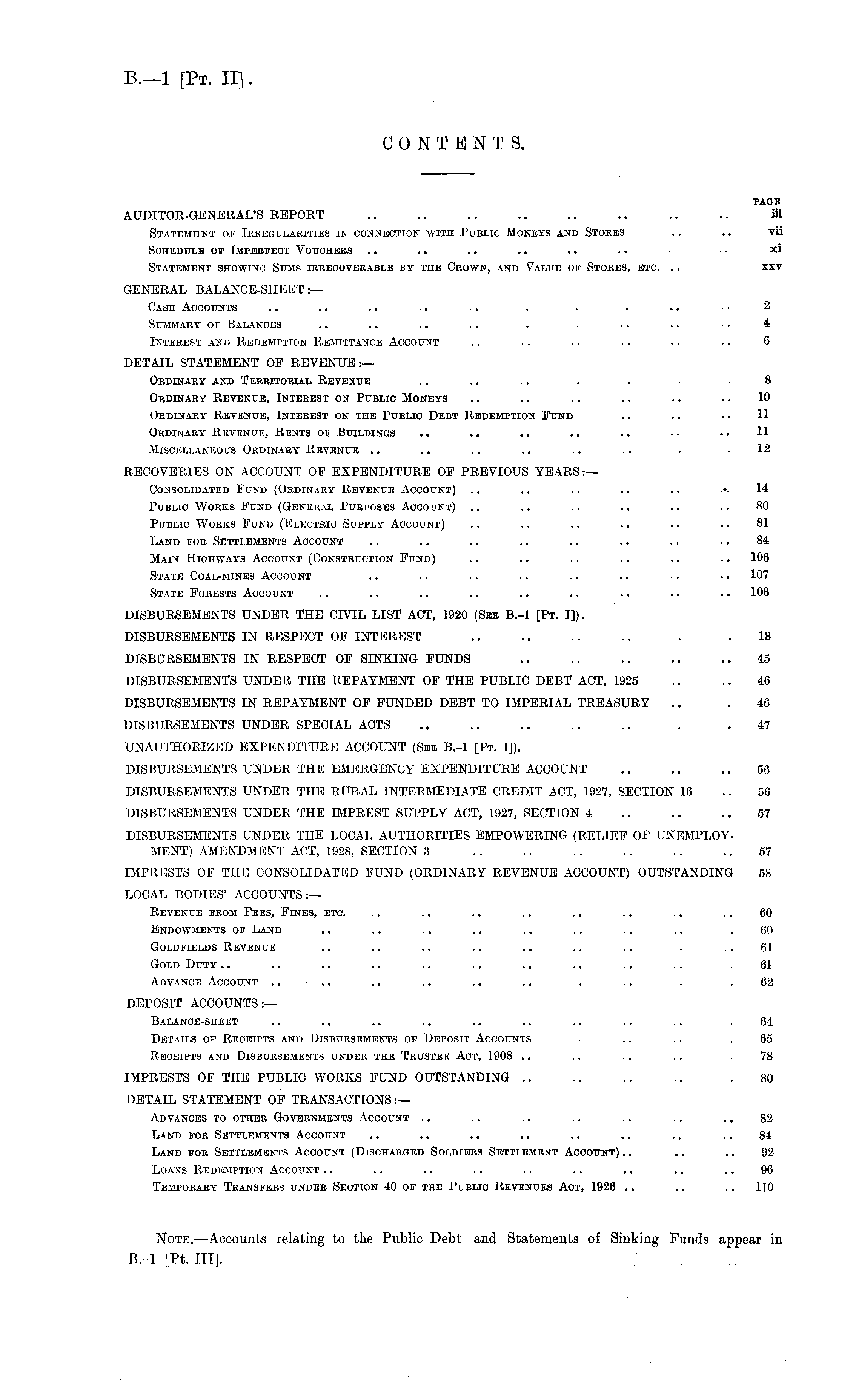 CONTENTS. PAGE AUDITOR-GENERAL'S REPORT .. .. .. ... .. .. .. .. iii Statement of Ibbegularities in connection with Public Moneys and Stokes .. .. vii Schedule of Impebfect Vouchees .. .. .. .. .. .. xi Statement showing Sums ibbecovebable by the Crown, and Value of Stobes, etc. .. xxv GENERAL BALANCE-SHEET Cash Accounts .. .. .. .. .. . . . .. • • 2 Summaby of Balances .. .. .. .. .. . .. .. ■ • 4 Intebest and Redemption Remittance Account .. .. .. .. .. .. 0 DETAIL STATEMENT OF REVENUE:— Ordinary and Tebbitobial Revenue .. .. .. .. . ■ • 8 Obdinaby Revenue, Intebest on Public Moneys .. .. .. .. .. .. 10 Obdinaby Revenue, Intebest on the Public Debt Redemption Fund .. .. .. 11 Obdinaby Revenue, Rents of Buildings .. .. .. .. .. .. .. 11 Miscellaneous Obdinaby Revenue .. .. .. .. .. .. . . 12 RECOVERIES ON ACCOUNT OF EXPENDITURE OF PREVIOUS YEARS:— Consolidated Fund (Obdinaby Revenue Account) .. .. .. .. .. 14 Public Wobks Fund (Genebal Pubposes Account) .. .. .. .. .. .. 80 Public Wobks Fund (Electbic Supply Account) .. .. .. .. .. .. 81 Land fob Settlements Account .. .. .. .. .. .. .. .. 84 Main Highways Account (Constbuotion Fund) .. .. .. .. .. .. 106 State Coal-mines Account .. .. .. .. .. .. .. .. 107 State Fobests Account .. .. .. .. .. .. .. .. .. 108 DISBURSEMENTS UNDER THE CIVIL LIST ACT, 1920 (See 8.-l [Pt. I]). DISBURSEMENTS IN RESPECT OF INTEREST .. .. .. .. . .18 DISBURSEMENTS IN RESPECT OF SINKING FUNDS .. .. .. .. .. 45 DISBURSEMENTS UNDER THE REPAYMENT OF THE PUBLIC DEBT ACT, 1925 .. .. 46 DISBURSEMENTS IN REPAYMENT OF FUNDED DEBT TO IMPERIAL TREASURY .. .46 DISBURSEMENTS UNDER SPECIAL ACTS .. .. .. .. .. . . 47 UNAUTHORIZED EXPENDITURE ACCOUNT (See 8.-l [Pt. I]). DISBURSEMENTS UNDER THE EMERGENCY EXPENDITURE ACCOUNT .. .. .. 56 DISBURSEMENTS UNDER THE RURAL INTERMEDIATE CREDIT ACT, 1927, SECTION 16 .. 56 DISBURSEMENTS UNDER THE IMPREST SUPPLY ACT, 1927, SECTION 4 .. .. .. 57 DISBURSEMENTS UNDER THE LOCAL AUTHORITIES EMPOWERING (RELIEF OF UNEMPLOYMENT) AMENDMENT ACT, 1928, SECTION 3 .. .. .. .. .. .. 57 IMPRESTS OF THE CONSOLIDATED FUND (ORDINARY REVENUE ACCOUNT) OUTSTANDING 58 LOCAL BODIES' ACCOUNTS:— Revenue fbom Fees, Fines, etc. .. .. .. .. .. .. .. .. 60 Endowments of Land .. .. . .. .. .. .. .. . 60 Goldfields Revenue .. .. .. .. .. .. .. . .. 61 Gold Duty .. .. .. .. .. .. .. .. .. .. 61 Advance Account .. .. .. .. .. .. . . , . .62 DEPOSIT ACCOUNTS:— Balance-sheet .. ~ .. .. .. ~ .. .. .. . 64 Details of Receipts and Disbubsements of Deposit Accounts .. . .65 Receipts and Disbubsements under the Trustee Act, 1908 .. .. .. .. 78 IMPRESTS OF THE PUBLIC WORKS FUND OUTSTANDING .. .. .. .. . 80 DETAIL STATEMENT OF TRANSACTIONS :— Advances to other Governments Account .. .. .. .. .. .. .. 82 Land fob Settlements Account .. .. .. .. .. .. ~ .. 84 Land fob Settlements Account (Discharged Soldiebs Settlement Account) .. .. .. 92 Loans Redemption Account .. .. .. .. .. .. .. .. .. 96 Tempobary Tbansfebs undeb. Section 40 of the Public Revenues Act, 1926 .. .. .. 110 Note. —Accounts relating to the Public Debt and Statements of Sinking Funds appear in