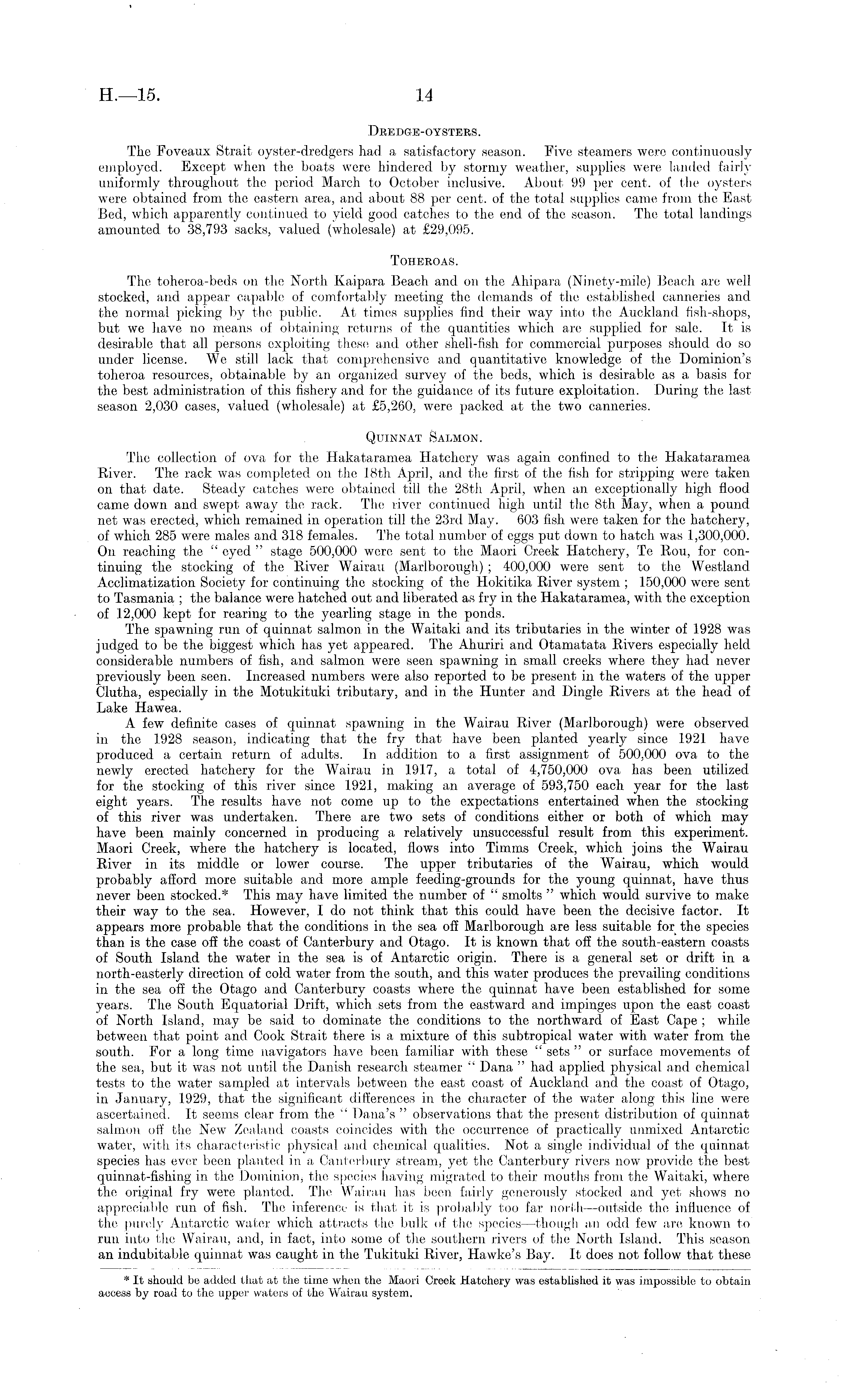 Dredge-oysters. The Foveaux Strait oyster-dredgers had a satisfactory season. Five steamers were continuously employed. Except when the boats were hindered by stormy weather, supplies were landed fairly uniformly throughout the period March to October inclusive. About 99 per cent, of the oysters were obtained from the eastern area, and about 88 per cent, of the total supplies came from the East Bed, which apparently continued to yield good catches to the end of the season. The total landings amounted to 38,793 sacks, valued (wholesale) at £29,095. Toheroas. The toheroa-beds on the North Kaipara Beach and on the Ahipara (Ninety-mile) Beach are well stocked, and appear capable of comfortably meeting the demands of the established canneries and the normal picking by the public. At times supplies find their way into the Auckland fish-shops, but we have no means of obtaining returns of the quantities which are supplied for sale. It is desirable that all persons exploiting these and other shell-fish for commercial purposes should do so under license. We still lack that comprehensive and quantitative knowledge of the Dominion's toheroa resources, obtainable by an organized survey of the beds, which is desirable as a basis for the best administration of this fishery and for the guidance of its future exploitation. During the last season 2,030 cases, valued (wholesale) at £5,260, were packed at the two canneries. Quinnat Salmon. The collection of ova for the Hakataramea Hatchery was again confined to the Hakataramea Biver. The rack was completed on the 18th April, and the first of the fish for stripping were taken on that date. Steady catches were obtained till the 28th April, when an exceptionally high flood came down and swept away the rack. The river continued high until the Bth May, when a pound net was erected, which remained in operation till the 23rd May. 603 fish were taken for the hatchery, of which 285 were males and 318 females. The total number of eggs put down to hatch was 1,300,000. On reaching the " eyed " stage 500,000 were sent to the Maori Creek Hatchery, Te Rou, for continuing the stocking of the Biver Wairau (Marlborough) ; 400,000 were sent to the Westland Acclimatization Society for continuing the stocking of the Hokitika Biver system ; 150,000 were sent to Tasmania ; the balance were hatched out and liberated as fry in the Hakataramea, with the exception of 12,000 kept for rearing to the yearling stage in the ponds. The spawning run of quinnat salmon in the Waitaki and its tributaries in the winter of 1928 was judged to be the biggest which has yet appeared. The Ahuriri. and Otamatata Bivers especially held considerable numbers of fish, and salmon were seen spawning in small creeks where they had never previously been seen. Increased numbers were also reported to be present in the waters of the upper Clutha, especially in the Motukituki tributary, and in the Hunter and Dingle Bivers at the head of Lake Hawea. A few definite cases of quinnat spawning in the Wairau Biver (Marlborough) were observed in the 1928 season, indicating that the fry that have been planted yearly since 1921 have produced a certain return of adults. In addition to a first assignment of 500,000 ova to the newly erected hatchery for the Wairau in 1917, a total of 4,750,000 ova has been utilized for the stocking of this river since 1921, making an average of 593,750 each year for the last eight years. The results have not come up to the expectations entertained when the stocking of this river was undertaken. There are two sets of conditions either or both of which may have been mainly concerned in producing a relatively unsuccessful result from this experiment. Maori Creek, where the hatchery is located, flows into Timms Creek, which joins the Wairau Biver in its middle or lower course. The upper tributaries of the Wairau, which would probably afford more suitable and more ample feeding-grounds for the young quinnat, have thus never been stocked.* This may have limited the number of " smolts " which would survive to make their way to the sea. However, I do not think that this could have been the decisive factor. It appears more probable that the conditions in the sea off Marlborough are less suitable for the species than is the case off the coast of Canterbury and Otago. It is known that off the south-eastern coasts of South Island the water in the sea is of Antarctic origin. There is a general set or drift in a north-easterly direction of cold water from the south, and this water produces the prevailing conditions in the sea off the Otago and Canterbury coasts where the quinnat have been established for some years. The South Equatorial Drift, which sets from the eastward and impinges upon the east coast of North Island, may be said to dominate the conditions to the northward of East Cape ; while between that point and Cook Strait there is a mixture of this subtropical water with water from the south. For a long time navigators have been familiar with these " sets " or surface movements of the sea, but it was not until the Danish research steamer " Dana " had applied physical and chemical tests to the water sampled at intervals between the east coast of Auckland and the coast of Otago, in January, 1929, that the significant differences in the character of the water along this line were ascertained. It seems clear from the " Dana's " observations that the present distribution of quinnat salmon off the New Zealand coasts coincides with the occurrence of practically unmixed Antarctic water, with its characteristic physical and chemical qualities. Not a single individual of the quinnat species has ever been planted in a Canterbury stream, yet the Canterbury rivers now provide the best quinnat-fishing in the Dominion, the species having migrated to their mouths from the Waitaki, where the original fry were planted. The Wairau has been fairly generously stocked and yet shows no appreciable run of fish. The in