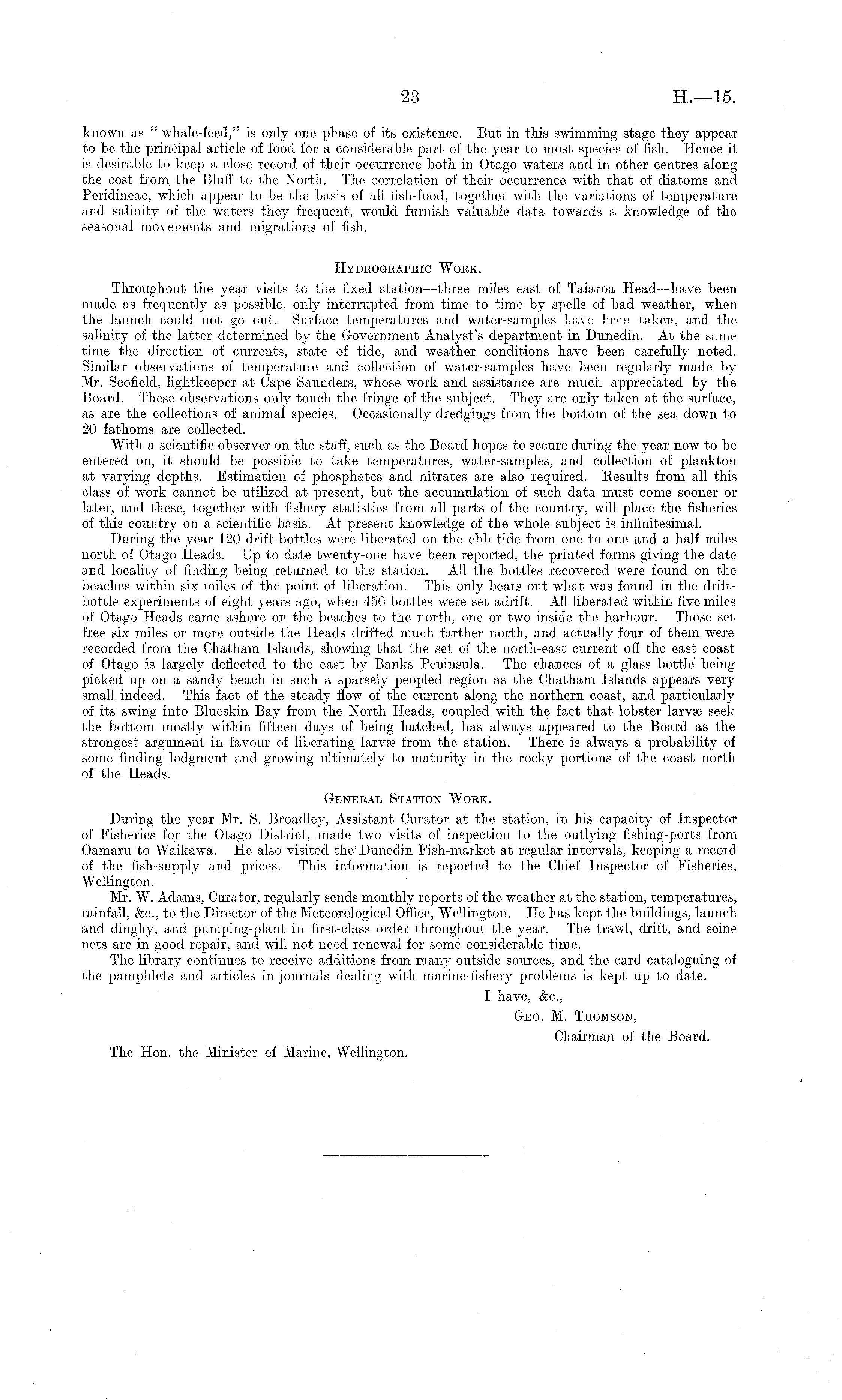 known as " whale-feed," is only one phase of its existence. But in this swimming stage they appear to be the principal article of food for a considerable part of the year to most species of fish. Hence it is desirable to keep a close record of their occurrence both in Otago waters and in other centres along the cost from the Bluff to the North. The correlation of their occurrence with that of diatoms and Peridineae, which appear to be the basis of all fish-food, together with the variations of temperature and salinity of the waters they frequent, would furnish valuable data towards a knowledge of the seasonal movements and migrations of fish. Hydbogkaphic Work. Throughout the year visits to the fixed station —three miles east of Taiaroa Head—have been made as frequently as possible, only interrupted from time to time by spells of bad weather, when the launch could not go out. Surface temperatures and water-samples Lave been taken, and the salinity of the latter determined by the Government Analyst's department in Dunedin. At the same time the direction of currents, state of tide, and weather conditions have been carefully noted. Similar observations of temperature and collection of water-samples have been regularly made by Mr. Scofield, light-keeper at Cape Saunders, whose work and assistance are much appreciated by the Board. These observations only touch the fringe of the subject. They are only taken at the surface, as are the collections of animal species. Occasionally dredgings from the bottom of the sea down to 20 fathoms are collected. With a scientific observer on the staff, such as the Board hopes to secure during the year now to be entered on, it should be possible to take temperatures, water-samples, and collection of plankton at varying depths. Estimation of phosphates and nitrates are also required. Results from all this class of work cannot be utilized at present, but the accumulation of such data must come sooner or later, and these, together with fishery statistics from all parts of the country, will place the fisheries of this country on a scientific basis. At present knowledge of the whole subject is infinitesimal. During the year 120 drift-bottles were liberated on the ebb tide from one to one and a half miles north of Otago Heads. Up to date twenty-one have been reported, the printed forms giving the date and locality of finding being returned to the station. All the bottles recovered were found on the beaches within six miles of the point of liberation. This only bears out what was found in the driftbottle experiments of eight years ago, when 450 bottles were set adrift. All liberated within five miles of Otago Heads came ashore on the beaches to the north, one or two inside the harbour. Those set free six miles or more outside the Heads drifted much farther north, and actually four of them were recorded from the Chatham Islands, showing that, the set of the north-east current off the east coast of Otago is largely deflected to the east by Banks Peninsula. The chances of a glass bottle being picked up on a sandy beach in such a sparsely peopled region as the Chatham Islands appears very small indeed. This fact of the steady flow of the current along the northern coast, and particularly of its swing into Blueskin Bay from the North Heads, coupled with the fact that lobster la.rv® seek the bottom mostly within fifteen days of being hatched, has always appeared to the Board as the strongest argument in favour of liberating larvae from the station. There is always a probability of some finding lodgment and growing ultimately to maturity in the rocky portions of the coast north of the Heads. General Station Work. During the year Mr. S. Broadley, Assistant Curator at the station, in his capacity of Inspector of Fisheries for the Otago District, made two visits of inspection to the outlying fishing-ports from Oamaru to Waikawa. He also visited the'Dunedin Fish-market at regular intervals, keeping a record of the fish-supply and prices. This information is reported to the Chief Inspector of Fisheries, Wellington. Mr. W. Adams, Curator, regularly sends monthly reports of the weather at the station, temperatures, rainfall, &c., to the Director of the Meteorological Office, Wellington. He has kept the buildings, launch and dinghy, and pumping-plant in first-class order throughout the year. The trawl, drift, and seine nets are in good repair, and will not need renewal for some considerable time. The library continues to receive additions from many outside sources, and the card cataloguing of the pamphlets and articles in journals dealing with marine-fishery problems is kept up to date. I have, &c., Geo. M. Thomson, Chairman of the Board. The Hon. the Minister of Marine, Wellington.