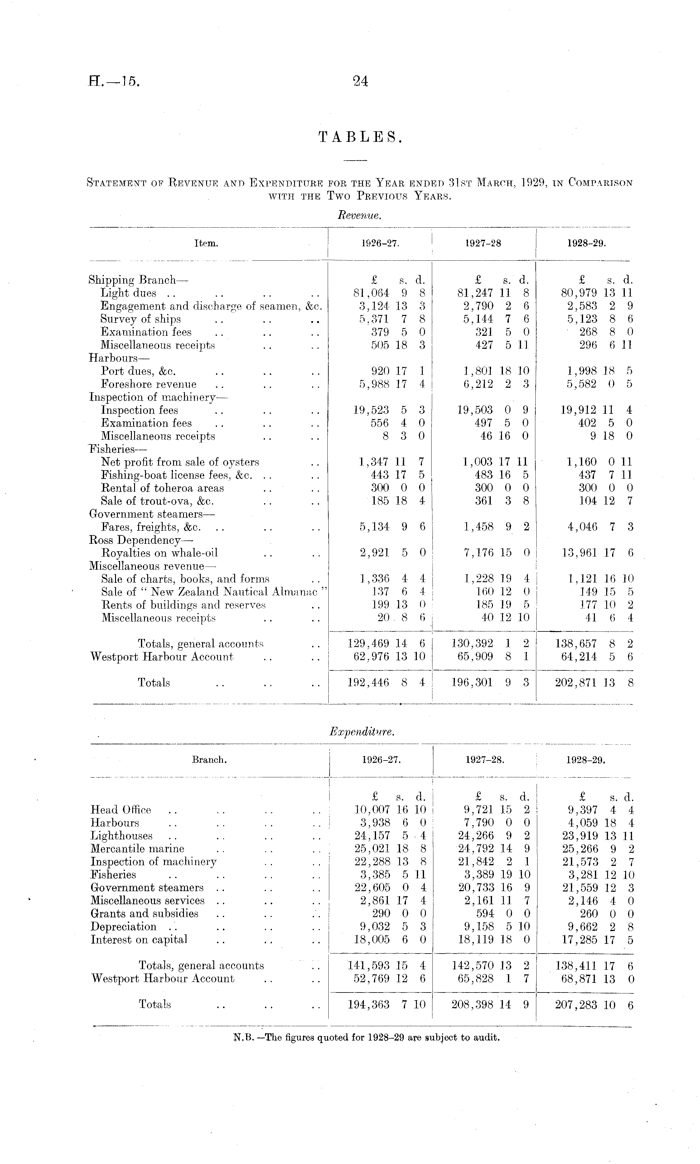 Revenue. Item. 1626-27. 1 1927-28 ! 1928-29. ■ i ; | Shipping Branch— £ s. d. £ s. d. £ s. d. Light dues .. .. .. .. 81,064 9 8 81,247 11 8 80,979 13 11 Engagement and discharge of seamen, &c. .3,124 13 3 2,790 2 6 2,583 2 9 Survey of ships .. .. .. 5,371 7 8 5,144 7 6 5,123 8 6 Examination fees .. .. .. 379 5 0 321 5 0 268 8 0 Miscellaneous receipts .. .. 505 18 3 427 5 11 296 6 11 Harbours — Port dues, &e, .. .. .. 920 17 1 1,801 18 10 1,998 18 5 Foreshore revenue .. .. .. 5,988 17 4 6,212 2 3 5,582 0 5 Inspection of machinery— Inspection fees .. .. .. 19,523 5 3 19,503 0 9 19,912 11 4 Examination fees .. .. .. 556 4 0 497 5 0 402 5 0 Miscellaneous receipts .. .. 8 3 0 46 16 0 9 18 0 Fisheries — Net profit from sale of oysters .. 1 ,347 11 7 1,003 17 11 1,160 0 11 Fishing-boat license fees, &c. .. .. 443 17 5 483 16 5 437 7 11 Rental of toheroa areas .. . . 300 0 0 300 0 0 300 0 0 Sale of trout-ova, &c. .. .. 185 18 4 361 3 8 104 12 7 Government steamers — Fares, freights, &e„ .. .. .. 5,134 9 6 1,458 9 2 4,046 7 3 Ross Dependency — Royalties on whale-oil .. .. 2,921 5 0 7,176 15 0 13,961 17 6 Miscellaneous revenue — Sale of charts, books, and forms .. 1,336 4 4 1,228 19 4 [ 1,121 16 10 Sale of " New Zealand Nautical Almanac " 137 6 4 160 12 0 149 15 5 Rents of buildings and reserves .. 199 13 0 .185 19 5 177 10 2 Miscellaneous receipts .. .. 20 . 8 6 40 12 10 41 6 4 Totals, general accounts .. 129,469 14 6 130,392 1 2 138,657 8 2 Westport Harbour Account .. .. 62,976 13 10 65,909 8 1 64,214 5 6 Totals .. .. .. 192,446 8 4 196,301 9 3 202,871 13 8 Expenditure. Branch. 1926-27. 1927-28. 1928-29. £ s. d. £ s. d. ! £ s. d. Head Office .. .. .. .. 10,007 16 10 9,721 15 2 9,397 4 4 Harbours .. .. .. .. 3,938 6 0 7,790 0 0 4,059 18 4 Lighthouses .. .. .. .. 24,157 5 4 24,266 9 2 23,919 13 11 Mercantile marine .. .. .. 25,021 18 8 24,792 14 9 25,266 9 2 Inspection of machinery .. .. 22,288 13 8 21,842 2 1 21,573 2 7 Fisheries .. .. .. 3,385 5 11 3,389 19 10 3,281 12 10 Government steamers .. .. .. 22,605 0 4 20,733 16 9 21,559 12 3 Miscellaneous services .. .. .. 2,861 17 4 2,161 11 7 2,146 4 0 Grants and subsidies .. .. . . 290 0 0 594 0 0 260 0 0 Depreciation .. .. .. .. 9,032 5 3 9,158 5 10 9,662 2 8 Interest on capital .. .. .. 18,005 6 0 18,119 18 0 17,285 17 5 Totals, general accounts .. 14-1,593 15 4 142,570 13 2 138,411 17 6 Westport Harbour Account .. .. 52,769 12 6 65,828 1 7 68,871 13 0 Totals .. .. .. 194,363 7 10 208,398 14 9 207,283 10 6 H.B. —The figures quoted for 1928-29 are subject to audit.