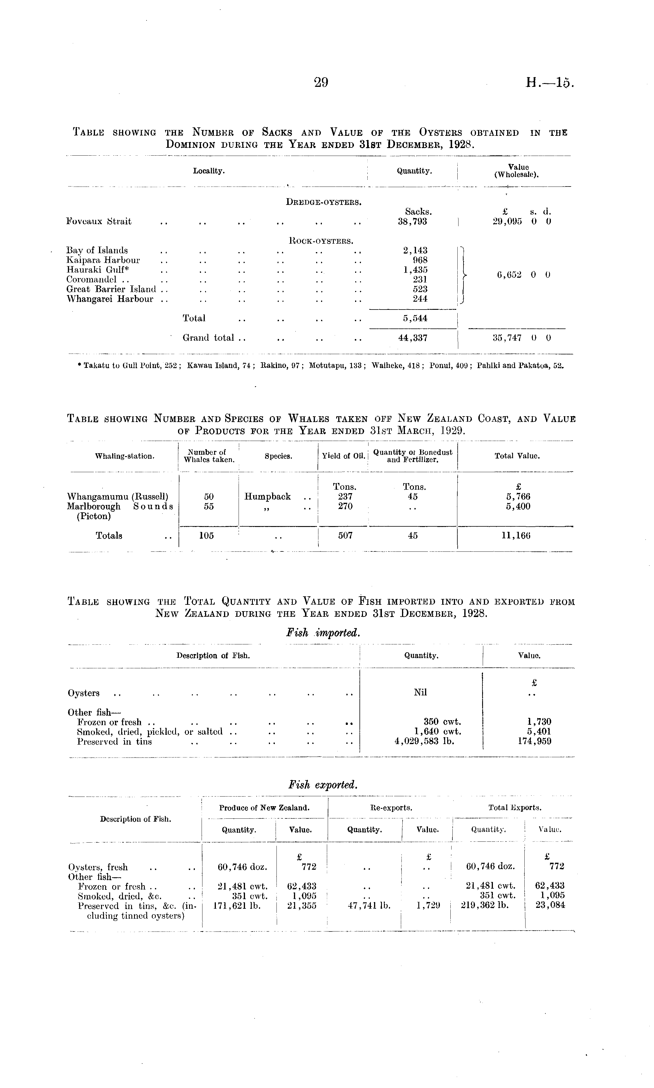 Table showing Number and Species of Whales taken off New Zealand Coast, and Value of Products for the Year ended 31st March, 1929.