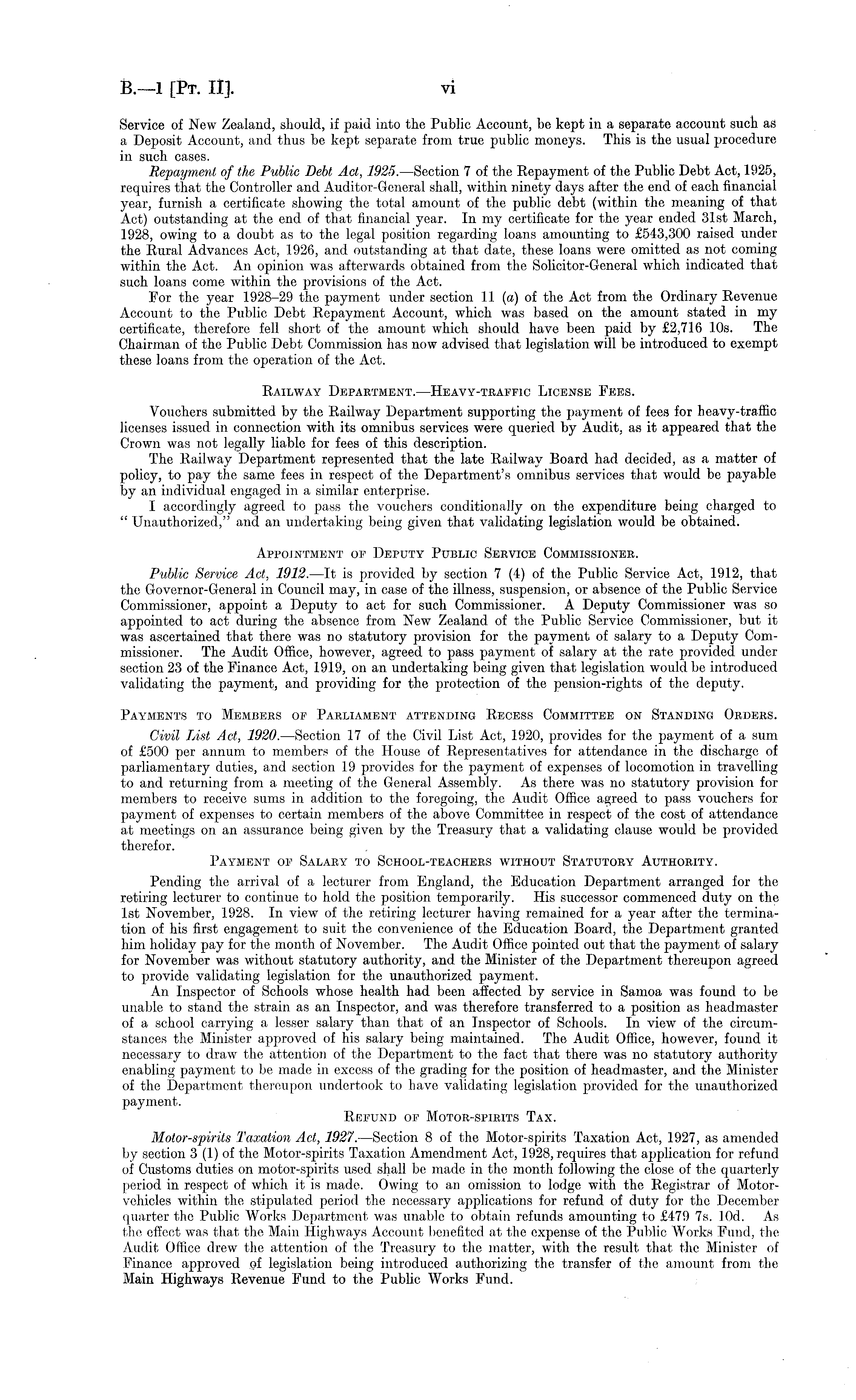 Service of New Zealand, should, if paid into the Public Account, be kept in a separate account such as a Deposit Account, and thus be kept separate from true public moneys. This is the usual procedure in such cases. Repayment of the Public Debt Act, 1925. —Section 7 of the Repayment of the Public Debt Act, 1925, requires that the Controller and Auditor-General shall, within ninety days after the end of each financial year, furnish a certificate showing the total amount of the public debt (within the meaning of that Act) outstanding at the end of that financial year. In my certificate for the year ended 31st March, 1928, owing to a doubt as to the legal position regarding loans amounting to £543,300 raised under the Rural Advances Act, 1926, and outstanding at that date, these loans were omitted as not coming within the Act. An opinion was afterwards obtained from the Solicitor-General which indicated that such loans come within the provisions of the Act. For the year 1928-29 the payment under section 11 (a) of the Act from the Ordinary Revenue Account to the Public Debt Repayment Account, which was based on the amount stated in my certificate, therefore fell short of the amount which should have been paid by £2,716 10s. The Chairman of the Public Debt Commission has now advised that legislation will be introduced to exempt these loans from the operation of the Act. Railway Department.—Heavy-traffic License Fees. Vouchers submitted by the Railway Department supporting the payment of fees for heavy-traffic licenses issued in connection with its omnibus services were queried by Audit, as it appeared that the Crown was not legally liable for fees of this description. The Railway Department represented that the late Railway Board had decided, as a matter of policy, to pay the same fees in respect of the Department's omnibus services that would be payable by an individual engaged in a similar enterprise. I accordingly agreed to pass the vouchers conditionally on the expenditure being charged to " Unauthorized," and an undertaking being given that validating legislation would be obtained. Appointment of Deputy Public Service Commissioner. Public Service Act, 1912. —It is provided by section 7 (4) of the Public Service Act, 1912, that the Governor-General in Council may, in case of the illness, suspension, or absence of the Public Service Commissioner, appoint a Deputy to act for such Commissioner. A Deputy Commissioner was so appointed to act during the absence from New Zealand of the Public Service Commissioner, but it was ascertained that there was no statutory provision for the payment of salary to a Deputy Commissioner. The Audit Office, however, agreed to pass payment of salary at the rate provided under section 23 of the Finance Act, 1919, on an undertaking being given that legislation would be introduced validating the payment, and providing for the protection of the pension-rights of the deputy. Payments to Members of Parliament attending Recess Committee on Standing Orders. Civil List Act, 1920. —Section 17 of the Civil List Act, 1920, provides for the payment of a sum of £500 per annum to members of the House of Representatives for attendance in the discharge of parliamentary duties, and section 19 provides for the payment of expenses of locomotion in travelling to and returning from a meeting of the General Assembly. As there was no statutory provision for members to receive sums in addition to the foregoing, the Audit Office agreed to pass vouchers for payment of expenses to certain members of the above Committee in respect of the cost of attendance at meetings on an assurance being given by the Treasury that a validating clause would be provided therefor. Payment of Salary to School-teachers without Statutory Authority. Pending the arrival of a lecturer from England, the Education Department arranged for the retiring lecturer to continue to hold the position temporarily. His successor commenced duty on the Ist November, 1928. In view of the retiring lecturer having remained for a year after the termination of his first engagement to suit the convenience of the Education Board, the Department granted him holiday pay for the month of November. The Audit Office pointed out that the payment of salary for November was without statutory authority, and the Minister of the Department thereupon agreed to provide validating legislation for the unauthorized payment. An Inspector of Schools whose health had been affected by service in Samoa was found to be unable to stand the strain as an Inspector, and was therefore transferred to a position as headmaster of a school carrying a lesser salary than that of an Inspector of Schools. In view of the circumstances the Minister approved of his salary being maintained. The Audit Office, however, found it necessary to draw the attention of the Department to the fact that there was no statutory authority enabling payment to be made in excess of the grading for the position of headmaster, and the Minister of the Department thereupon undertook to have validating legislation provided for the unauthorized payment. Refund of Motor-spirits Tax. Motor-spirits Taxation Act, 1927.—Section 8 of the Motor-spirits Taxation Act, 1927, as amended by section 3 (1) of the Motor-spirits Taxation Amendment Act, 1928, requires that application for refund of Customs duties on motor-spirits used shall be made in the month following the close of the quarterly period in respect of which it is made. Owing to an omission to lodge with the Registrar of Motorvehicles within the stipulated period the necessary applications for refund of duty for the December quarter the Public Works Department was unable to obtain refunds amounting to £479 7s. lOd. As the effect was that the Main Highways Account benefited at the expense of the Public Works Fund, the Audit Office drew the attention of the Treasury to the matter, with the result that the Minister of Finance approved o