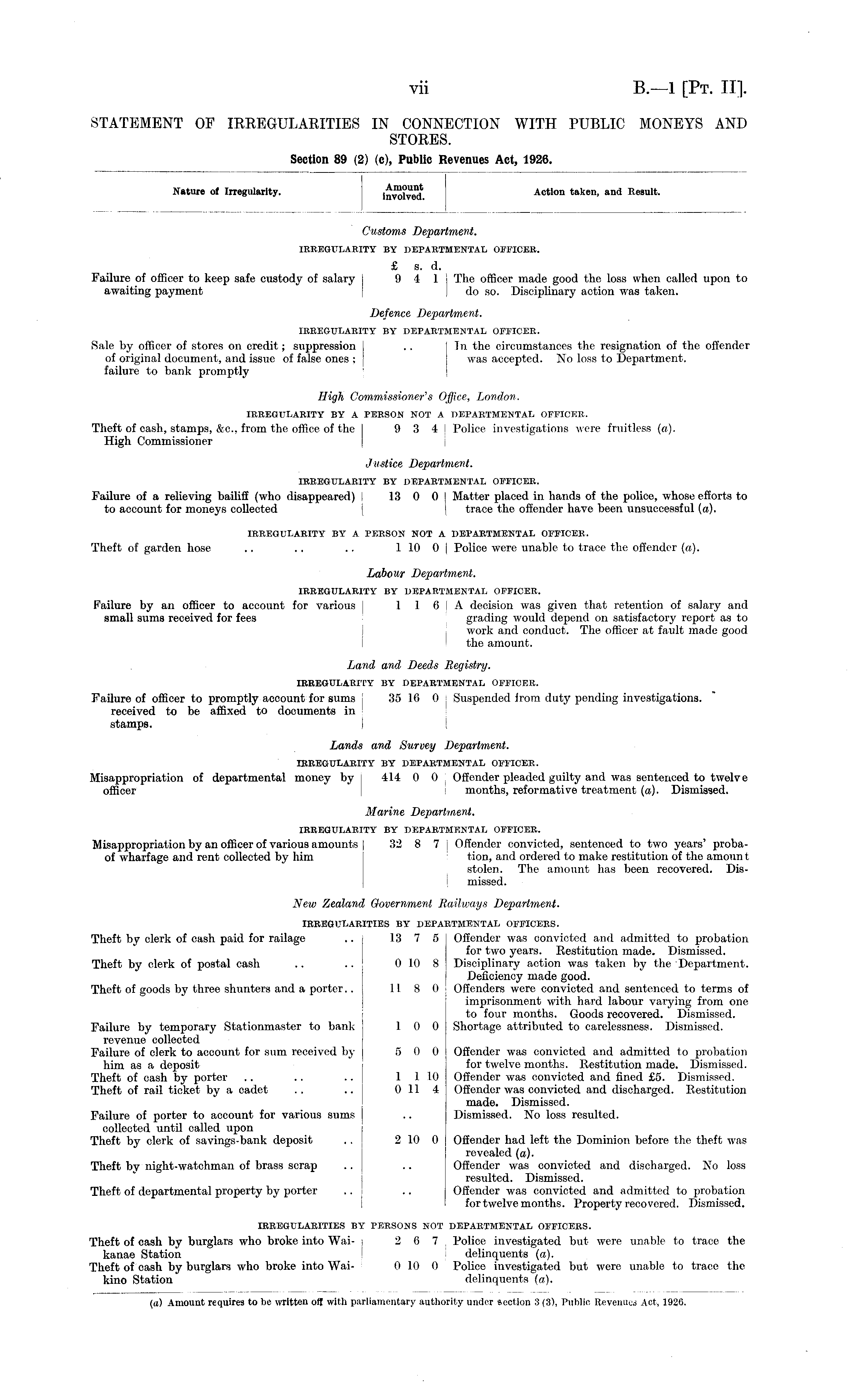 Nature of Irregularity. j involved Action taken, and Result. Customs Department. IRREGULARITY BY DEPARTMENTAL OFFICER. £ s. d. Failure of officer to keep safe custody of salary I 9 4 1 The officer made good the loss when called upon to awaiting payment [ j do so. Disciplinary action was taken. Defence Department. IRREGULARITY BY DEPARTMENTAL OFFICER. Sale by officer of stores on credit; suppression j .. In the circumstances the resignation of the offender of original document, and issue of false ones ; j was accepted. No loss to Department. failure to bank promptly High Commissioner's Office, London. IRREGULARITY BY A PERSON NOT A DEPARTMENTAL OFFICER. Theft of cash, stamps, &c., from the office of the I 9 3 4' Police investigations were fruitless (a). High Commissioner Justice Department. IRREGULARITY BY DEPARTMENTAL OFFICER. Failure of a relieving bailiff (who disappeared) 13 0 0 j Matter placed in hands of the police, whose efforts to to account for moneys collected l | trace the offender have been unsuccessful (a). IRREGULARITY BY A PERSON NOT A DEPARTMENTAL OFFICER. Theft of garden hose .. .. .. 1 10 0 | Police were unable to trace the offender (a). Labour Department. IRREGULARITY BY DEPARTMENTAL OFFICER. Failure by an officer to account for various | 1 1 6 I A decision was given that retention of salary and small sums received for fees grading would depend on satisfactory report as to | , work and conduct. The officer at fault made good the amount. Land and Deeds Registry. IRREGULARITY BY DEPARTMENTAL OFFICER. Failure of officer to promptly account for sums [ 35 16 0 Suspended from duty pending investigations. received to be affixed to documents in stamps. Lands and Survey Department. IRREGULARITY BY DEPARTMENTAL OFFICER. Misappropriation of departmental money by | 414 0 0 Offender pleaded guilty and was sentenced to twelve officer | months, reformative treatment (a). Dismissed. Marine Deparhnent. IRREGULARITY BY DEPARTMENTAL OFFICER. Misappropriation by an officer of various amounts | 32 8 7 j Offender convicted, sentenced to two years' probaof wharfage and rent collected by him tion, and ordered to make restitution of the amoun t stolen. The amount has been recovered. Dis- | missed. New Zealand Government Railways Department. IRREGULARITIES BY DEPARTMENTAL OFFICERS. Theft by clerk of cash paid for railage .. 13 7 5 Offender was convicted and admitted to probation for two years. Restitution made. Dismissed. Theft by clerk of postal cash .. .. 0 10 8 Disciplinary action was taken by the Department. Deficiency made good. Theft of goods by three shunters and a porter.. 118 0 Offenders were convicted and sentenced to terms of imprisonment with hard labour varying from one to four months. Goods recovered. Dismissed. Failure by temporary Stationmaster to bank ] 0 0 Shortage attributed to carelessness. Dismissed, revenue collected Failure of clerk to account for sum received by 5 0 0 Offender was convicted and admitted to probation him as a deposit for twelve months. Restitution made. Dismissed. Theft of cash by porter .. .. .. 1 1 10 Offender was convicted and fined £5. Dismissed. Theft of rail ticket by a cadet . . .. 0 114 Offender was convicted and discharged. Restitution made. Dismissed. Failure of porter to account for various sums .. Dismissed. No loss resulted. collected until called upon Theft by clerk of savings-bank deposit . . 2 10 0 Offender had left the Dominion before the theft was revealed (a). Theft by night-watchman of brass scrap .. .. Offender was convicted and discharged. No loss resulted. Dismissed. Theft of departmental property by porter .. .. Offender was convicted and admitted to probation for twelve months. Property recovered. Dismissed. IRREGULARITIES BY PERSONS NOT DEPARTMENTAL OFFICERS. Theft of cash by burglars who broke into Wai- i 2 6 7 Police investigated but were unable to trace the kanae Station ! delinquents (a). Theft of cash by burglars who broke into Wai- 0 10 0 Police investigated but were unable to trace the kino Station delinquents (a). (a) Amount requires to be written off with parliamentary authority under section 3 (3), Public Revenue Act, 1926.