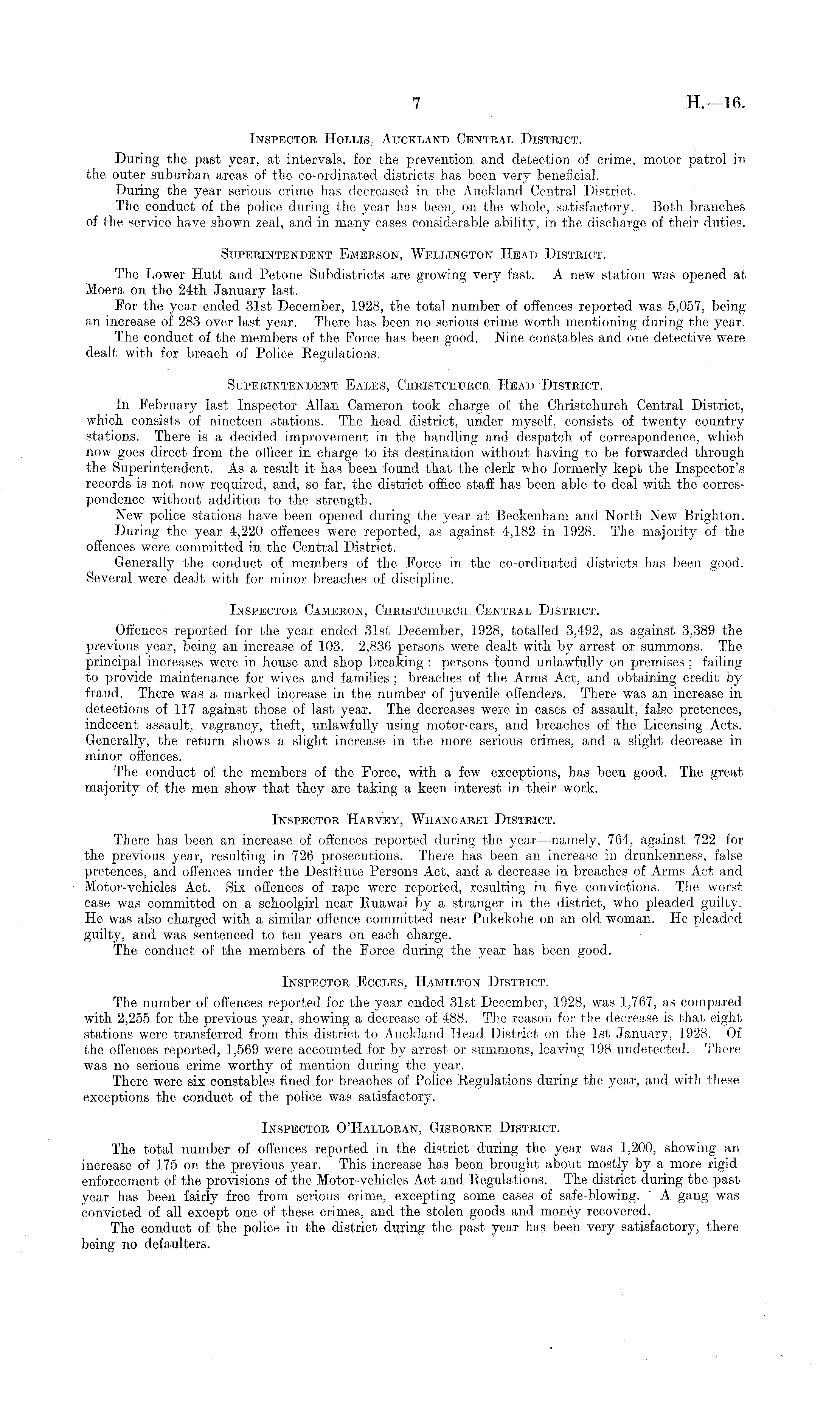 Inspector Hollis. Auckland Central District. During the past year, at intervals, for the prevention and detection of crime, motor patrol in the outer suburban areas of the co-ordinated districts has been very beneficial. During the year serious crime has decreased in the Auckland Central District. The conduct of the police during the year has been, on the whole, satisfactory. Both branches of the service have shown zeal, and in many cases considerable ability, in the discharge of their duties. Superintendent Emerson, Wellington Head District. The Lower Hutt and Petone Subdistricts are growing very fast. A new station was opened at Moera on the 24th January last. For the year ended 31st December, 1928, the total number of offences reported was 5,057, being an increase of 283 over last year. There has been no serious crime worth mentioning during the year. The conduct of the members of the Force has been good. Nine constables and one detective were dealt with for breach of Police Regulations. Superintendent Eales, Christchurch Head District. In February last Inspector Allan Cameron took charge of the Christchurch Central District, which consists of nineteen stations. The head district, under myself, consists of twenty country stations. There is a decided improvement in the handling and despatch of correspondence, which now goes direct from the officer in charge to its destination without having to be forwarded through the Superintendent. As a result it lias been found that the clerk who formerly kept the Inspector's records is not now required, and, so far, the district office staff has been able to deal with the correspondence without addition to the strength. New police stations have been opened during the year at Beckenham and North New Brighton. During the year 4,220 offences were reported, as against 4,182 in 1928. The majority of the offences were committed in the Central District. Generally the conduct of members of the Force in the co-ordinated districts has been good. Several were dealt with for minor breaches of discipline. Inspector Cameron, Christchurch Central District. Offences reported for the year ended 31st December, 1928, totalled 3,492, as against 3,389 the previous year, being an increase of 103. 2,836 persons were dealt with by arrest or summons. The principal increases were in house and shop breaking ; persons found, unlawfully on premises ; failing to provide maintenance for wives and families ; breaches of the Arms Act, and obtaining credit by fraud. There was a marked increase in the number of juvenile offenders. There was an increase in detections of 117 against those of last year. The decreases were in cases of assault, false pretences, indecent assault, vagrancy, theft, unlawfully using motor-cars, and breaches of the Licensing Acts. Generally, the return shows a slight increase in the more serious crimes, and a slight decrease in minor offences. The conduct of the members of the Force, with a few exceptions, has been good. The great majority of the men show that they are taking a keen interest in their work. Inspector Harvey, Whangarei District. There has been an increase of offences reported during the year —namely, 764, against 722 for the previous year, resulting in 726 prosecutions. There has been an increase in drunkenness, false pretences, and offences under the Destitute Persons Act, and a decrease in breaches of Arms Act and Motor-vehicles Act. Six offences of rape were reported, resulting in five convictions. The worst case was committed on a schoolgirl near Ruawai by a stranger in the district, who pleaded guilty. He was also charged with a similar offence committed near Pukekohe on an old woman. He pleaded guilty, and was sentenced to ten years on each charge. The conduct of the members of the Force during the year has been good. Inspector Eccles, Hamilton District. The number of offences reported for the year ended 31st December, 1928, was 1,767, as compared with 2,255 for the previous year, showing a decrease of 488. The reason for the decrease is that eight stations were transferred from this district to Auckland Head District on the Ist January, 1928. Of the offences reported, 1,569 were accounted for by arrest or summons, leaving 198 undetected. There was no serious crime worthy of mention during the year. There were six constables fined for breaches of Police Regulations during the year, a-nd with these exceptions the conduct of the police was satisfactory. Inspector O'Halloran, Gisborne District. The total number of offences reported in the district during the year was 1,200, showing an increase of 175 on the previous year. This increase has been brought about mostly by a more rigid enforcement of the provisions of the Motor-vehicles Act and Regulations. The district during the past year has been fairly free from serious crime, excepting some cases of safe-blowing. A gang was convicted of ail except one of these crimes, and the stolen goods and money recovered. The conduct of the police in the district during the past year has been very satisfactory, there being no defaulters.