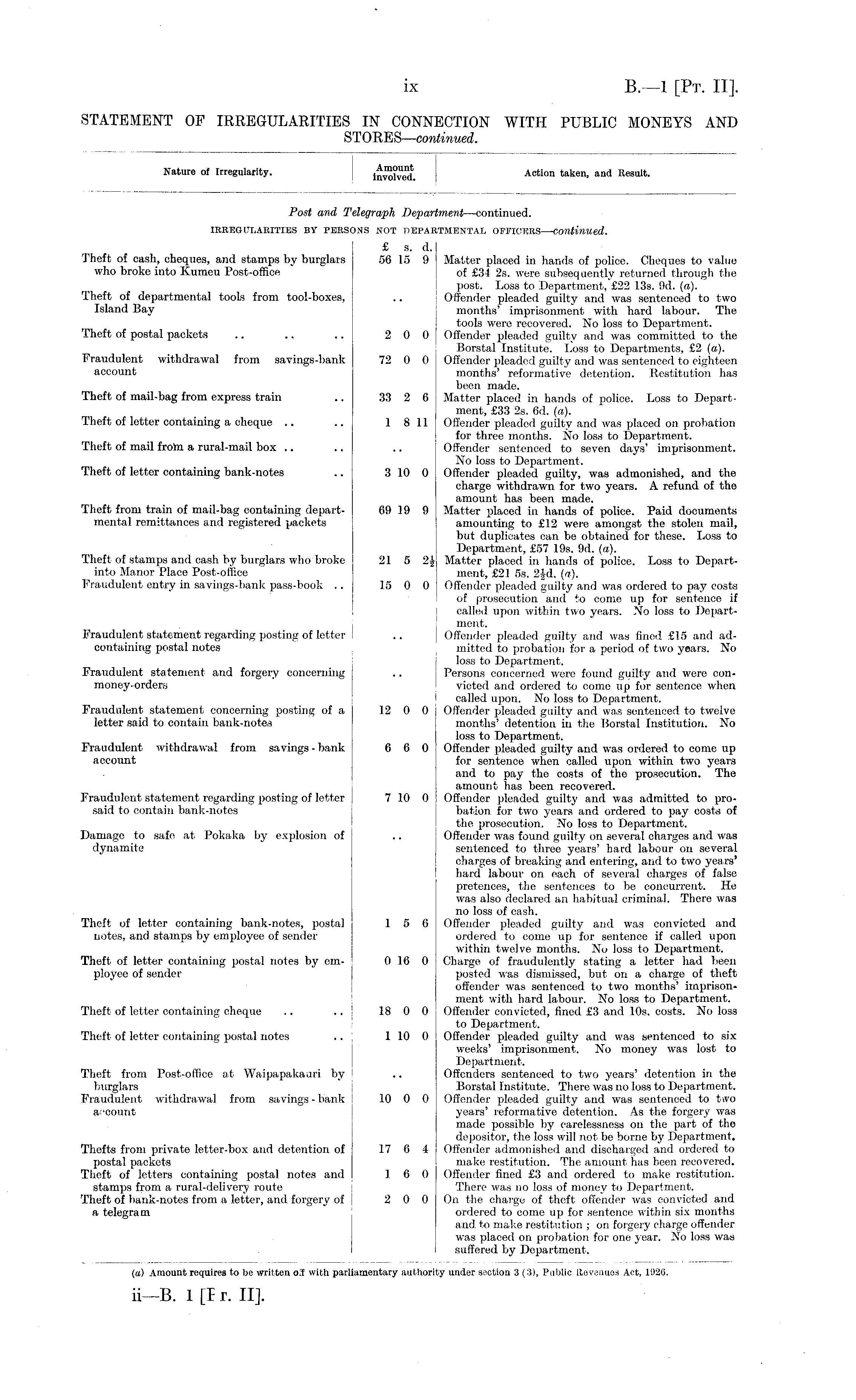Nature of Irregularity. ! ! Action taken, and Result. Post and Telegraph Department—continued. IRREGULARITIES BY PERSONS NOT DEPARTMENTAL OFFICERS —Continued. £ s. d. Theft of cash, cheques, and stamps by burglars 56 15 9 Matter placed in hands of police. Cheques to value who broke into Kumeu Post-office of £34 2s. were subsequently returned through the post. Loss to Department, £22 13s. 9d. (a). Theft of departmental tools from tool-boxes, .. Offender pleaded guilty and was sentenced to two Island Bay months' imprisonment with hard labour. The tools were recovered. No loss to Department. Theft of postal packets .. .. .. 2 0 0 Offender pleaded guilty and was committed to the Borstal Institute. Loss to Departments, £2 (a). Fraudulent withdrawal from savings-bank 72 0 0 Offender pleaded guilty and was sentenced to eighteen account months' reformative detention. Restitution has been made. Theft of mail-bag from express train .. 33 2 6 Matter placed in hands of police. Loss to Department, £33 2s. 6d. (a). Theft of letter containing a cheque .. .. 18 11 Offender pleaded guilty and was placed on probation for three months. No loss to Department. Theft of mail from a rural-mail box .. .. .. Offender sentenced to seven days' imprisonment. No loss to Department. Theft of letter containing bank-notes .. 3 10 0 Offender pleaded guilty, was admonished, and the charge withdrawn for two years. A refund of the amount has been made. Theft from train of mail-bag containing depart- 69 19 9 Matter placed in hands of police. Paid documents mental remittances and registered packets amounting to £12 were amongst the stolen mail, but duplicates can be obtained for these. Loss to Department, £57 19s. 9d. (a). Theft of stamps and cash by burglars who broke 21 5 2| Matter placed in hands of police. Loss to Departinto Manor Place Post-office merit, £21 5s. 2£d. (a). Fraudulent entry in savings-bank pass-book .. 15 0 0 Offender pleaded guilty and was ordered to pay costs of prosecution and to come up for sentence if called upon within two years. No loss to Department. Fraudulent statement regarding posting of letter .. Offender pleaded guilty and was fined £15 and adcontaining postal notes mitted to probation for a period of two years. No loss to Department. Fraudulent statement and forgery concerning .. Persons concerned were found guilty and were con-money-orders victed and ordered to come up for sentence when called upon. No loss to Department. Fraudulent statement concerning posting of a 12 0 0 Offender pleaded guilty and was sentenced to twelve letter said to contain bank-notes months' detention in the Borstal Institution. No loss to Department. Fraudulent withdrawal from savings - bank 6 6 0 Offender pleaded guilty and was ordered to come up account for sentence when called upon within two years and to pay the costs of the prosecution. The amount has been recovered. Fraudulent statement regarding posting of letter 7 10 0 Offender pleaded guilty and was admitted to prosaid to contain bank-notes bation for two years and ordered to pay costs of the prosecution. No loss to Department. Damage to safe at Pokaka by explosion of .. Offender was found guilty on several charges and was dynamite sentenced to three years' bard labour on several charges of breaking and entering, and to two years' hard labour on each of several charges of false pretences, the sentences to be concurrent. He was also declared an habitual criminal. There was no loss of cash. Theft of letter containing bank-notes, postal 15 6 Offender pleaded guilty and was convicted and notes, and stamps by employee of sender ordered to come up for sentence if called upon within twelve months. No loss to Department. Theft of letter containing postal notes by em- 0 16 0 Charge of fraudulently stating a letter had been ployee of sender posted was dismissed, but on a charge of theft offender was sentenced to two months' imprisonment with hard labour. No loss to Department. Theft of letter containing cheque .. .. 18 0 0 Offender convicted, fined £3 and 10s. costs. No loss to Department. Theft of letter containing postal notes .. 1 10 0 Offender pleaded guilty and was sentenced to six weeks' imprisonment. No money was lost to Department. Theft from Post-office at Waipapakauri by .. Offenders sentenced to two years' detention in the burglars Borstal Institute. There was no loss to Department. Fraudulent withdrawal from savings - bank 10 0 0 Offender pleaded guilty and was sentenced to two account years' reformative detention. As the forgery was made possible by carelessness on the part of the depositor, the loss will not be borne by Department. Thefts from private letter-box and detention of 17 6 4 Offender admonished and discharged and ordered to postal packets make restitution. The amount has been recovered. Theft of letters containing postal notes and 16 0 Offender fined £3 and ordered to make restitution, stamps from a rural-delivery route There was no loss of money to Department. Theft of bank-notes from a letter, and forgery of 2 0 0 On the charge of theft offender was convicted and a telegram ordered to come up for sentence within six months and to make restitution ; on forgery charge offender was placed on probation for one year. No loss was suffered by Department. (a) Amount requires to be written off with parliamentary authority under section 3 (3), Public He venues Act, 1920.