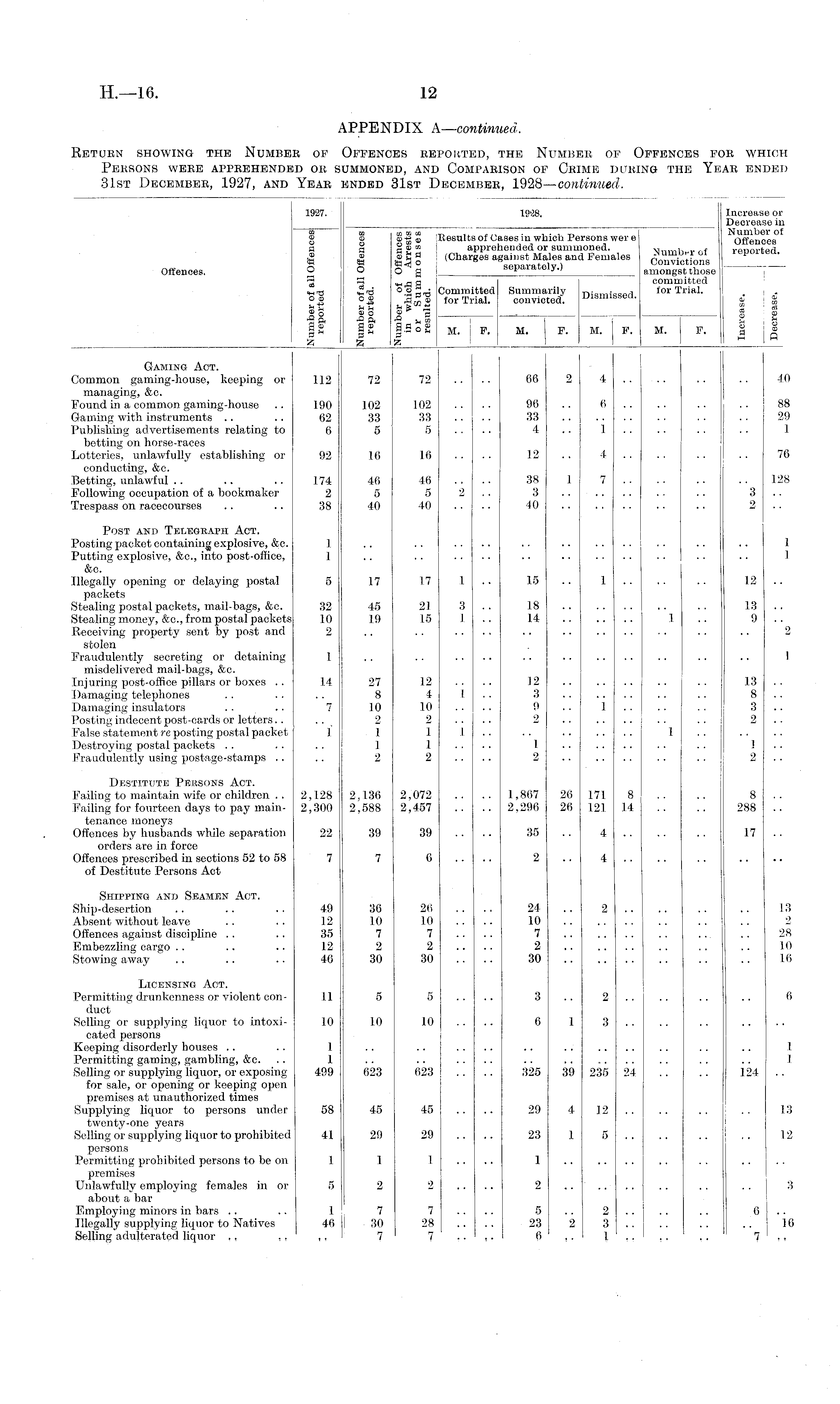 APPENDIX A—continued. Return showing the Number of Offences reported, the Number of Offences for which Persons were apprehended or summoned, and Comparison of Crime during the Year ended 31st December, 1927, and Year ended 31st December, 1928—continued.