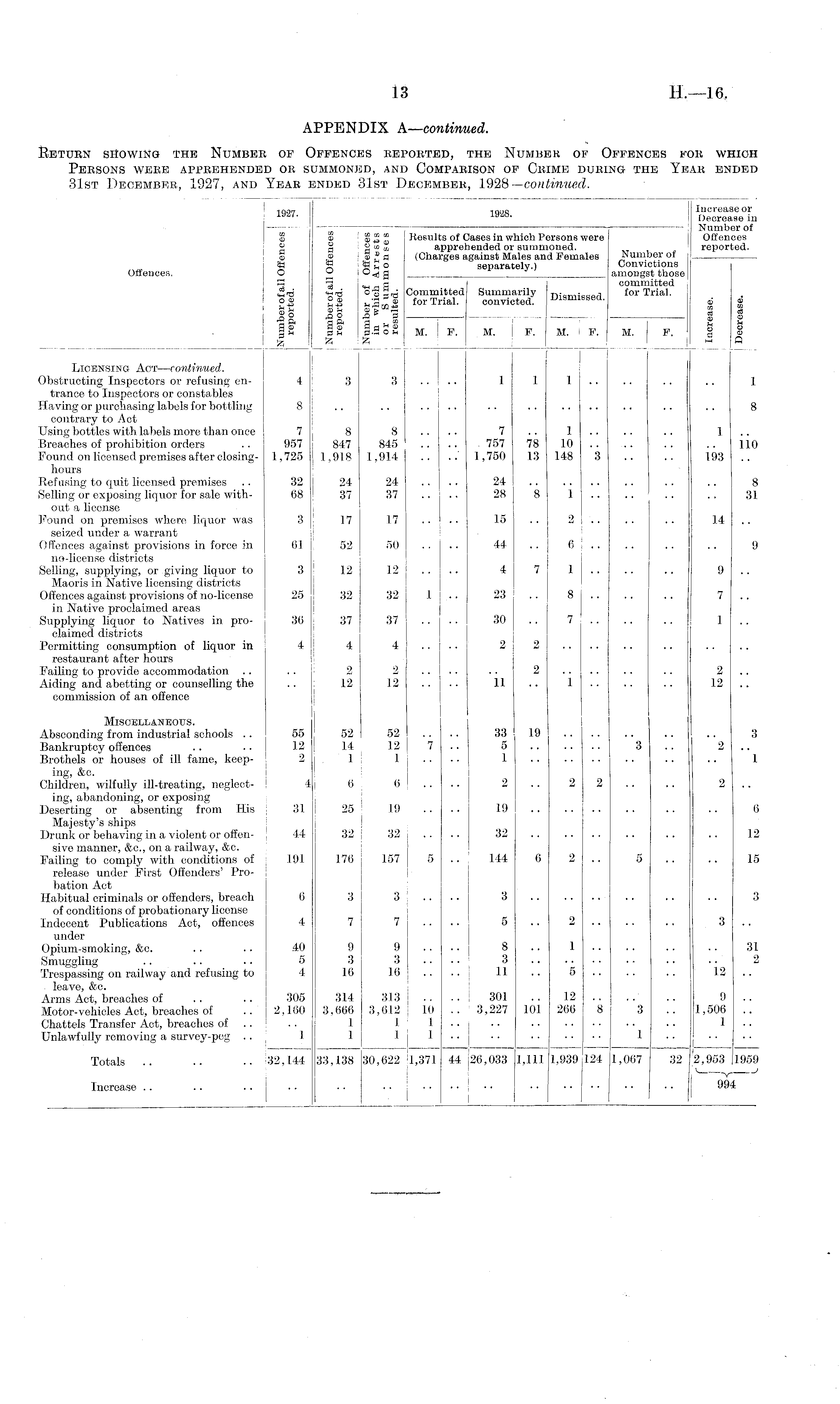 APPENDIX A—continued. Return showing the Number of Offences reported, the Number of Offences for which Persons week apprehended or summoned, and Comparison of Crime during the Year ended 31st December, 1927, and Year ended 31st December, 1928—continued.