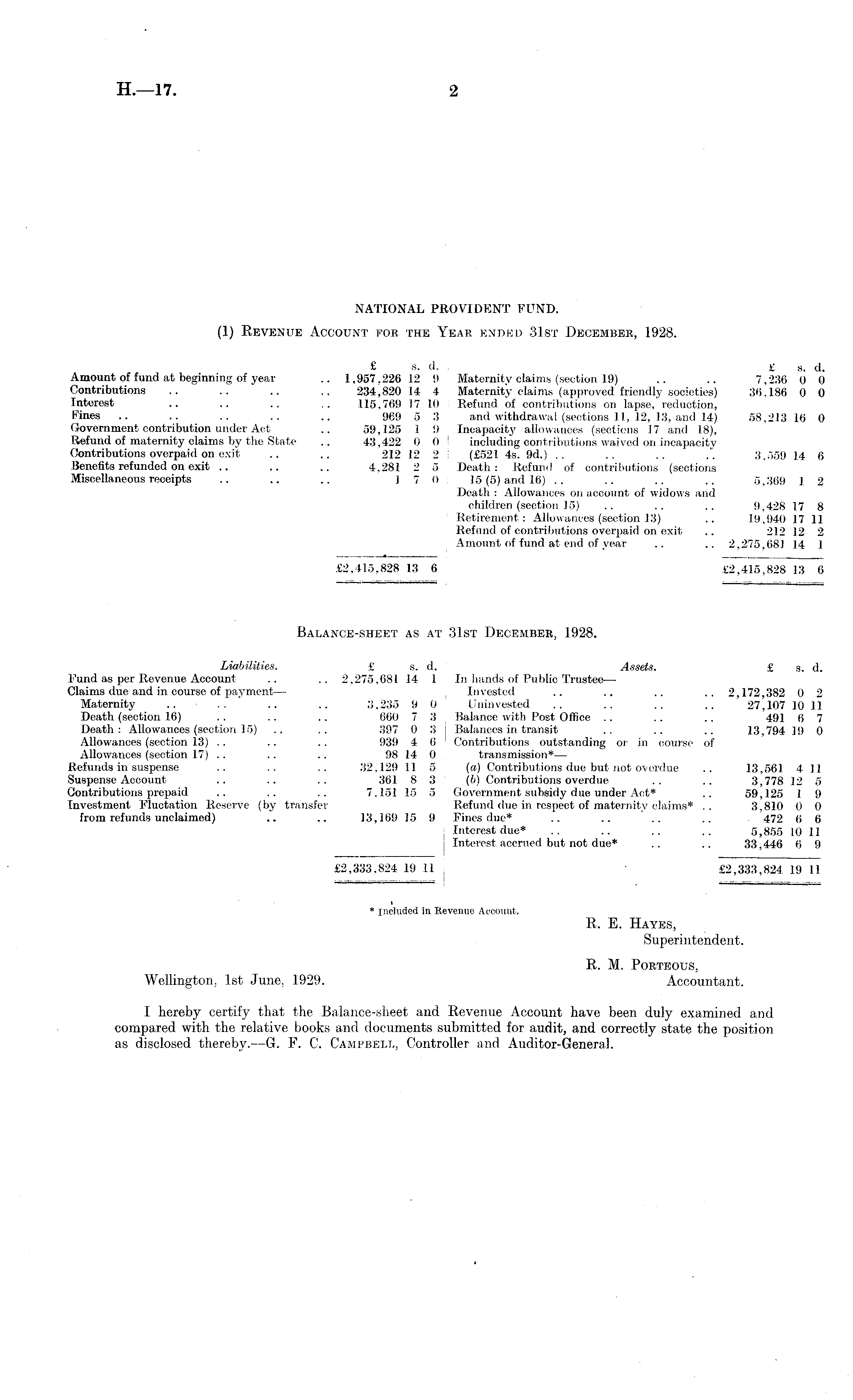 NATIONAL PROVIDENT FUND. (1) Revenue Account for the Year ended 31st December, 1928. £ s. d. £ s. d. Amount of fund at beginning of year .. 1,957.226 12 9 Maternity claims (section 19) .. .. 7,236 0 0 Contributions .. .. .. .. 234,820 14 4 Maternity claims (approved friendly societies) 36,186 0 0 Interest .. .. .. .. 115,769 17 10 Refund of contributions on lapse, reduction, Pines .. .. .. .. .. 969 5 3 and withdrawal (sections 11, 12, 13, and 14) 58,213 16 0 Government contribution under Act .. 59,125 1 9 Incapacity allowances (sections 17 and 18), Refund of maternity claims by the State .. 43,422 0 0 ! including contributions waived on incapacity Contributions overpaid on exit .. .. 212 12 2 ! (£521 4s. 9d.) .. .. .. .. 3,559 14 6 Benefits refunded on exit .. .. .. 4,281 2 5 Death: Refund, of contributions (sections Miscellaneous receipts .. .. .. 17 0: 15 (5) and 16) .. .. .. .. 5,369 1 2 Death : Allowances on account of widows and children (section 15) .. .. .. 9,428 17 8 Retirement: Allowances (section 13) .. 19,940 17 11 Refund of contributions overpaid on exit .. 212 12 2 Amount of fund at end of year .. .. 2,275,681 14 1 £2,415,828 13 6 £2,415,828 13 6 Balance-sheet as at 31st December, 1928. Liabilities. £ s. d. 1 Assets. £ s. d. Fund as per Revenue Account .. .. 2,275,68114 1 In hands of Public TrusteeClaims due and in course of payment— , Invested .. .. .. .. 2,172,382 0 2 Maternity .. .. .. .. 3,235 9 0 | Uninvested .. .. .. .. 27,107 10 11 Death (section 16) .. .. .. 660 7 3 Balance with Post Office .. .. .. 491 6 7 Death: Allowances (section 15) .. .. 397 0 3 j Balances in transit .. .. .. 13,794 19 0 Allowances (section 13) .. .. .. 939 4 6 ' Contributions outstanding or in course of Allowances (section 17) .. .. .. 98 14 0 transmission*— Refunds in suspense .. .. .. 32.129 11 5 (a) Contributions due but not overdue .. 13,561 4 11 Suspense Account .. .. .. 361 8 3 (6) Contributions overdue .. .. 3,778 12 5 Contributions prepaid .. .. .. 7,151 15 5 Government subsidy due under Act* .. 59,125 1 9 Investment Fluctation Reserve (by transfer Refund due in respect of maternity claims* ~ 3,810 0 0 from refunds unclaimed) .. .. 13,169 15 9 Fines due* .. .. .. .. 472 6 6 Interest due* .. .. .. .. 5,855 10 11 Interest accrued but not due* .. .. 33,446 6 9 £2,333.824 19 11 £2,333,824 19 11 * Included in Revenue Account. R. E. Hayes, Superintendent. R. M. Porteous, Wellington, Ist June, 1929. Accountant. I hereby certify that the Balance-sheet and Revenue Account have been duly examined and compared with the relative books and documents submitted for audit, and correctly state the position as disclosed thereby.—G. F. C. Campbell, Controller and Auditor-General.