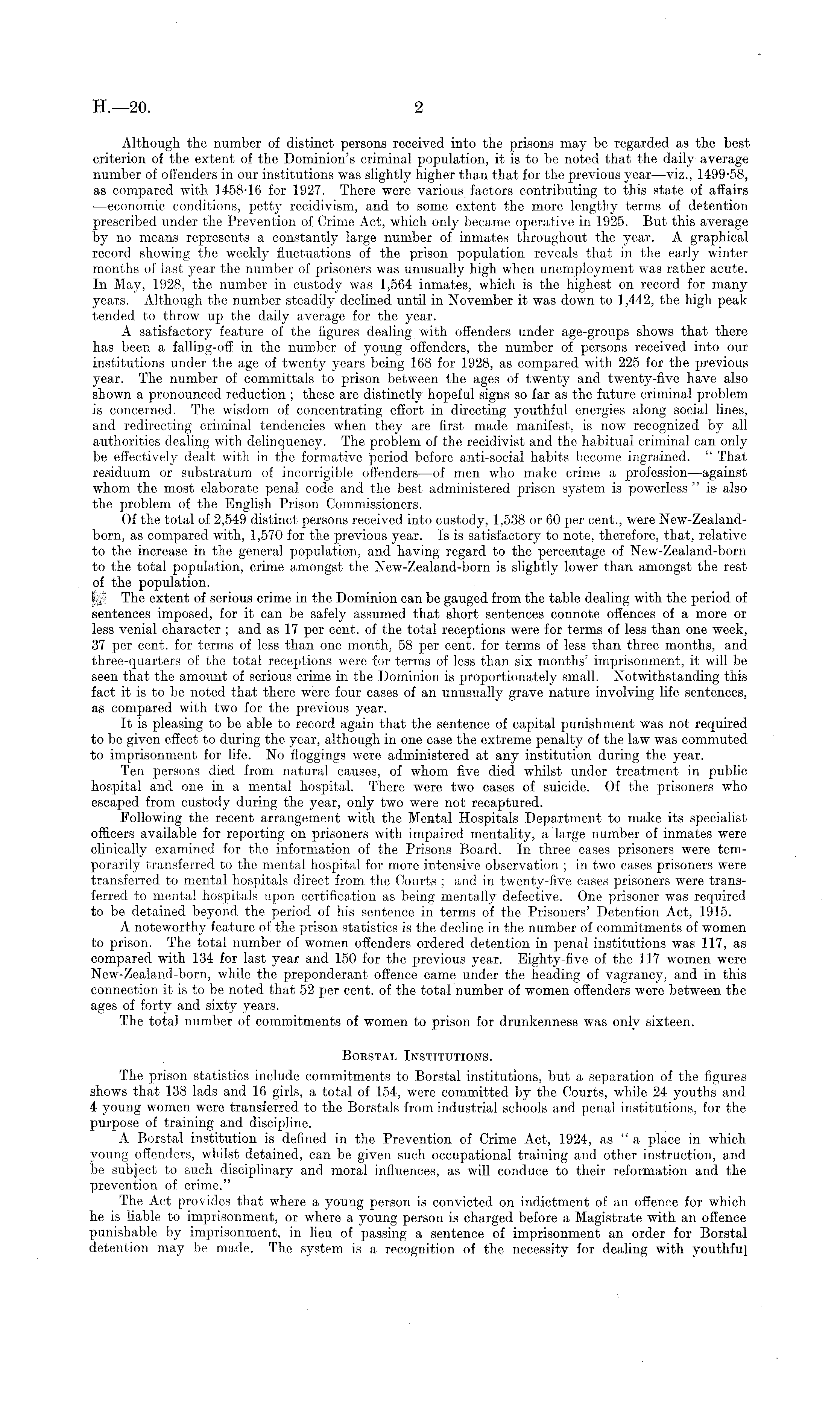 Although, the number of distinct persons received into the prisons may be regarded as the best criterion of the extent of the Dominion's criminal population, it is to be noted that the daily average number of offenders in our institutions was slightly higher than that for the previous year—viz., 1499-58, as compared with 1458-16 for 1927. There were various factors contributing to this state of affairs —economic conditions, petty recidivism, and to some extent the more lengthy terms of detention prescribed under the Prevention of Crime Act, which only became operative in 1925. But this average by no means represents a constantly large number of inmates throughout the year. A graphical record showing the weekly fluctuations of the prison population reveals that in the early winter months of last year the number of prisoners was unusually high when unemployment was rather acute. In May, 1928, the number in custody was 1,564 inmates, which is the highest on record for many years. Although the number steadily declined until in November it was down to 1,442, the high peak tended to throw up the daily average for the year. A satisfactory feature of the figures dealing with offenders under age-groups shows that there has been a falling-off in the number of young offenders, the number of persons received into our institutions under the age of twenty years being 168 for 1928, as compared with 225 for the previous year. The number of committals to prison between the ages of twenty and twenty-five have also shown a pronounced reduction ; these are distinctly hopeful signs so far as the future criminal problem is concerned. The wisdom of concentrating effort in directing youthful energies along social lines, and redirecting criminal tendencies when they are first made manifest, is now recognized by all authorities dealing with delinquency. The problem of the recidivist and the habitual criminal can only be effectively dealt with in the formative period before anti-social habits become ingrained. " That residuum or substratum of incorrigible offenders—of men who make crime a profession —against whom the most elaborate penal code and the best administered prison system is powerless " is- also the problem of the English Prison Commissioners. Of the total of 2,549 distinct persons received into custody, 1,538 or 60 per cent., were New-Zealand-born, as compared with, 1,570 for the previous year. Is is satisfactory to note, therefore, that, relative to the increase in the general population, and having regard to the percentage of New-Zealand-born to the total population, crime amongst the New-Zealand-born is slightly lower than amongst the rest of the population. jf|? The extent of serious crime in the Dominion can be gauged from the table dealing with the period of sentences imposed, for it can be safely assumed that short sentences connote offences of a more or less venial character ; and as 17 per cent, of the total receptions were for terms of less than one week, 37 per cent, for terms of less than one month, 58 per cent, for terms of less than three months, and three-quarters of the total receptions were for terms of less than six months' imprisonment, it will be seen that the amount of serious crime in the Dominion is proportionately small. Notwithstanding this fact it is to be noted that there were four cases of an unusually grave nature involving life sentences, as compared with two for the previous year. It is pleasing to be able to record again that the sentence of capital punishment was not required to be given effect to during the year, although in one case the extreme penalty of the law was commuted to imprisonment for life. No floggings were administered at any institution during the year. Ten persons died from natural causes, of whom five died whilst under treatment in public hospital and one in a mental hospital. There were two cases of suicide. Of the prisoners who escaped from custody during the year, only two were not recaptured. Following the recent arrangement with the Mental Hospitals Department to make its specialist officers available for reporting on prisoners with impaired mentality, a large number of inmates were clinically examined for the information of the Prisons Board. In three cases prisoners were temporarily transferred to the mental hospital for more intensive observation ; in two cases prisoners were transferred to mental hospitals direct from the Courts ; and in twenty-five oases prisoners were transferred to mental hospitals upon certification as being mentally defective. One prisoner was required to be detained beyond the period of his sentence in terms of the Prisoners' Detention Act, 1915. A noteworthy feature of the prison statistics is the decline in the number of commitments of women to prison. The total number of women offenders ordered detention in penal institutions was 117, as compared with 134 for last year and 150 for the previous year. Eighty-five of the 117 women were New-Zealand-born, while the preponderant offence came under the heading of vagrancy, and in this connection it is to be noted that 52 per cent, of the total number of women offenders were between the ages of forty and sixty years. The total number of commitments of women to prison for drunkenness was only sixteen. Borstal Institutions. The prison statistics include commitments to Borstal institutions, but a separation of the figures shows that 138 lads and 16 girls, a total of 154, were committed by the Courts, while 24 youths and 4 young women were transferred to the Borstals from industrial schools and penal institutions, for the purpose of training and discipline. A Borstal institution is defined in the Prevention of Crime Act, 1924, as " a place in which young offenders, whilst detained, can be given such occupational training and other instruction, and be subject to such disciplinary and moral influences, as will conduce to their reformation and the prevention of crime." The Ac