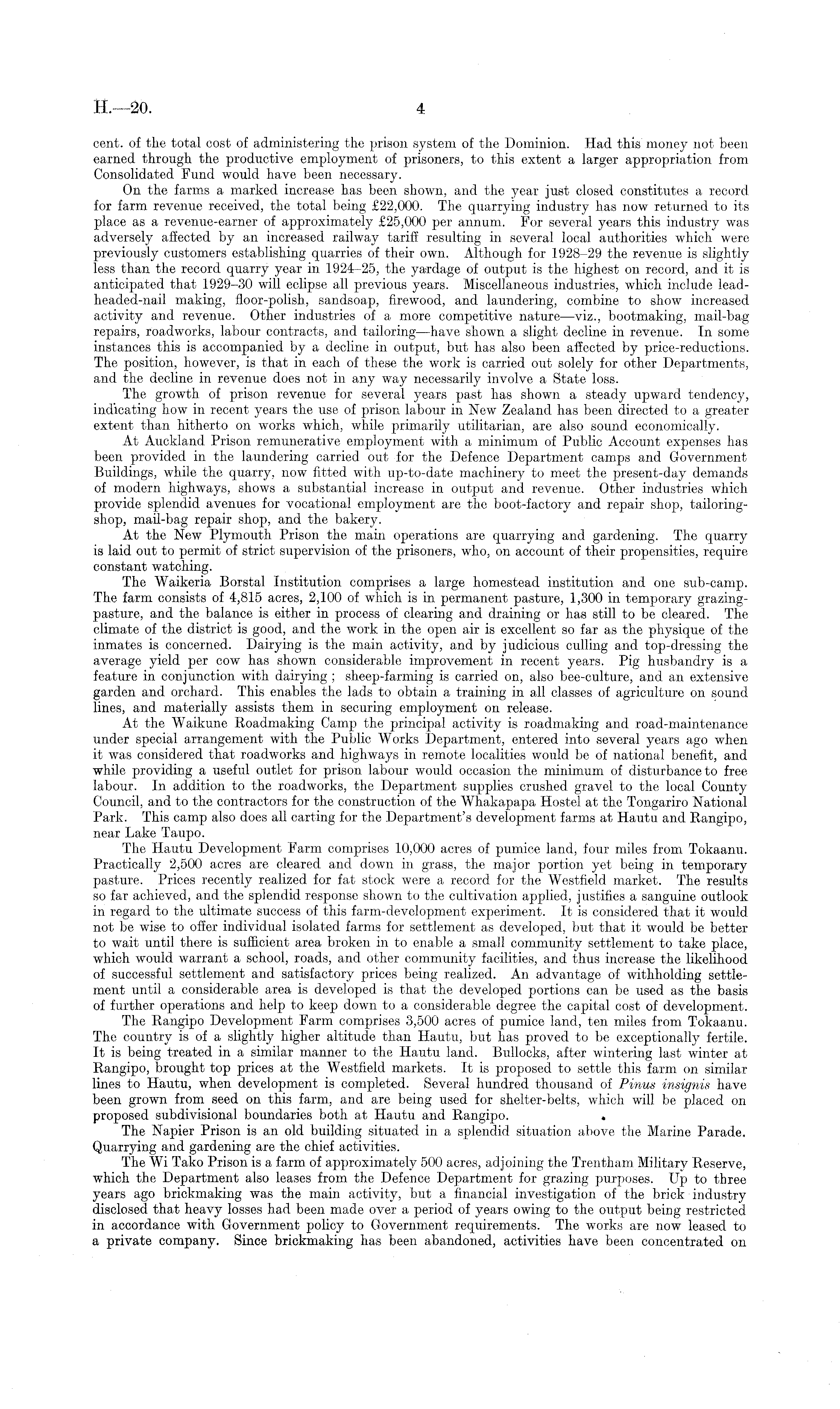 cent, of the total cost of administering the prison system of the Dominion. Had this money not been earned through the productive employment of prisoners, to this extent a larger appropriation from Consolidated Fund would have been necessary. On the farms a marked increase has been shown, and the year just closed constitutes a record for farm revenue received, the total being £22,000. The quarrying industry has now returned to its place as a revenue-earner of approximately £25,000 per annum. For several years this industry was adversely affected by an increased railway tariff resulting in several local authorities which were previously customers establishing quarries of their own. Although for 1928-29 the revenue is slightly less than the record quarry year in 1924-25, the yardage of output is the highest on record, and it is anticipated that 1929-30 will eclipse all previous years. Miscellaneous industries, which include lead-headed-nail making, floor-polish, sandsoap, firewood, and laundering, combine to show increased activity and revenue. Other industries of a more competitive nature —viz., bootmaking, mail-bag repairs, roadworks, labour contracts, and tailoring—have shown a slight decline in revenue. In some instances this is accompanied by a decline in output, but lias also been affected by price-reductions. The position, however, is that in each of these the work is carried out solely for other Departments, and the decline in revenue does not in any way necessarily involve a State loss. The growth of prison revenue for several years past has shown a steady upward tendency, indicating how in recent years the use of prison labour in New Zealand has been directed to a greater extent than hitherto on works which, while primarily utilitarian, are also sound economically. At Auckland Prison remunerative employment with a minimum of Public Account expenses has been provided in the laundering carried out for the Defence Department camps and Government Buildings, while the quarry, now fitted with up-to-date machinery to meet the present-day demands of modern highways, shows a substantial increase in output and revenue. Other industries which provide splendid avenues for vocational employment are the boot-factory and repair shop, tailoringshop, mail-bag repair shop, and the bakery. At the New Plymouth Prison the main operations are quarrying and gardening. The quarry is laid out to permit of strict supervision of the prisoners, who, on account of their propensities, require constant watching. The Waikeria Borstal Institution comprises a large homestead institution and one sub-camp. The farm consists of 4,815 acres, 2,100 of which is in permanent pasture, 1,300 in temporary grazingpasture, and the balance is either in process of clearing and draining or has still to be cleared. The climate of the district is good, and the work in the open air is excellent so far as the physique of the inmates is concerned. Dairying is the main activity, and by judicious culling and top-dressing the average yield per cow has shown considerable improvement in recent years. Pig husbandry is a feature in conjunction with dairying ; sheep-farming is carried on, also bee-culture, and an extensive garden and orchard. This enables the lads to obtain a training in all classes of agriculture on sound lines, and materially assists them in securing employment on release. At the Waikune Roadmaking Camp the principal activity is roadmaking and road-maintenance under special arrangement with the Public Works Department, entered into several years ago when it was considered that roadworks and highways in remote localities would be of national benefit, and while providing a useful outlet for prison labour would occasion the minimum of disturbance to free labour. In addition to the roadworks, the Department supplies crushed gravel to the local County Council, and to the contractors for the construction of the Whakapapa Hostel at the Tongariro National Park. This camp also does all carting for the Department's development farms at Hautu and Rangipo, near Lake Taupo. The Hautu Development Farm comprises 10,000 acres of pumice land, four miles from Tokaanu. Practically 2,500 acres are cleared and down in grass, the major portion yet being in temporary pasture. Prices recently realized for fat stock were a record for the Westfield market. The results so far achieved, and the splendid response shown to the cultivation applied, justifies a sanguine outlook in regard to the ultimate success of this farm-development experiment. It is considered that it would not be wise to offer individual isolated farms for settlement as developed, but that it would be better to wait until there is sufficient area broken in to enable a small community settlement to take place, which would warrant a school, roads, and other community facilities, and thus increase the likelihood of successful settlement and satisfactory prices being realized. An advantage of withholding settlement until a considerable area is developed is that the developed portions can be used as the basis of further operations and help to keep down to a considerable degree the capital cost of development. The Rangipo Development Farm comprises 3,500 acres of pumice land, ten miles from Tokaanu. The country is of a slightly higher altitude than Hautu, but has proved to be exceptionally fertile. It is being treated in a similar manner to the Hautu land. Bullocks, after wintering last winter at Rangipo, brought top prices at the Westfield markets. It is proposed to settle this farm on similar lines to Hautu, when development is completed. Several hundred thousand of Pinus insignis have been grown from seed on this farm, and are being used for shelter-belts, which will be placed on proposed subdivisional boundaries both at Hautu and Rangipo. » The Napier Prison is an old building situated in a splendid situation above the Marine Parade. Quarrying and gardening are the chief activ