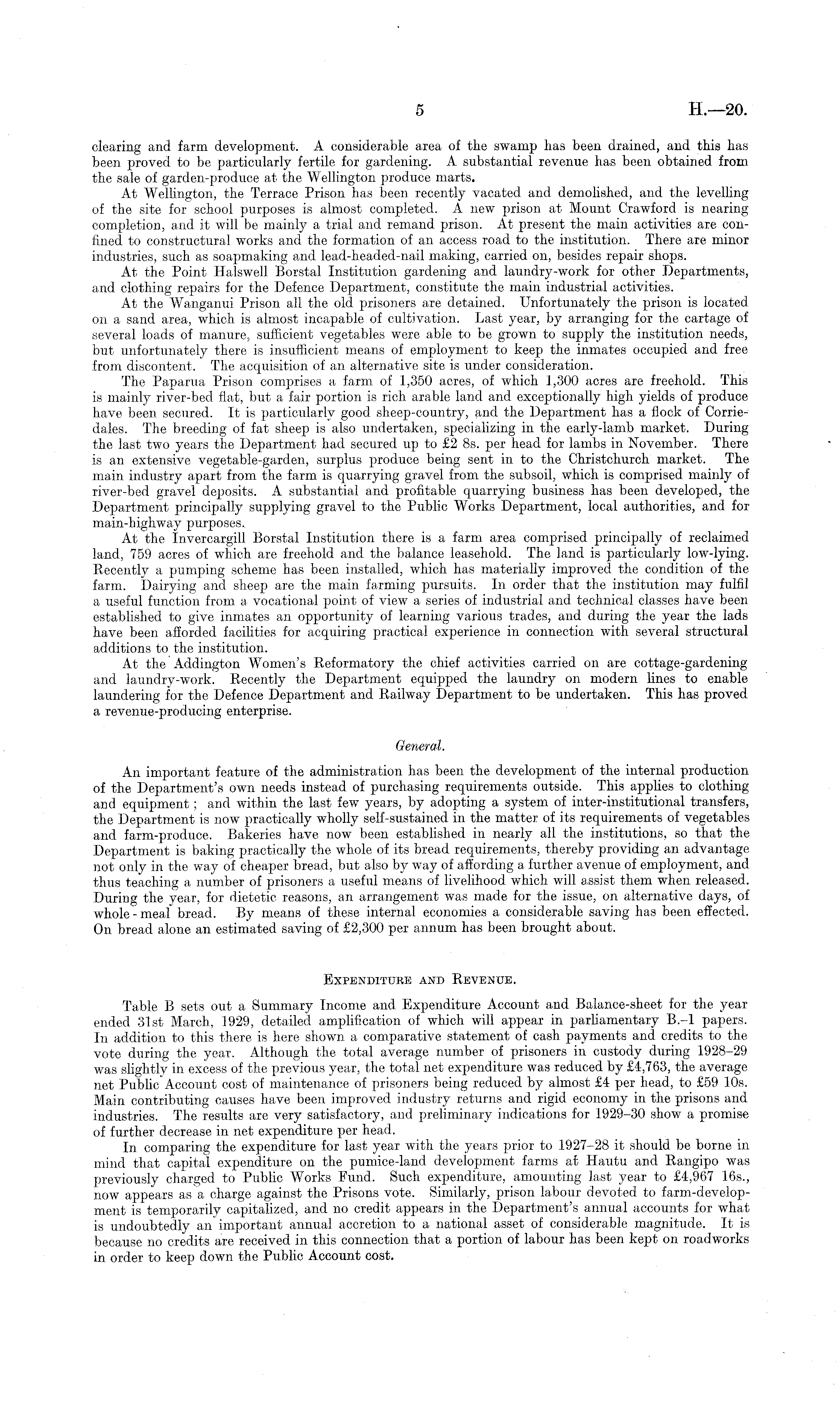 clearing and farm development. A considerable area of tlie swamp has been drained, and this has been proved to be particularly fertile for gardening. A substantial revenue has been obtained from the sale of garden-produce at the Wellington produce marts. At Wellington, the Terrace Prison has been recently vacated and demolished, and the levelling of the site for school purposes is almost completed. A new prison at Mount Crawford is nearing completion, and it will be mainly a trial and remand prison. At present the main activities are confined to constructural works and the formation of an access road to the institution. There are minor industries, such as soapmaking and lead-headed-nail making, carried on, besides repair shops. At the Point Halswell Borstal Institution gardening and laundry-work for other Departments, and clothing repairs for the Defence Department, constitute the main industrial activities. At the Wanganui Prison all the old prisoners are detained. Unfortunately the prison is located on a sand area, which is almost incapable of cultivation. Last year, by arranging for the cartage of several loads of manure, sufficient vegetables were able to be grown to supply the institution needs, but unfortunately there is insufficient means of employment to keep the inmates occupied and free from discontent. The acquisition of an alternative site is under consideration. The Paparua Prison comprises a farm of 1,350 acres, of which 1,300 acres are freehold. This is mainly river-bed flat, but a fair portion is rich arable land and exceptionally high yields of produce have been secured. It is particularly good sheep-country, and the Department has a flock of Corriedales. The breeding of fat sheep is also undertaken, specializing in the early-lamb market. During the last two years the Department had secured up to £2 Bs. per head for lambs in November. There is an extensive vegetable-garden, surplus produce being sent in to the Christchurch market. The main industry apart from the farm is quarrying gravel from the subsoil, which is comprised mainly of river-bed gravel deposits. A substantial and profitable quarrying business has been developed, the Department principally supplying gravel to the Public Works Department, local authorities, and for main-highway purposes.. At the Invercargill Borstal Institution there is a farm area comprised principally of reclaimed land, 759 acres of which are freehold and the balance leasehold. The land is particularly low-lying. Recently a pumping scheme has been installed, which has materially improved the condition of the farm. Dairying and sheep are the main farming pursuits. In order that the institution may fulfil a useful function from a vocational point of view a series of industrial and technical classes have been established to give inmates an opportunity of learning various trades, and during the year the lads have been afforded facilities for acquiring practical experience in connection with several structural additions to the institution. At the Addington Women's Reformatory the chief activities carried on are cottage-gardening and laundry-work. Recently the Department equipped the laundry on modern lines to enable laundering for the Defence Department and Railway Department to be undertaken. This has proved a revenue-producing enterprise. General. An important feature of the administration has been the development of the internal production of the Department's own needs instead of purchasing requirements outside. This applies to clothing and equipment; and within the last few years, by adopting a system of inter-institutional transfers, the Department is now practically wholly self-sustained in the matter of its requirements of vegetables and farm-produce. Bakeries have now been established in nearly all the institutions, so that the Department is baking practically the whole of its bread requirements, thereby providing an advantage not only in the way of cheaper bread, but also by way of affording a further avenue of employment, and thus teaching a number of prisoners a useful means of livelihood which will assist them when released. During the year, for dietetic reasons, an arrangement was made for the issue, on alternative days, of whole - meal bread. By means of these internal economies a considerable saving has been effected. On bread alone an estimated saving of £2,300 per annum has been brought about. Expenditure and Revenue. Table B sets out a Summary Income and Expenditure Account and Balance-sheet for the year ended 31st March, 1929, detailed amplification of which will appear in parliamentary B. l papers. In addition to this there is here shown a comparative statement of cash payments and credits to the vote during the year. Although the total average number of prisoners in custody during 1928-29 was slightly in excess of the previous year, the total net expenditure was reduced by £4,763, the average net Public' Account cost of maintenance of prisoners being reduced by almost £4 per head, to £59 10s. Main contributing causes have been improved industry returns and rigid economy in the prisons and industries. The results are very satisfactory, and preliminary indications for 1929-30 show a promise of further decrease in net expenditure per head. In comparing the expenditure for last year with the years prior to 1927-28 it should be borne in mind that capital expenditure on the pumice-land development farms at Hautu and Rangipo was previously charged to Public Works Eund. Such expenditure, amounting last year to £4,967 165., now appears as a charge against the Prisons vote. Similarly, prison labour devoted to farm-develop-ment is temporarily capitalized, and no credit appears in the Department's annual accounts for what is undoubtedly an" important annual accretion to a national asset of considerable magnitude. It is because no credits are received in this connection that a portion of labour has been kept on roadworks in order 