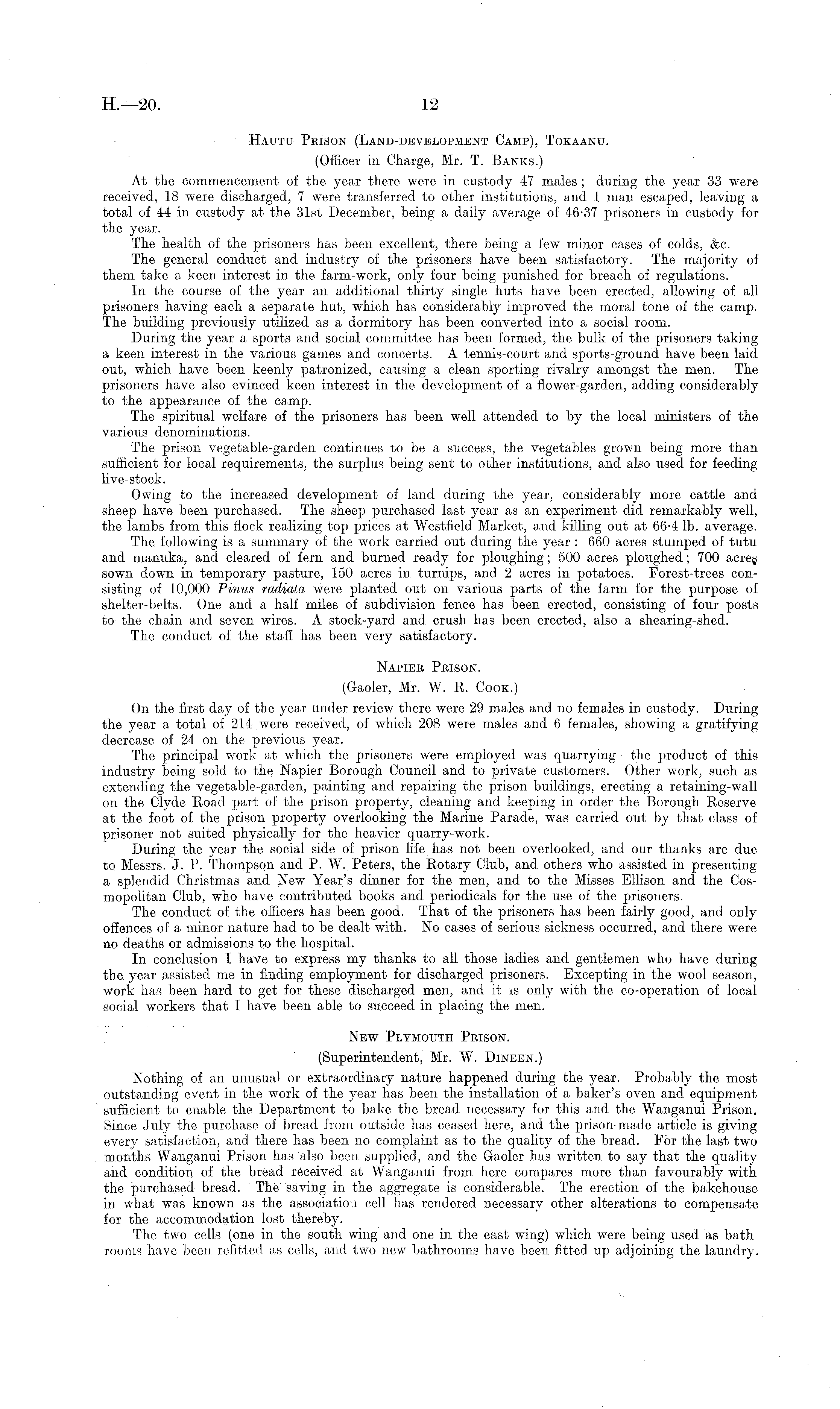 Hautu Prison (Land-development Camp), Tokaanu. (Officer in Charge, Mr. T. Banks.) At the commencement of the year there were in custody 47 males ; during the year 33 were received, 18 were discharged, 7 were transferred to other institutions, and 1 man escaped, leaving a total of 44 in custody at the 31st December, being a daily average of 46-37 prisoners in custody for the year. The health of the prisoners has been excellent, there being a few minor cases of colds, &c. The general conduct and industry of the prisoners have been satisfactory. The majority of them take a keen interest in the farm-work, only four being punished for breach of regulations. In the course of the year an additional thirty single huts have been erected, allowing of all prisoners having each a separate hut, which has considerably improved the moral tone of the camp. The building previously utilized as a dormitory has been converted into a social room. During the year a sports and social committee has been formed, the bulk of the prisoners taking a keen interest in the various games and concerts. A tennis-court and sports-ground have been laid out, which have been keenly patronized, causing a clean sporting rivalry amongst the men. The prisoners have also evinced keen interest in the development of a flower-garden, adding considerably to the appearance of the camp. The spiritual welfare of the prisoners has been well attended to by the local ministers of the various denominations. The prison vegetable-garden continues to be a success, the vegetables grown being more than sufficient for local requirements, the surplus being sent to other institutions, and also used for feeding live-stock. Owing to the increased development of land during the year, considerably more cattle and sheep have been purchased. The sheep purchased last year as an experiment did remarkably well, the lambs from this flock realizing top prices at Westfield Market, and killing out at 66-4 lb. average. The following is a summary of the work carried out during the year : 660 acres stumped of tutu and manuka, and cleared of fern and burned ready for ploughing; 500 acres ploughed; 700 acres sown down in temporary pasture, 150 acres in turnips, and 2 acres in potatoes. Forest-trees consisting of 10,000 Pinus radiata were planted out on various parts of the farm for the purpose of shelter-belts. One and a half miles of subdivision fence has been erected, consisting of four posts to the chain and seven wires. A stock-yard and crush has been erected, also a shearing-shed. The conduct of the staff has been very satisfactory. Napier Prison. (Gaoler, Mr. W. R. Cook.) On the first day of the year under review there were 29 males and no females in custody. During the year a total of 214 were received, of which 208 were males and 6 females, showing a gratifying decrease of 24 on the previous year. The principal work at which the prisoners were employed was quarrying—the product of this industry being sold to the Napier Borough Council and to private customers. Other work, such as extending the vegetable-garden, painting and repairing the prison buildings, erecting a retaining-wall on the Clyde Road part of the prison property, cleaning and keeping in order the Borough Reserve at the foot of the prison property overlooking the Marine Parade, was carried out by that class of prisoner not suited physically for the heavier quarry-work. During the year the social side of prison life has not been overlooked, and our thanks are due to Messrs. J. P. Thompson and P. W. Peters, the Rotary Club, and others who assisted in presenting a splendid Christmas and New Year's dinner for the men, and to the Misses Ellison and the Cosmopolitan Club, who have contributed books and periodicals for the use of the prisoners. The conduct of the officers has been good. That of the prisoners has been fairly good, and only offences of a minor nature had to be dealt with. No cases of serious sickness occurred, and there were no deaths or admissions to the hospital. In conclusion I have to express my thanks to all those ladies and gentlemen who have during the year assisted me in finding employment for discharged prisoners. Excepting in the wool season, work has been hard to get for these discharged men, and it is only with the co-operation of local social workers that I have been able to succeed in placing the men. New Plymouth Prison. (Superintendent, Mr. W. Dineen.) Nothing of an unusual or extraordinary nature happened during the year. Probably the most outstanding event in the work of the year has been the installation of a baker's oven and equipment sufficient to enable the Department to bake the bread necessary for this and the Wanganui Prison. Since July the purchase of bread from outside has ceased here, and the prison-made article is giving every satisfaction, and there has been no complaint as to the quality of the bread. For the last two months Wanganui Prison has also been supplied, and the Gaoler has written to say that the quality and condition of the bread received at Wanganui from here compares more than favourably with the purchased bread. The saving in the aggregate is considerable. The erection of the bakehouse in what was known as the association cell has rendered necessary other alterations to compensate for the accommodation lost thereby. The two cells (one in the south wing and one in the east wing) which were being used as bath rooms have been refitted as cells, and two new bathrooms have been fitted up adjoining the laundry.