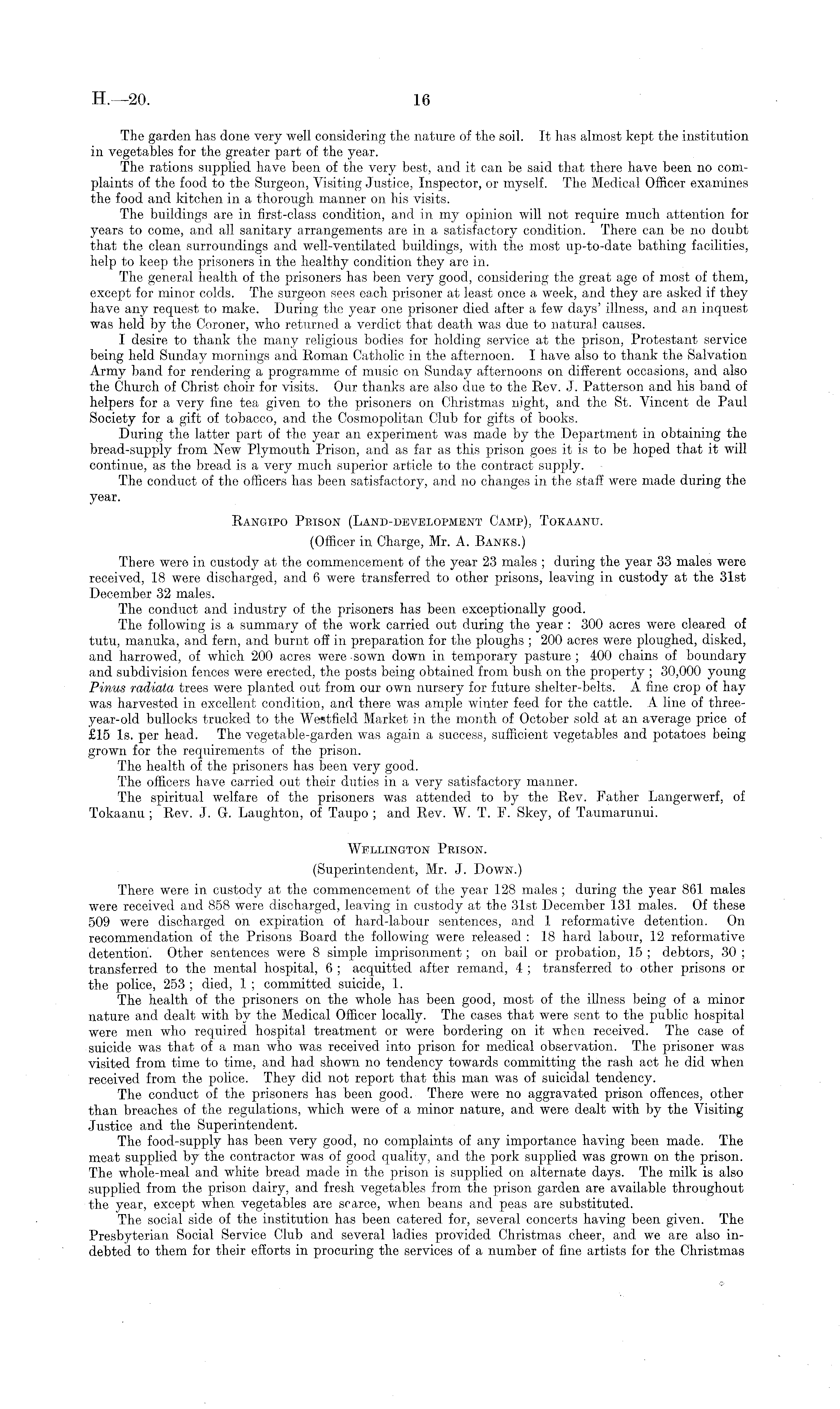The garden has done very well considering the nature of the soil. It has almost kept the institution in vegetables lor the greater part of the year. The rations supplied have been of the very best, and it can be said that there have been no complaints of the food to the Surgeon, Visiting Justice, Inspector, or myself. The Medical Officer examines the food and kitchen in a thorough manner on his visits. The buildings are in first-class condition, and in my opinion will not require much attention for years to come, and all sanitary arrangements are in a satisfactory condition. There can be no doubt that the clean surroundings and well-ventilated buildings, with the most up-to-date bathing facilities, help to keep the prisoners in the healthy condition they are in. The general health of the prisoners has been very good, considering the great age of most of them, except for minor colds. The surgeon sees each prisoner at least once a week, and they are asked if they have any request to make. During the year one prisoner died after a few days' illness, and an inquest was held by the Coroner, who returned a verdict that death was due to natural causes. I desire to thank the many religious bodies for holding service at the prison, Protestant service being held Sunday mornings and Roman Catholic in the afternoon. I have also to thank the Salvation Army band for rendering a programme of music on Sunday afternoons on different occasions, and also the Church of Christ choir for visits. Our thanks are also due to the Rev. J. Patterson and his band of helpers for a very fine tea given to the prisoners on Christmas night, and the St. Vincent de Paul Society for a gift of tobacco, and the Cosmopolitan Club for gifts of books. During the latter part of the year an experiment was made by the Department in obtaining the bread-supply from New Plymouth Prison, and as far as this prison goes it is to be hoped that it will continue, as the bread is a very much superior article to the contract supjtly. The conduct of the officers has been satisfactory, and no changes in the staff were made during the year. Rangipo Prison (Land-development Camp), Tokaanu. (Officer in Charge, Mr. A. Banks.) There were in custody at the commencement of the year 23 males ; during the year 33 males were received, 18 were discharged, and 6 were transferred to other prisons, leaving in custody at the 31st December 32 males. The conduct and industry of the prisoners has been exceptionally good. The following is a summary of the work carried out during the year : 300 acres were cleared of tutu, manuka, and fern, and burnt off in preparation for the ploughs ; 200 acres were ploughed, disked, and harrowed, of which 200 acres were-sown down in temporary pasture; 400 chains of boundary and subdivision fences were erected, the posts being obtained from bush on the property ; 30,000 young Pinus radiata trees were planted out from our own nursery for future shelter-belts. A fine crop of hay was harvested in excellent condition, and there was ample winter feed for the cattle. A line of three-year-old bullocks trucked to the Westfield Market in the month of October sold at an average price of £15 Is. per head. The vegetable-garden was again a success, sufficient vegetables and potatoes being grown for the requirements of the prison. The health of the prisoners has been very good. The officers have carried out their duties in a very satisfactory manner. The spiritual welfare of the prisoners was attended to by the Rev. Father Langerwerf, of Tokaanu ; Rev. J. G. Laughton, of Taupo ; and Rev. W. T. F. Skey, of Taumarunui. Wellington Prison. (Superintendent, Mr. J. Down.) There were in custody at the commencement of the year 128 males ; during the year 861 males were received and 858 were discharged, leaving in custody at the 31st December 131 males. Of these 509 were discharged on expiration of hard-labour sentences, and 1 reformative detention. On recommendation of the Prisons Board the following were released : 18 hard labour, 12 reformative detention. Other sentences were 8 simple imprisonment; on bail or probation, 15 ; debtors, 30 ; transferred to the mental hospital, 6 ; acquitted after remand, 4 ; transferred to other prisons or the police, 253 ; died, 1 ; committed suicide, 1. The health of the prisoners on the whole has been good, most of the illness being of a minor nature and dealt with by the Medical Officer locally. The cases that were sent to the public hospital were men who required hospital treatment or were bordering on it when received. The case of suicide was that of a man who was received into prison for medical observation. The prisoner was visited from time to time, and had shown no tendency towards committing the rash act he did when received from the police. They did not report that this man was of suicidal tendency. The conduct of the prisoners has been good. There were no aggravated prison offences, other than breaches of the regulations, which were of a minor nature, and were dealt with by the Visiting Justice and the Superintendent. The food-supply has been very good, no complaints of any importance having been made. The meat supplied by the contractor was of good quality, and the pork supplied was grown on the prison. The whole-meal and white bread made in the prison is supplied on alternate days. The milk is also supplied from the prison dairy, and fresh vegetables from the prison garden are available throughout the year, except when vegetables are scarce, when beans and peas are substituted. The social side of the institution has been catered for, several concerts having been given. The Presbyterian Social Service Club and several ladies provided Christmas cheer, and we are also indebted to them for their efforts in procuring the services of a number of fine artists for the Christmas